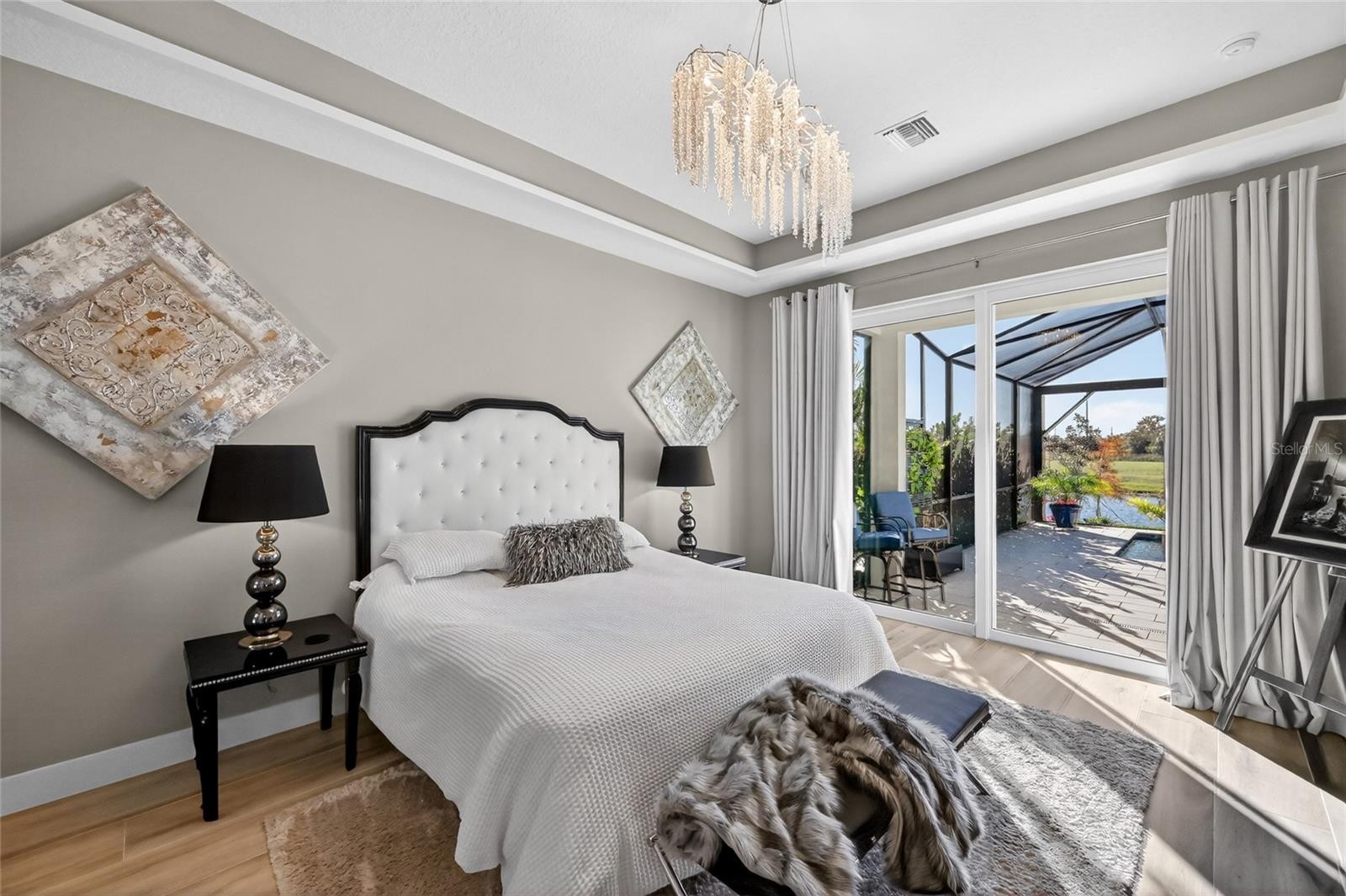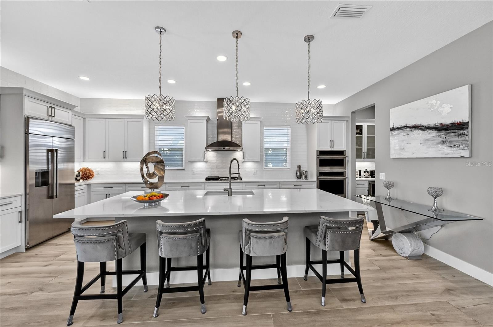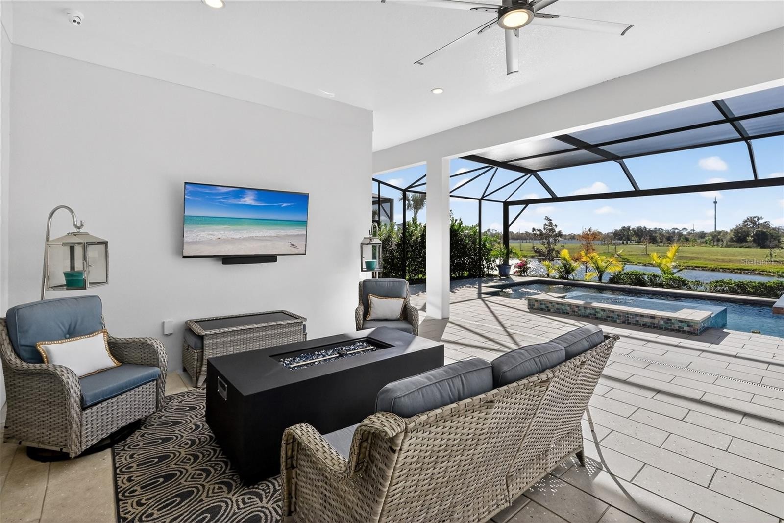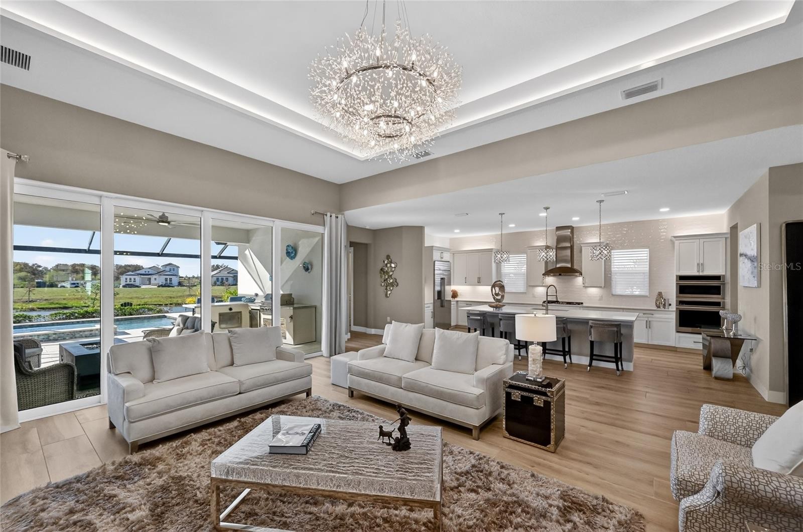 Opportunity to bypass the build process and start living a life well deserved in one of Lakewood Ranch’s newest communities from this beautifully appointed West Indies Islander plan built 2025 by Homes by Towne on a south-facing lake front setting in Shellstone at Waterside. The three bedroom plus study residence showcases 2,675 square feet of open one-story living, sumptuous wide wood-plank style porcelain tile throughout, voluminous tray ceilings with recessed accent lighting, IMPACT windows and doors, and a breathtaking outdoor living area with open and under cover space, shellstone pavered deck, newly added Summer kitchen and bar, PebbleTec heated saltwater pool/spa with sunshelf, and a panoramic clearview screen surrounded by premium landscaping and vistas. Seamlessly connecting this outdoor oasis to the oversized great room, kitchen and dining areas are impact glass doors revealing an optimal layout where guests and chefs alike will delight in the gourmet kitchen with GE Monogram appliances, sprawling counters, oversized island, dry bar with wine fridge, under cabinet lighting, a customized walk-in pantry, and stylish crisp white tile adorns the backsplash all the way up to the ceiling. Unwind in the elegant owner’s retreat offering direct lanai access via sliding glass doors, oversized customized closet, and a refreshingly luxuriant bath with two vanity stations, invigorating shower and separate water closet. Family and guests will be right at home in this split bedroom floor plan with two additional guest suites each on separate wings of the home, both offering customized walk-in closets and wood plank porcelain tile flooring, with one boasting its own private ensuite full bath, the other is just off the homes third full bath. Additionally, the residence offers a study behind double glass entry doors, and wood plank tile flooring. Other highlights of this all-encompassing 3,987 square foot residence includes a large laundry room with cabinetry and sink, the recent addition of remote-controlled window shades, show-stopper light fixtures, customized closets throughout, camera surveillance, 8’ interior doors, and an oversized three car garage with epoxy flooring and built-in storage cabinetry. Beckoning a lifestyle fulfilled with access to two resort-styled amenity centers, Shellstone residents will have private access to the soon-to-be completed Summit offering a social hall, fitness center, pool with cabanas, spa, firepit, poolside BBQ grills, and fitness lawn. Additionally, they can enjoy the recently completed hub at Midway Park that offers Shellstone and Wild Blue residents tennis, pickleball, basketball courts, kayak launch, walking trails, dog parks, playground, pro shop, and pavilions. Ideally located in Waterside, known for its vibrant Lakewood Ranch lifestyle surrounded by dining, shopping, polo, golf, community events, Waterside Place, Centerpointe, UTC Mall, and minutes to SRQ Airport and the beaches of Sarasota.