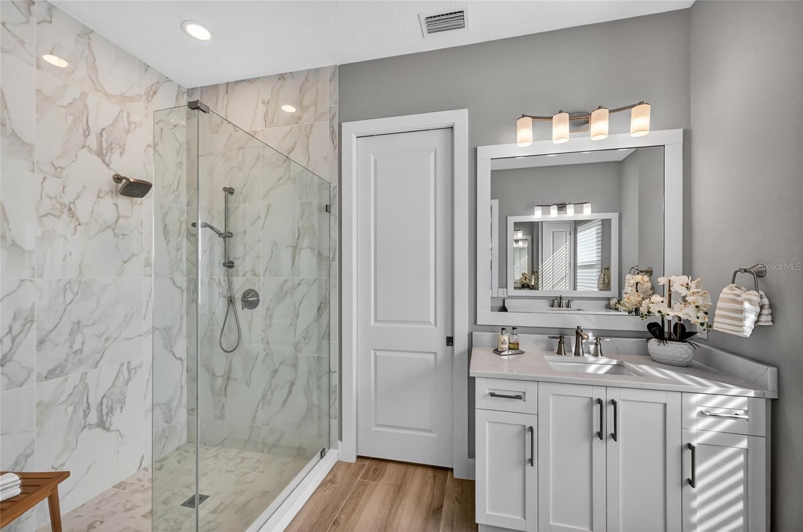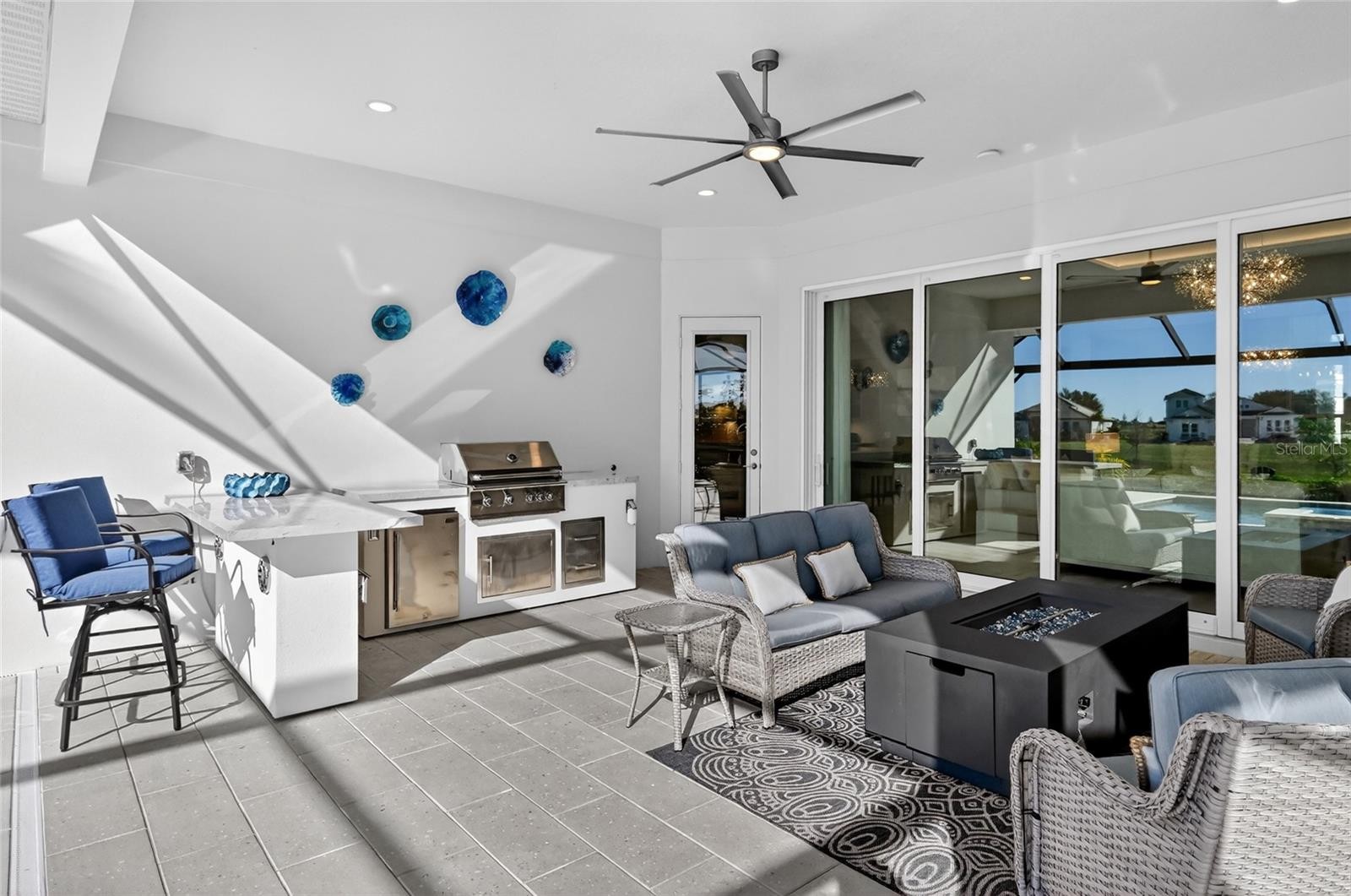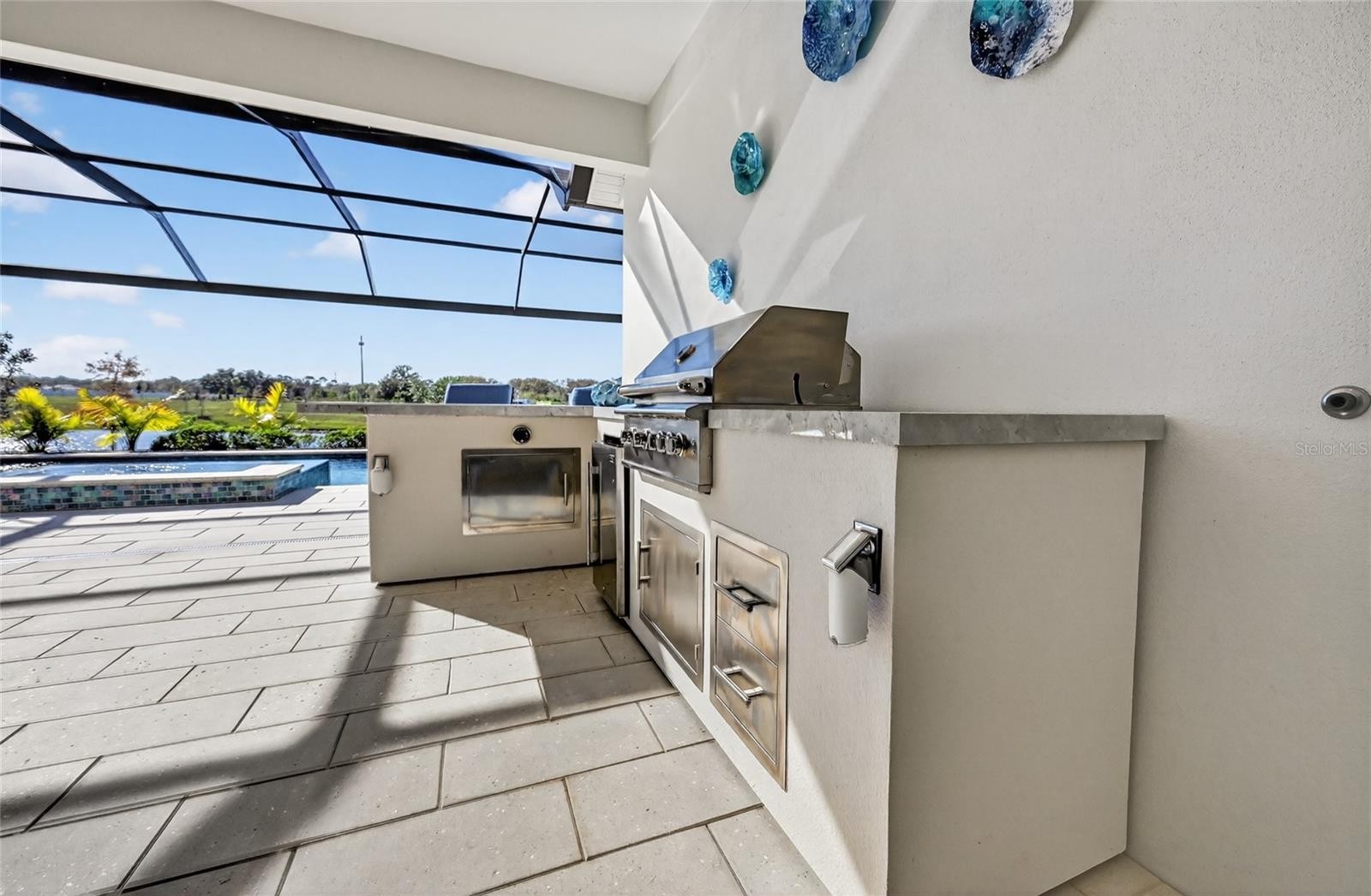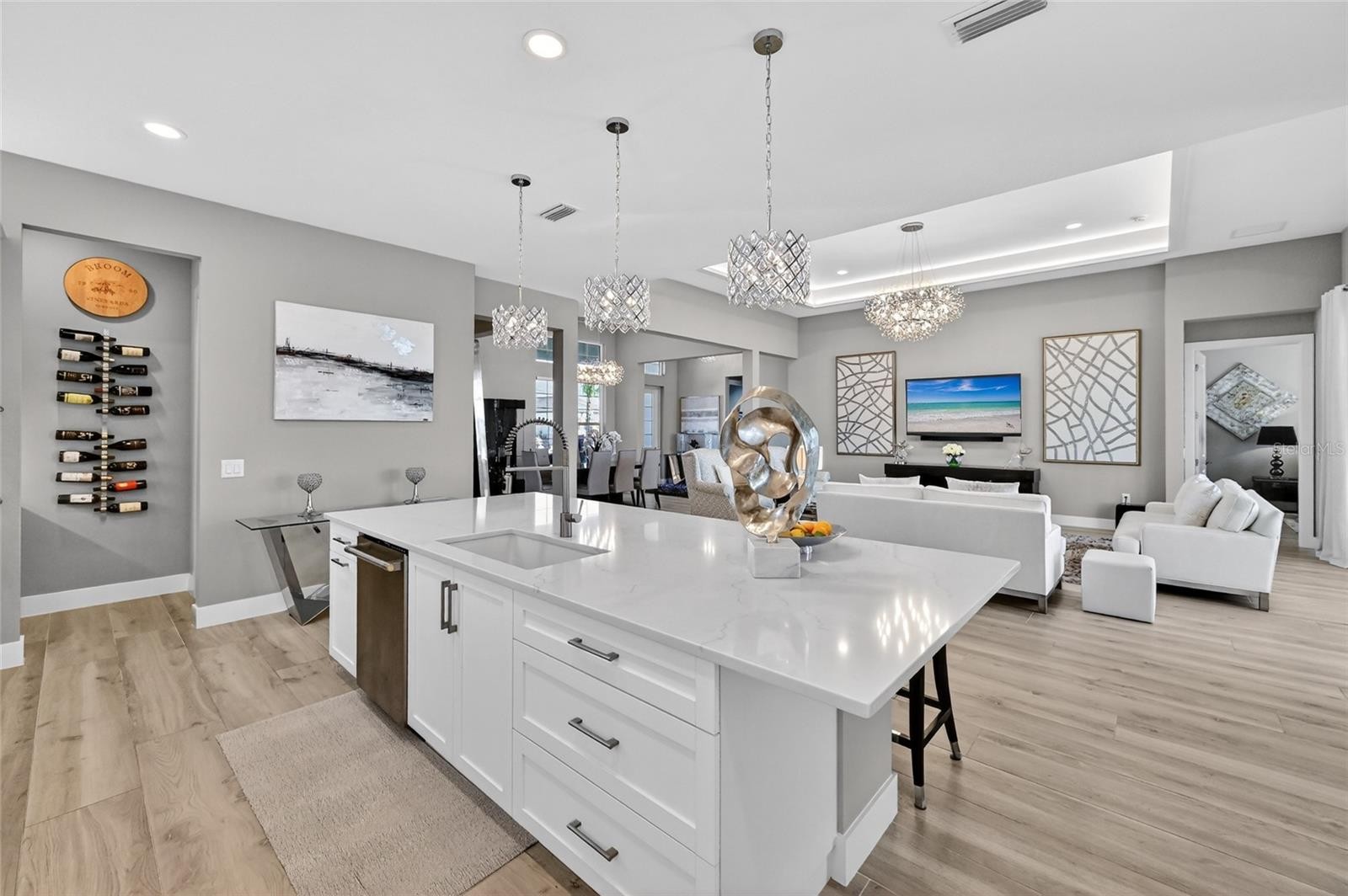 Opportunity to bypass the build process and start living a life well deserved in one of Lakewood Ranch’s newest communities from this beautifully appointed West Indies Islander plan built 2025 by Homes by Towne on a south-facing lake front setting in Shellstone at Waterside. The three bedroom plus study residence showcases 2,675 square feet of open one-story living, sumptuous wide wood-plank style porcelain tile throughout, voluminous tray ceilings with recessed accent lighting, IMPACT windows and doors, and a breathtaking outdoor living area with open and under cover space, shellstone pavered deck, newly added Summer kitchen and bar, PebbleTec heated saltwater pool/spa with sunshelf, and a panoramic clearview screen surrounded by premium landscaping and vistas. Seamlessly connecting this outdoor oasis to the oversized great room, kitchen and dining areas are impact glass doors revealing an optimal layout where guests and chefs alike will delight in the gourmet kitchen with GE Monogram appliances, sprawling counters, oversized island, dry bar with wine fridge, under cabinet lighting, a customized walk-in pantry, and stylish crisp white tile adorns the backsplash all the way up to the ceiling. Unwind in the elegant owner’s retreat offering direct lanai access via sliding glass doors, oversized customized closet, and a refreshingly luxuriant bath with two vanity stations, invigorating shower and separate water closet. Family and guests will be right at home in this split bedroom floor plan with two additional guest suites each on separate wings of the home, both offering customized walk-in closets and wood plank porcelain tile flooring, with one boasting its own private ensuite full bath, the other is just off the homes third full bath. Additionally, the residence offers a study behind double glass entry doors, and wood plank tile flooring. Other highlights of this all-encompassing 3,987 square foot residence includes a large laundry room with cabinetry and sink, the recent addition of remote-controlled window shades, show-stopper light fixtures, customized closets throughout, camera surveillance, 8’ interior doors, and an oversized three car garage with epoxy flooring and built-in storage cabinetry. Beckoning a lifestyle fulfilled with access to two resort-styled amenity centers, Shellstone residents will have private access to the soon-to-be completed Summit offering a social hall, fitness center, pool with cabanas, spa, firepit, poolside BBQ grills, and fitness lawn. Additionally, they can enjoy the recently completed hub at Midway Park that offers Shellstone and Wild Blue residents tennis, pickleball, basketball courts, kayak launch, walking trails, dog parks, playground, pro shop, and pavilions. Ideally located in Waterside, known for its vibrant Lakewood Ranch lifestyle surrounded by dining, shopping, polo, golf, community events, Waterside Place, Centerpointe, UTC Mall, and minutes to SRQ Airport and the beaches of Sarasota.