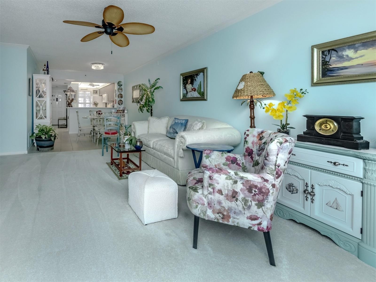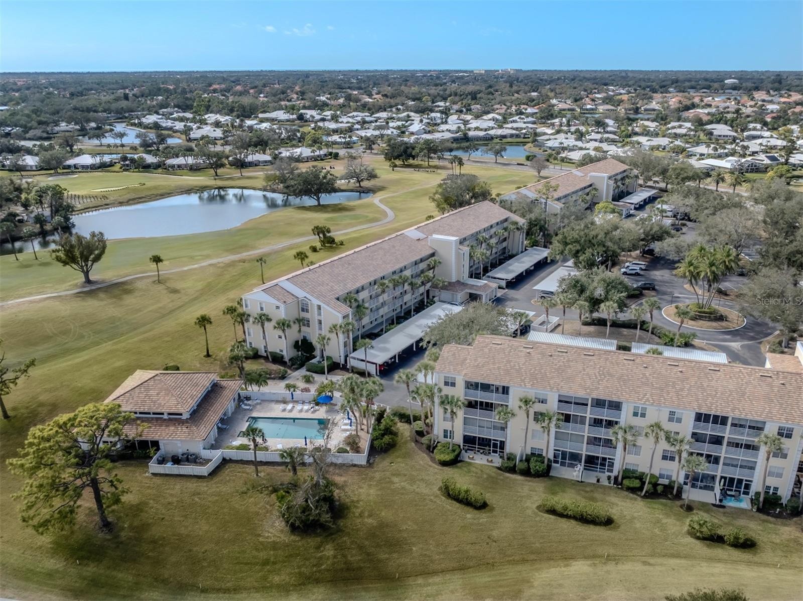 If your priorities include convenience, comfort, safety, and affordability; you are home. This stunning FIRST FLOOR condo is steps from your covered parking. No need to drag your groceries into a stuffy elevator. Enjoy expansive golf course views of the 9th tee of the Bobcat Course from your enclosed lanai or outside on your private landscaped patio. Mature landscaping, trees and a lake create a peaceful environment for your relaxation. This sturdy block constructed building has a 2022 roof, fresh paint, full sprinkler protection and has been replumbed. Located in a desirable flood zone “X-500”. This is a non-smoking building. This furnished, 2 bedroom, 2 bathroom home with coastal style décor lives big. Enjoy golf course views from the expansive kitchen, defined dining area, living room, enclosed lanai and owner’s suite. Great natural light provides a delightful environment. Crown molding adds a touch of elegance. The indoor laundry adds convenience. The provided furniture (with a few exceptions) surrounds you in tasteful comfort. Move right in! Enjoy the community heated pool, showers, clubhouse, library, BBQ and picnic areas. Membership to the Plantation Golf & CC is an available option for an additional fee. The affordable quarterly association fees provide for strong reserves for building, roads, roof, elevators, carports and already include the master assoc. fees, water and sewer. Enjoy the convenience of living minutes to shopping, I75, restaurants and beaches. Come see this dream come true today.