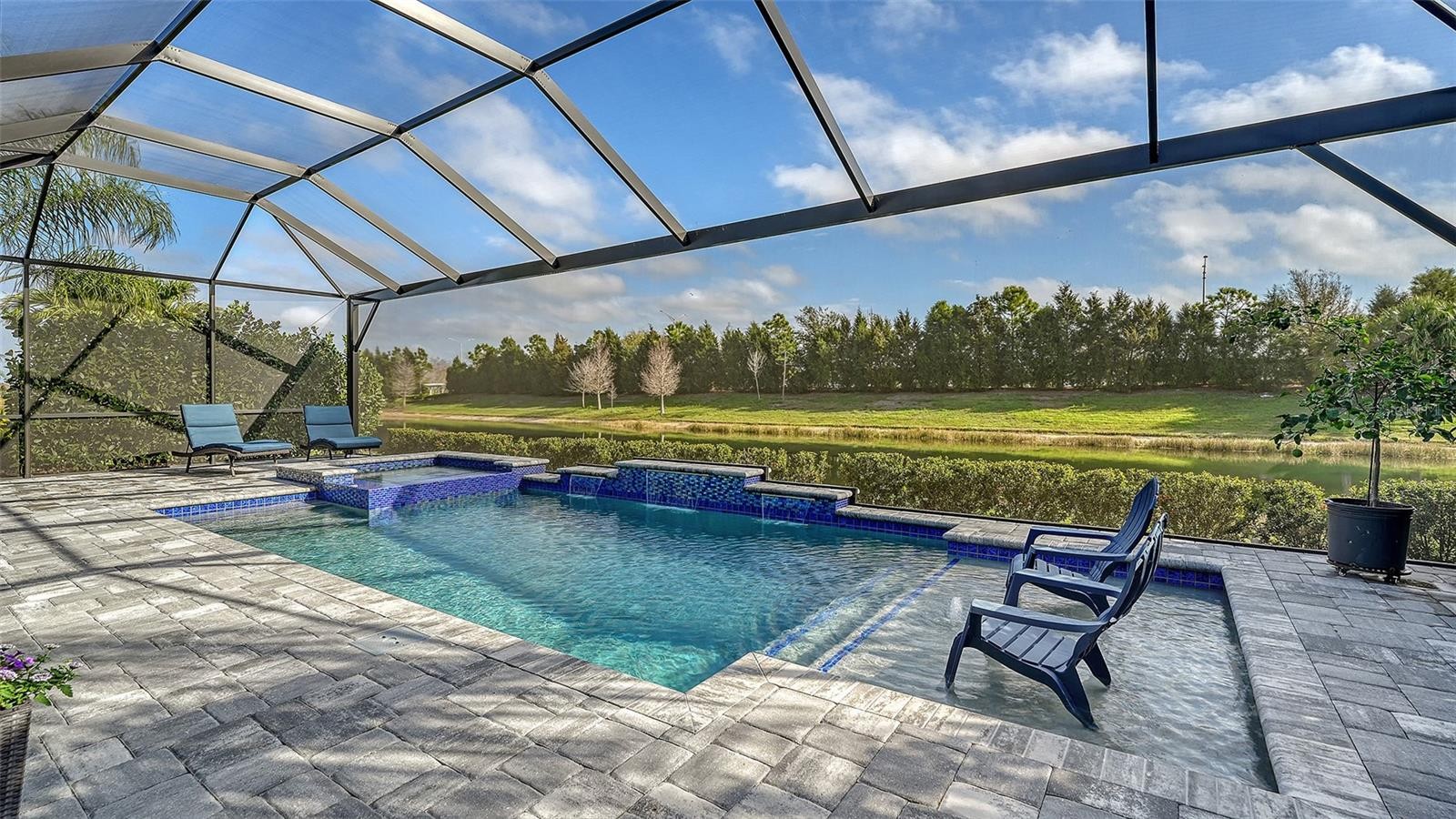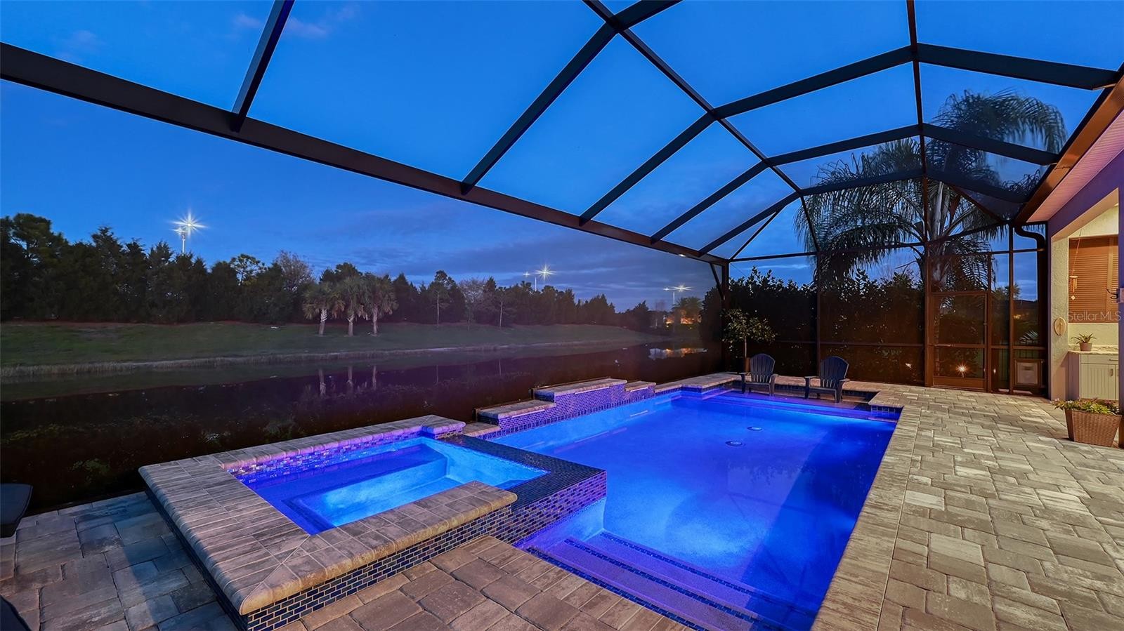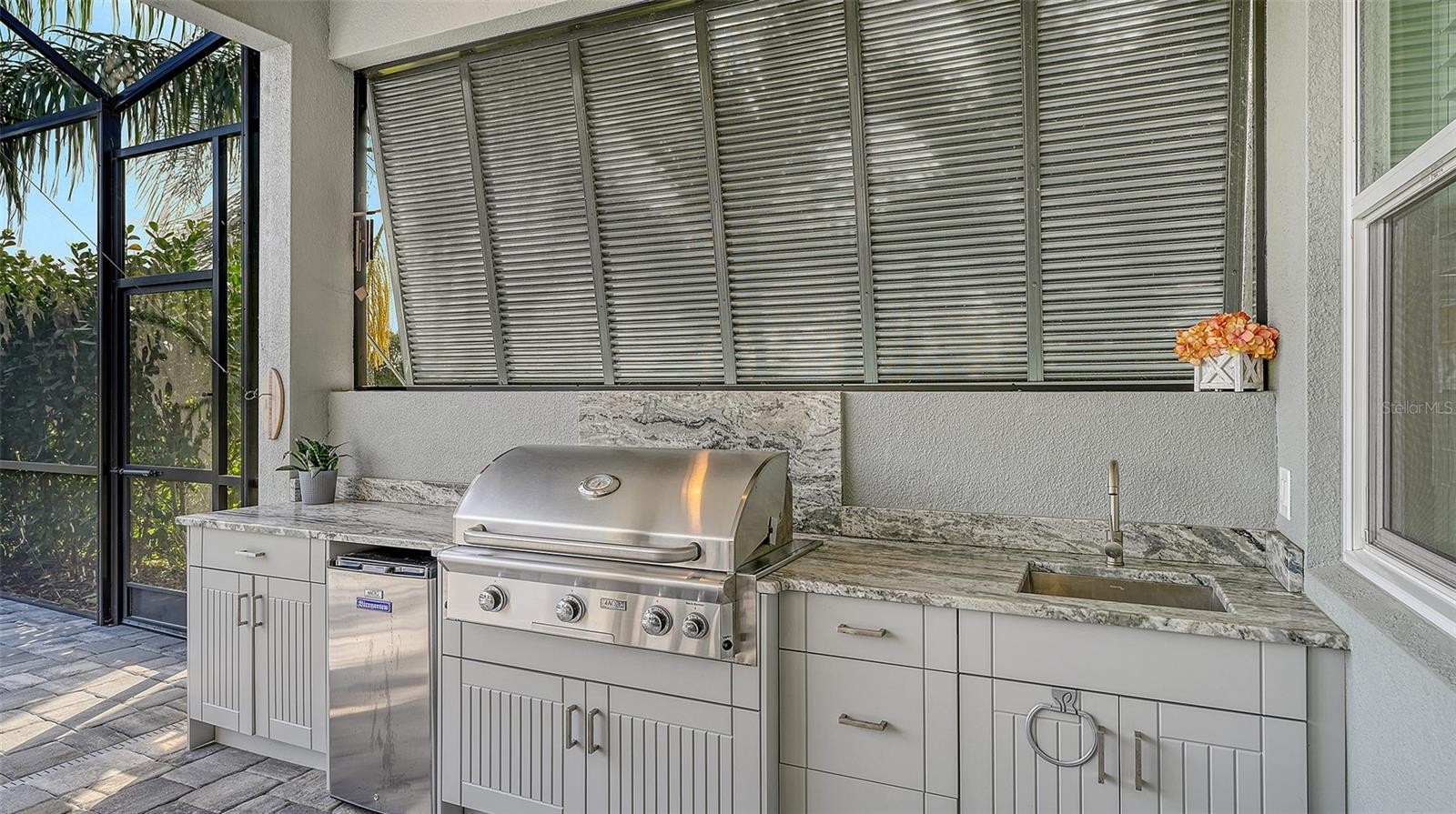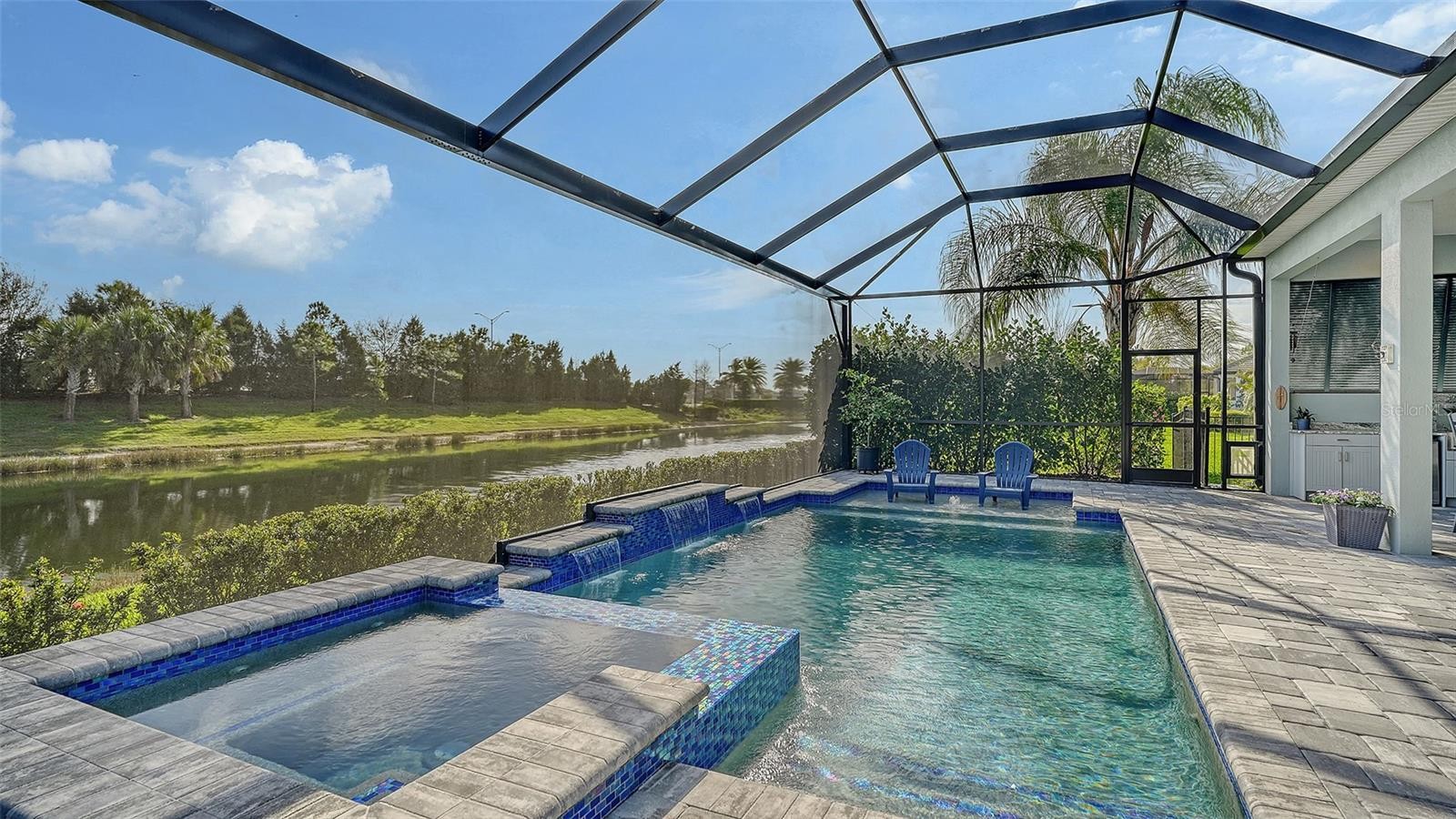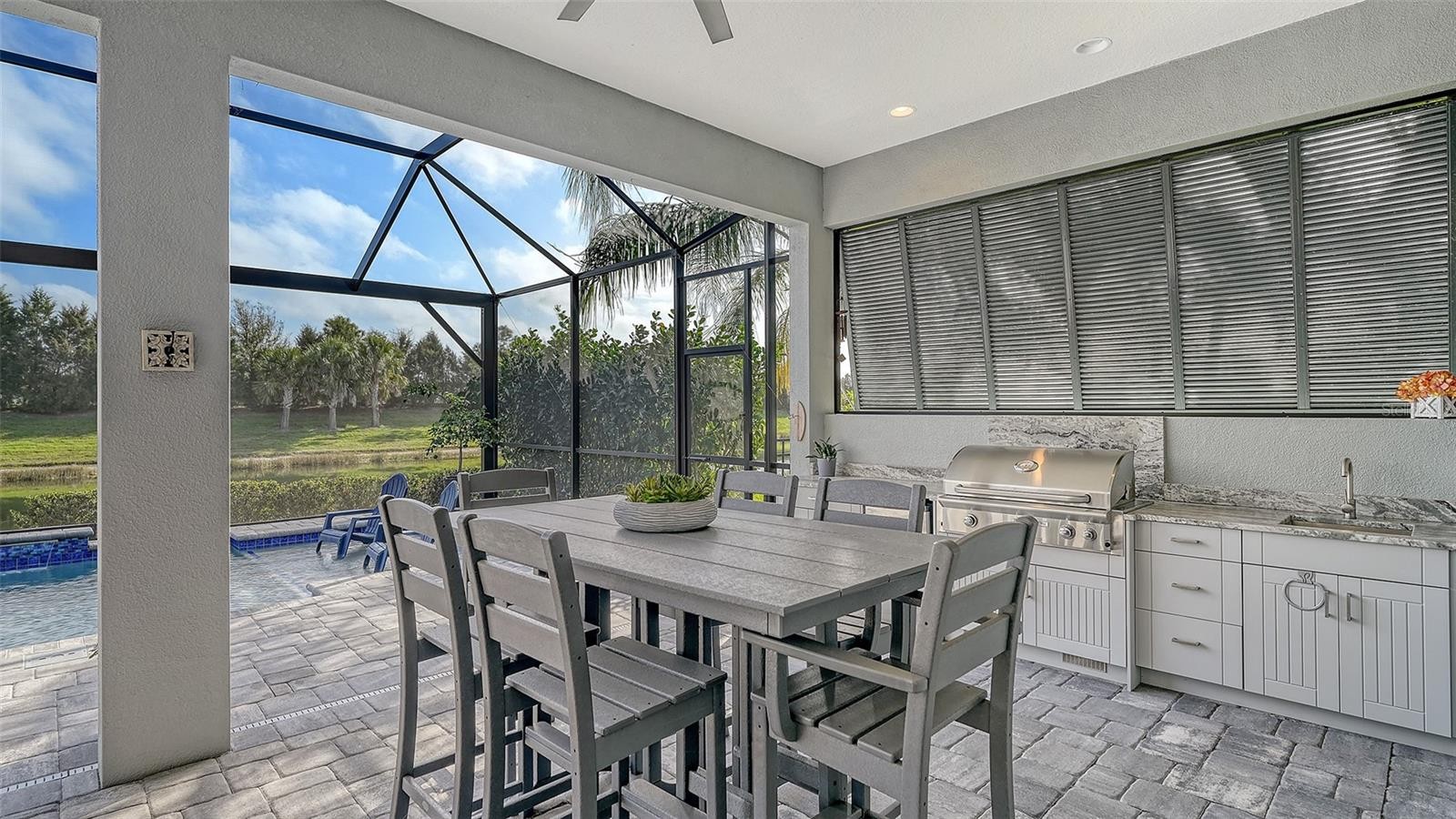 This tastefully designed Weatherly floor plan offers 3 full bedrooms, a dedicated office/study, and a versatile flex space ideal for a second bonus room or den, all thoughtfully arranged to maximize both function and style. The home’s beautiful water view sets the tone for the fully upgraded outdoor living space, where a caged-in lanai with panoramic screening and concrete pavers creates a polished backdrop for everyday enjoyment and entertaining. The resort-style pool and spa with three waterfalls and a sun shelf bring a true luxury feel outdoors, while the premium outdoor kitchen with AOG grill, refrigerator, sink, custom powder-coated hurricane shutter, outdoor ceiling fans, fenced dog run, and redesigned front and rear landscaping make the exterior just as impressive as the interior. Inside, the home continues with a long list of elevated finishes and custom details, including a gourmet kitchen with gas cooktop, range hood, stainless GE appliances, quartz countertops, an oversized peninsula bartop that seats 6, an oversized island with extra storage, soft-close cabinetry, and a butler’s pantry complete with a wine fridge and 36-bottle wine rack. Plantation shutters throughout, impact glass windows and doors, electric shades on the rear sliding doors, vaulted ceilings, tray ceilings, upgraded light fixtures and chandeliers, and quartz countertops throughout add both style and substance. The entry makes a strong first impression with a custom floating cabinet and designer mirror feature wall, while the living room is anchored by a dramatic 100-inch fireplace with mirrored feature wall. The flex space is further enhanced by a wood accent ceiling, and the owner’s suite offers two walk-in closets, private lanai access, a tray ceiling, and an ensuite bath with dual vanities and a step-in shower. A well-equipped laundry room with utility sink and cabinets adds convenience, and thoughtful extras like a Ring camera complete the home. Located in LakeHouse Cove at Waterside in Lakewood Ranch, residents enjoy access to a state-of-the-art community center, fitness center, resort-style pool, pickleball courts, bocce ball, a dog park, playground, kayak launch and storage, and lifestyle programming through the community’s lifestyle director. LakeHouse Cove is part of Waterside, Lakewood Ranch’s first village in Sarasota County, with convenient access to Waterside Place, where residents can enjoy dining, shopping, events, trails, green space, and waterfront gathering areas. Its central location also puts you just a short drive from Sarasota-Bradenton International Airport (SRQ), with convenient access to Tampa International Airport (TPA) for additional domestic and international travel options. University Town Center’s shopping, dining, and everyday conveniences are nearby, and some of the area’s most sought-after Gulf Coast destinations, including Sarasota and Bradenton beaches, are easily within reach. The location also offers convenient access to several area private school options, including The Out-of-Door Academy’s Lakewood Ranch campus, Saint Stephen’s in Bradenton, and Cardinal Mooney High School in Sarasota.