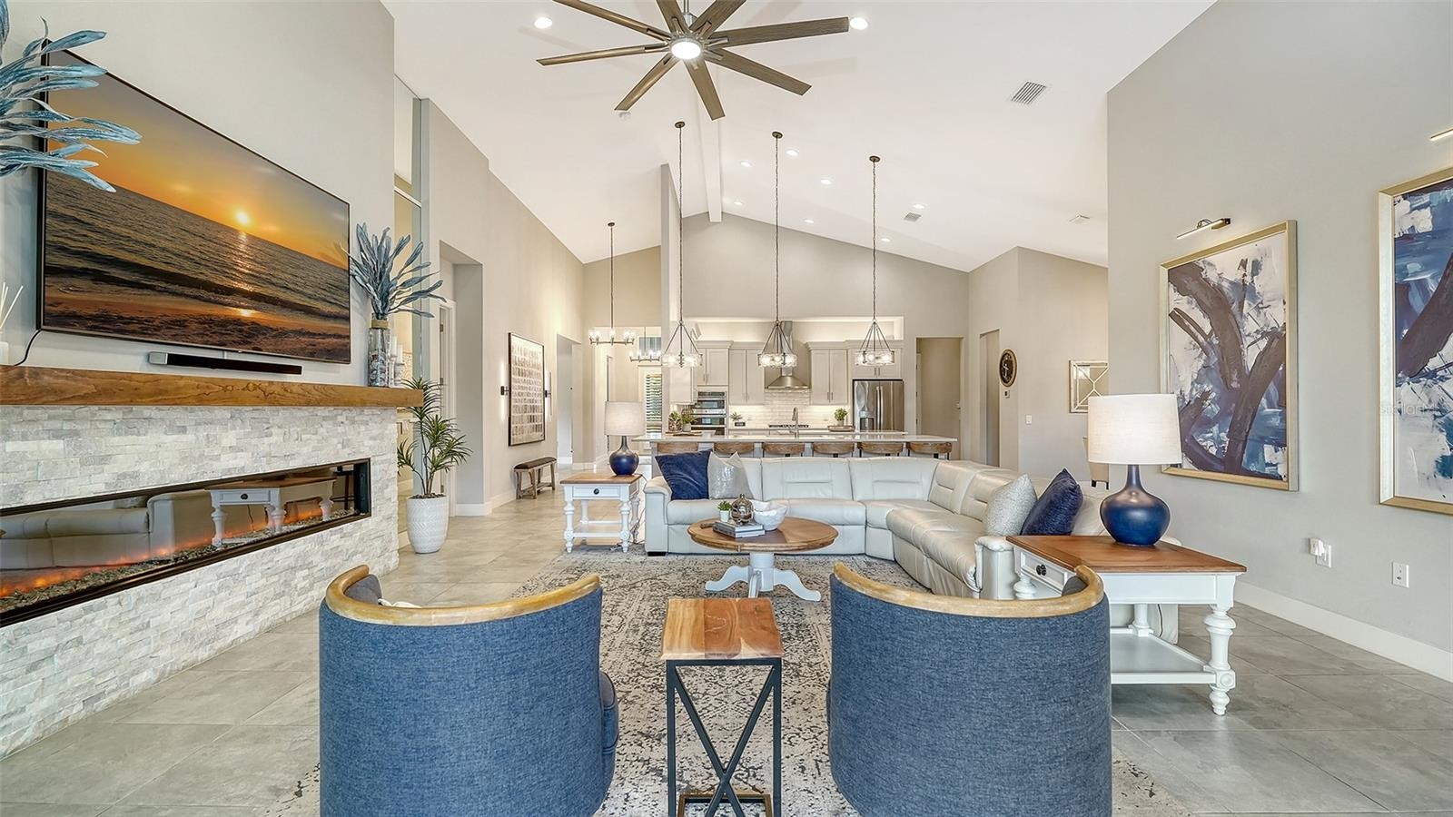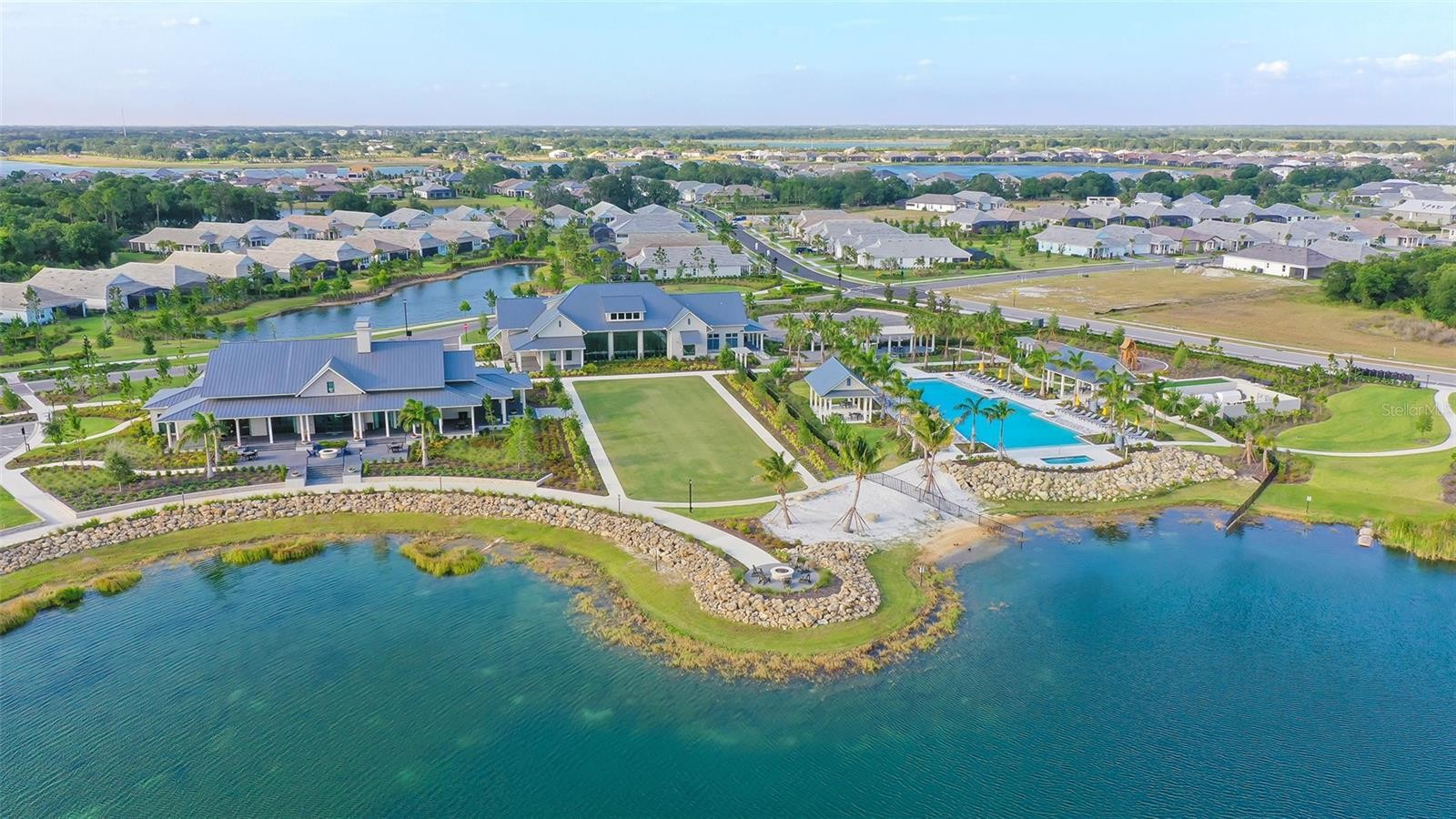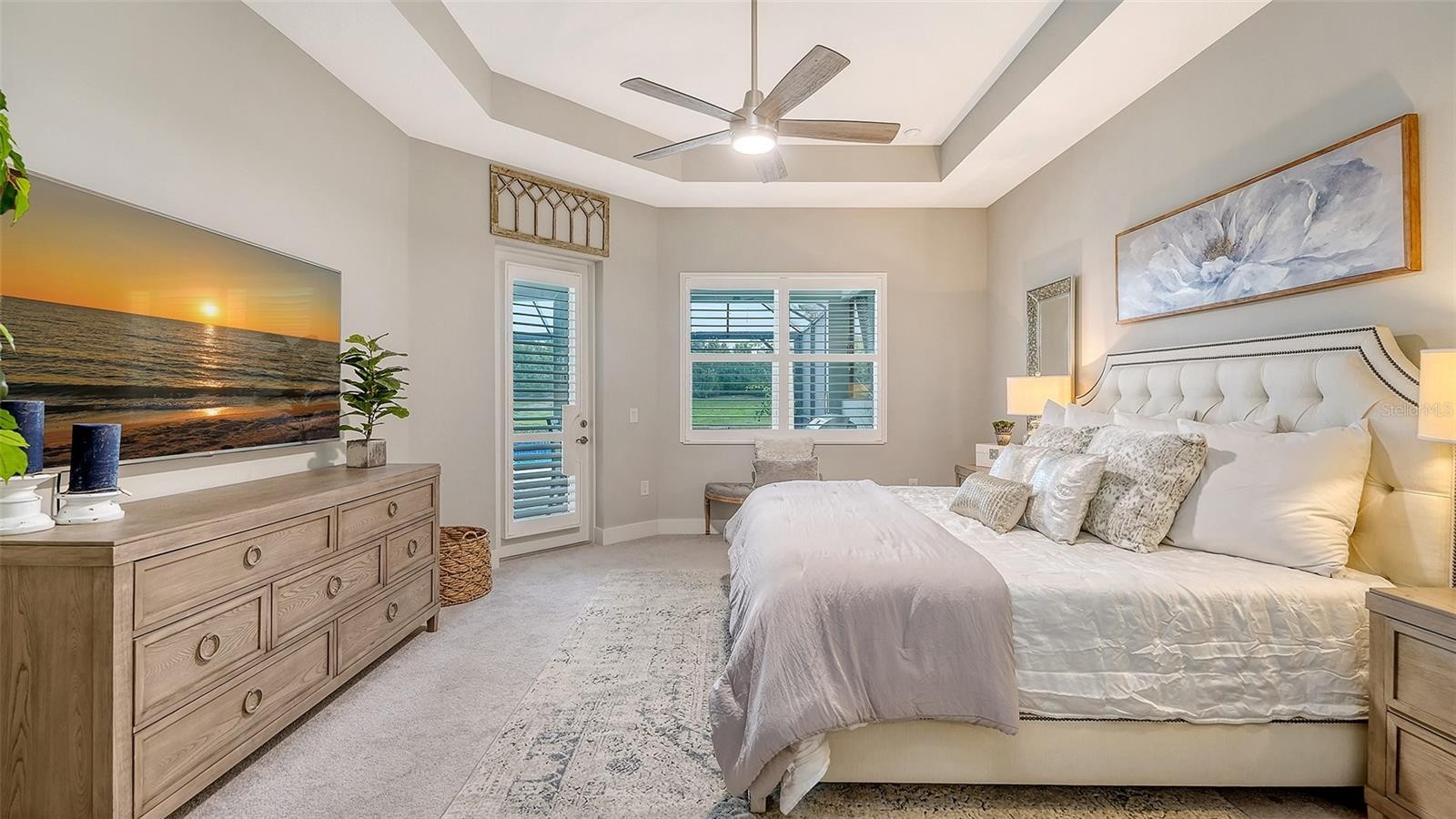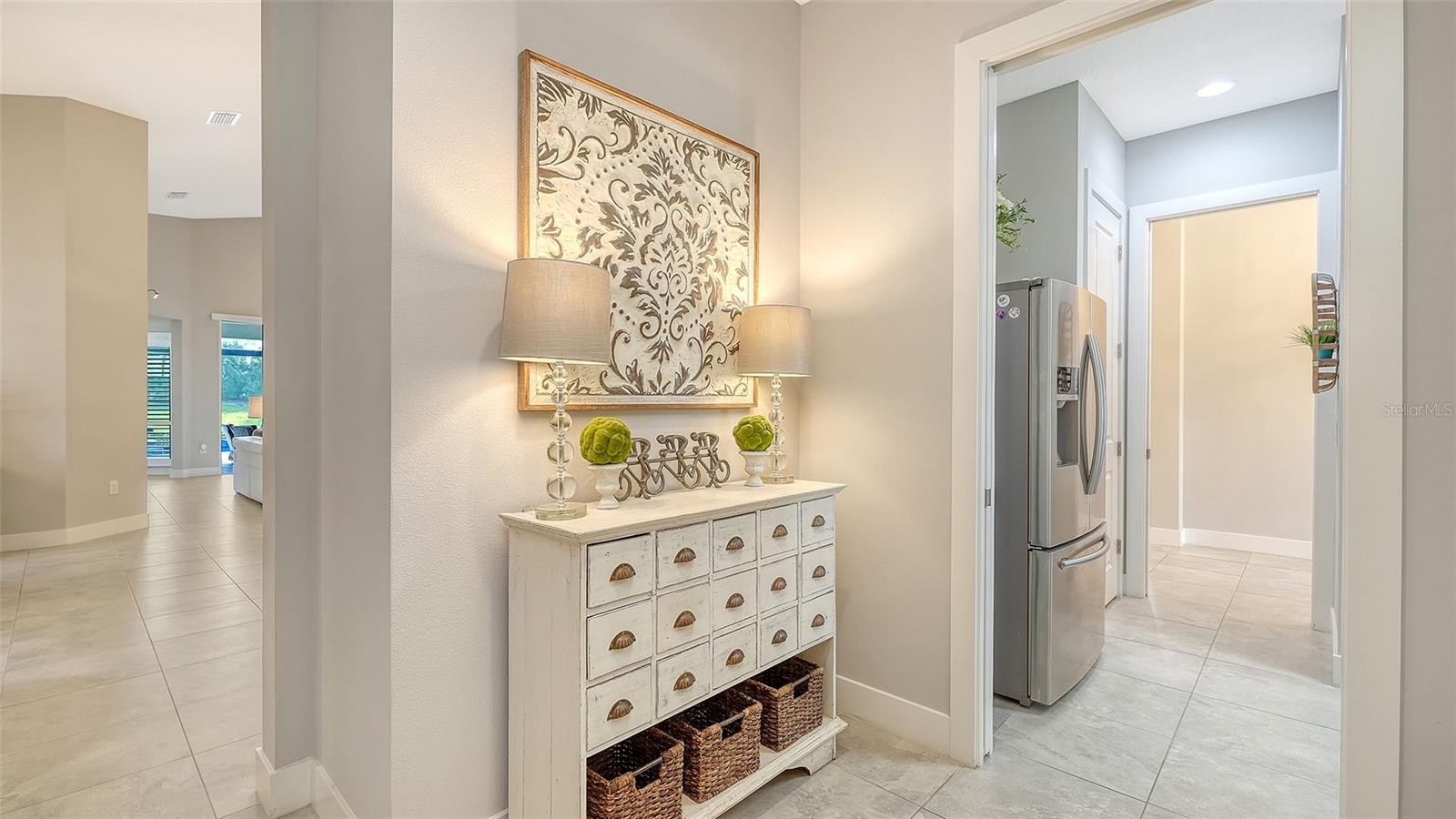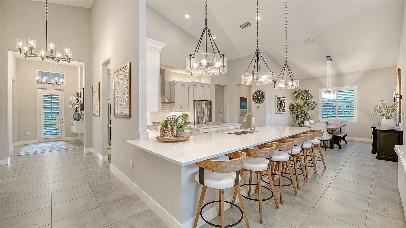This tastefully designed Weatherly floor plan offers 3 full bedrooms, a dedicated office/study, and a versatile flex space ideal for a second bonus room or den, all thoughtfully arranged to maximize both function and style. The home’s beautiful water view sets the tone for the fully upgraded outdoor living space, where a caged-in lanai with panoramic screening and concrete pavers creates a polished backdrop for everyday enjoyment and entertaining. The resort-style pool and spa with three waterfalls and a sun shelf bring a true luxury feel outdoors, while the premium outdoor kitchen with AOG grill, refrigerator, sink, custom powder-coated hurricane shutter, outdoor ceiling fans, fenced dog run, and redesigned front and rear landscaping make the exterior just as impressive as the interior. Inside, the home continues with a long list of elevated finishes and custom details, including a gourmet kitchen with gas cooktop, range hood, stainless GE appliances, quartz countertops, an oversized peninsula bartop that seats 6, an oversized island with extra storage, soft-close cabinetry, and a butler’s pantry complete with a wine fridge and 36-bottle wine rack. Plantation shutters throughout, impact glass windows and doors, electric shades on the rear sliding doors, vaulted ceilings, tray ceilings, upgraded light fixtures and chandeliers, and quartz countertops throughout add both style and substance. The entry makes a strong first impression with a custom floating cabinet and designer mirror feature wall, while the living room is anchored by a dramatic 100-inch fireplace with mirrored feature wall. The flex space is further enhanced by a wood accent ceiling, and the owner’s suite offers two walk-in closets, private lanai access, a tray ceiling, and an ensuite bath with dual vanities and a step-in shower. A well-equipped laundry room with utility sink and cabinets adds convenience, and thoughtful extras like a Ring camera complete the home. Located in LakeHouse Cove at Waterside in Lakewood Ranch, residents enjoy access to a state-of-the-art community center, fitness center, resort-style pool, pickleball courts, bocce ball, a dog park, playground, kayak launch and storage, and lifestyle programming through the community’s lifestyle director. LakeHouse Cove is part of Waterside, Lakewood Ranch’s first village in Sarasota County, with convenient access to Waterside Place, where residents can enjoy dining, shopping, events, trails, green space, and waterfront gathering areas. Its central location also puts you just a short drive from Sarasota-Bradenton International Airport (SRQ), with convenient access to Tampa International Airport (TPA) for additional domestic and international travel options. University Town Center’s shopping, dining, and everyday conveniences are nearby, and some of the area’s most sought-after Gulf Coast destinations, including Sarasota and Bradenton beaches, are easily within reach. The location also offers convenient access to several area private school options, including The Out-of-Door Academy’s Lakewood Ranch campus, Saint Stephen’s in Bradenton, and Cardinal Mooney High School in Sarasota.