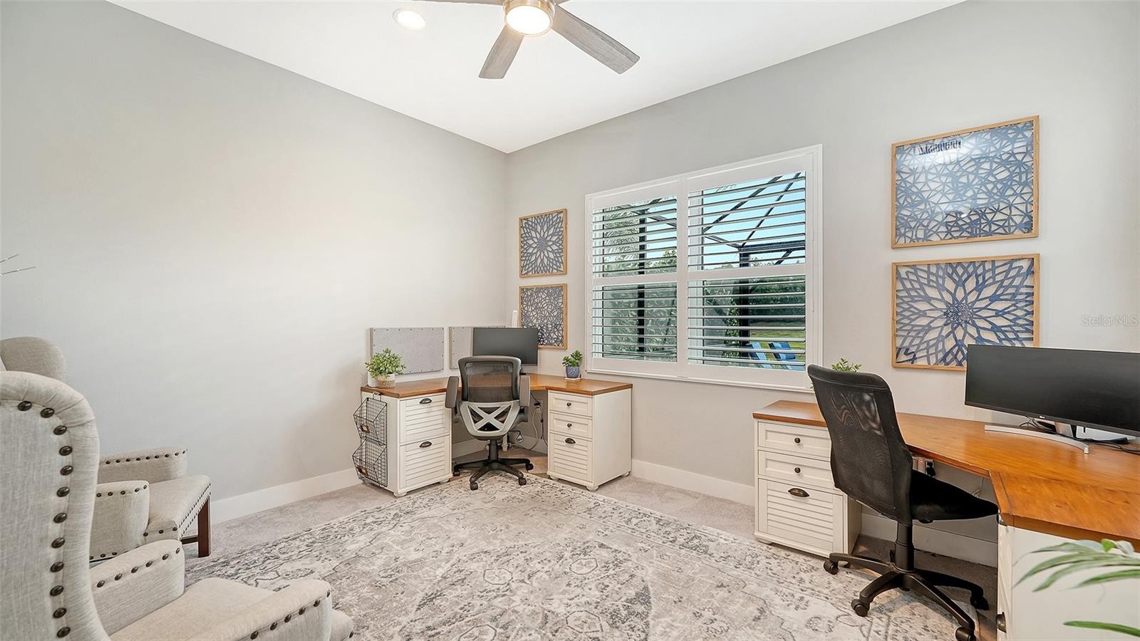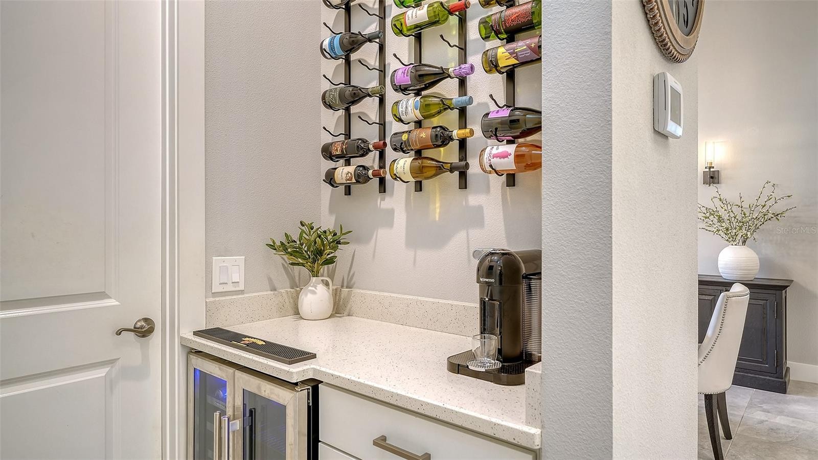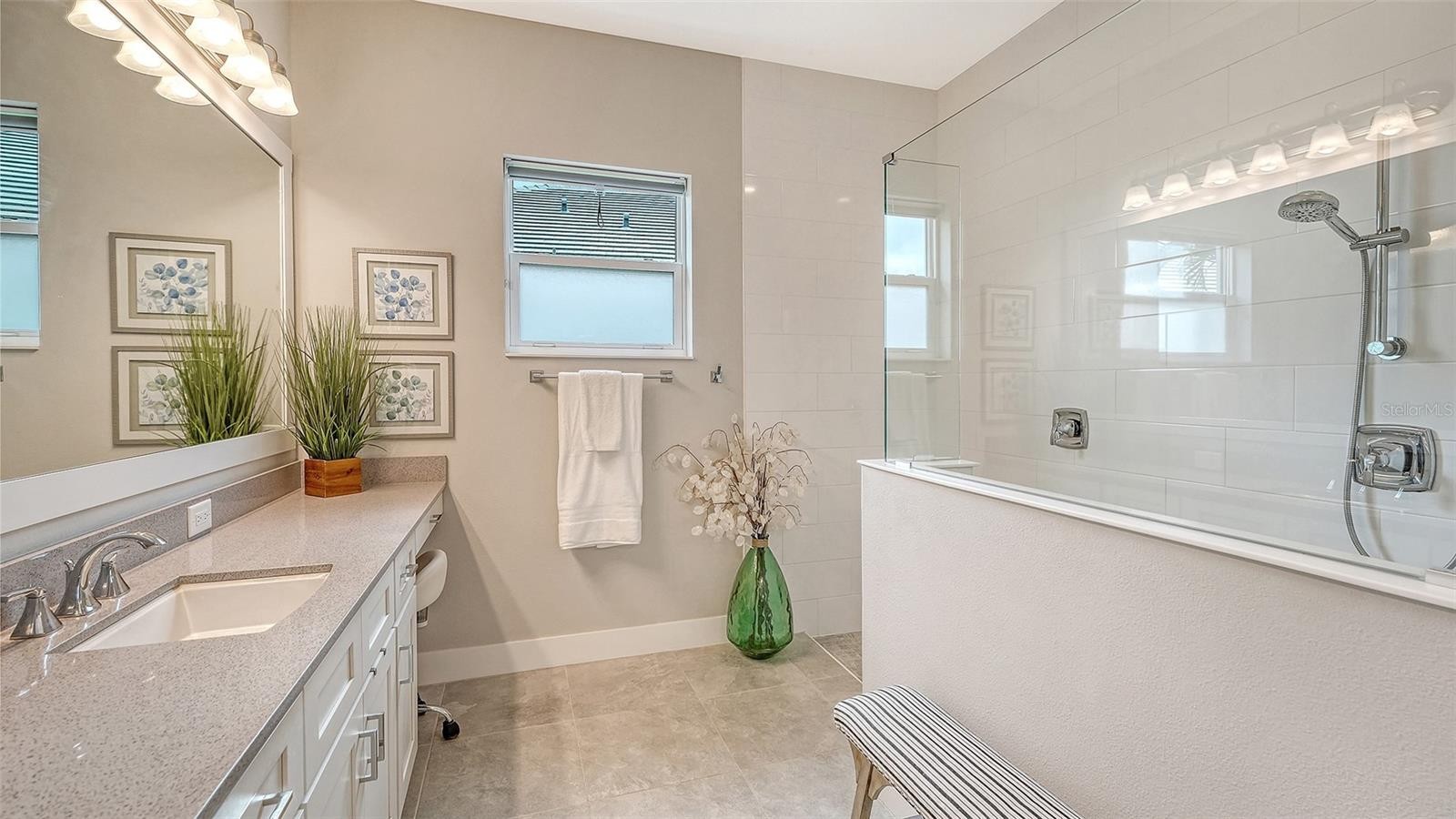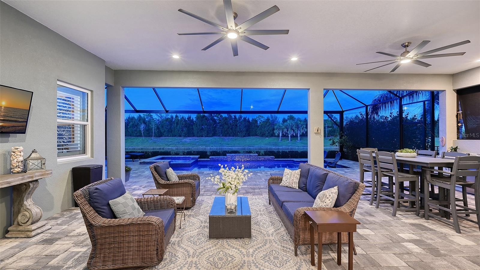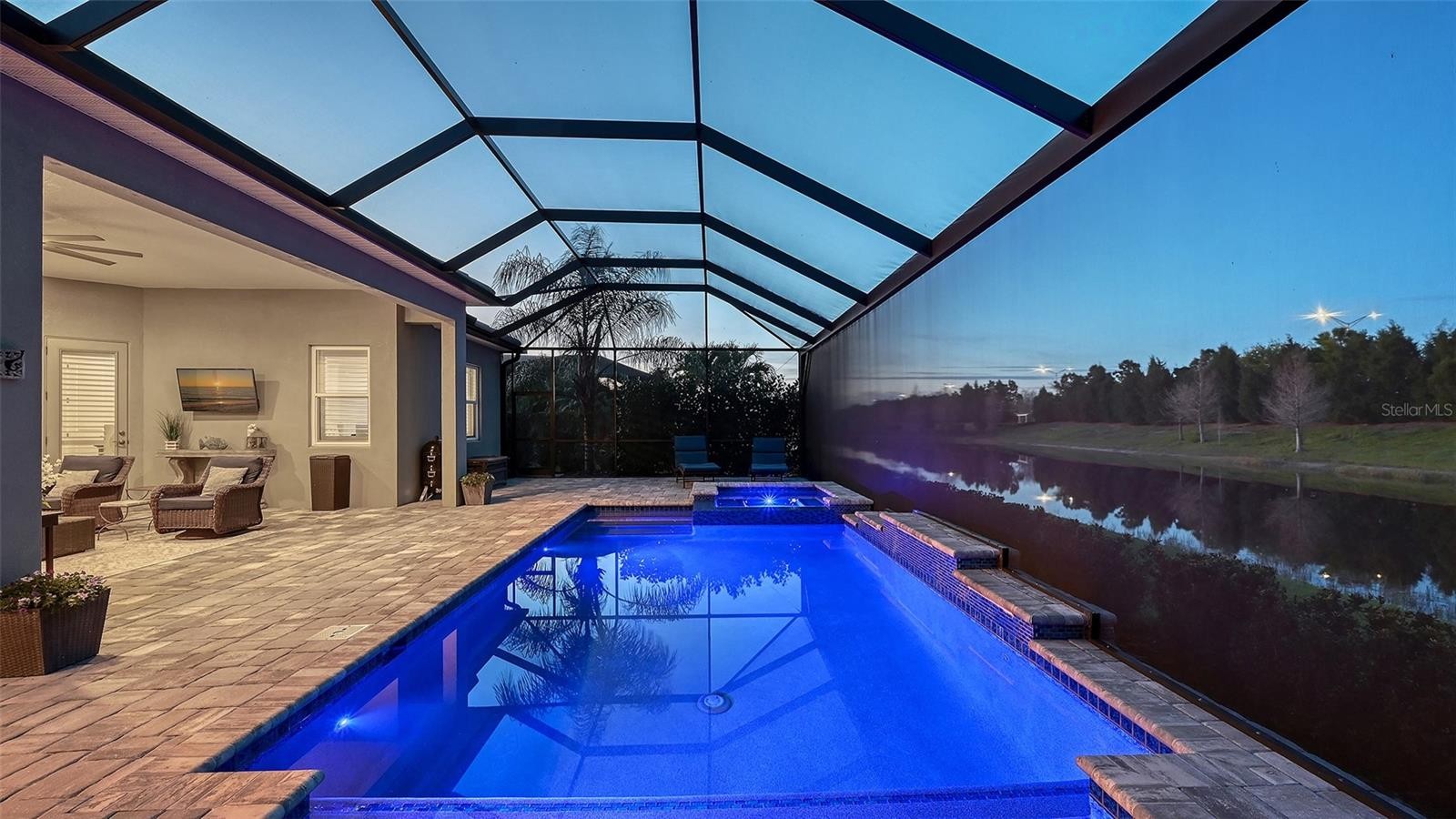 This tastefully designed Weatherly floor plan offers 3 full bedrooms, a dedicated office/study, and a versatile flex space ideal for a second bonus room or den, all thoughtfully arranged to maximize both function and style. The home’s beautiful water view sets the tone for the fully upgraded outdoor living space, where a caged-in lanai with panoramic screening and concrete pavers creates a polished backdrop for everyday enjoyment and entertaining. The resort-style pool and spa with three waterfalls and a sun shelf bring a true luxury feel outdoors, while the premium outdoor kitchen with AOG grill, refrigerator, sink, custom powder-coated hurricane shutter, outdoor ceiling fans, fenced dog run, and redesigned front and rear landscaping make the exterior just as impressive as the interior. Inside, the home continues with a long list of elevated finishes and custom details, including a gourmet kitchen with gas cooktop, range hood, stainless GE appliances, quartz countertops, an oversized peninsula bartop that seats 6, an oversized island with extra storage, soft-close cabinetry, and a butler’s pantry complete with a wine fridge and 36-bottle wine rack. Plantation shutters throughout, impact glass windows and doors, electric shades on the rear sliding doors, vaulted ceilings, tray ceilings, upgraded light fixtures and chandeliers, and quartz countertops throughout add both style and substance. The entry makes a strong first impression with a custom floating cabinet and designer mirror feature wall, while the living room is anchored by a dramatic 100-inch fireplace with mirrored feature wall. The flex space is further enhanced by a wood accent ceiling, and the owner’s suite offers two walk-in closets, private lanai access, a tray ceiling, and an ensuite bath with dual vanities and a step-in shower. A well-equipped laundry room with utility sink and cabinets adds convenience, and thoughtful extras like a Ring camera complete the home. Located in LakeHouse Cove at Waterside in Lakewood Ranch, residents enjoy access to a state-of-the-art community center, fitness center, resort-style pool, pickleball courts, bocce ball, a dog park, playground, kayak launch and storage, and lifestyle programming through the community’s lifestyle director. LakeHouse Cove is part of Waterside, Lakewood Ranch’s first village in Sarasota County, with convenient access to Waterside Place, where residents can enjoy dining, shopping, events, trails, green space, and waterfront gathering areas. Its central location also puts you just a short drive from Sarasota-Bradenton International Airport (SRQ), with convenient access to Tampa International Airport (TPA) for additional domestic and international travel options. University Town Center’s shopping, dining, and everyday conveniences are nearby, and some of the area’s most sought-after Gulf Coast destinations, including Sarasota and Bradenton beaches, are easily within reach. The location also offers convenient access to several area private school options, including The Out-of-Door Academy’s Lakewood Ranch campus, Saint Stephen’s in Bradenton, and Cardinal Mooney High School in Sarasota.