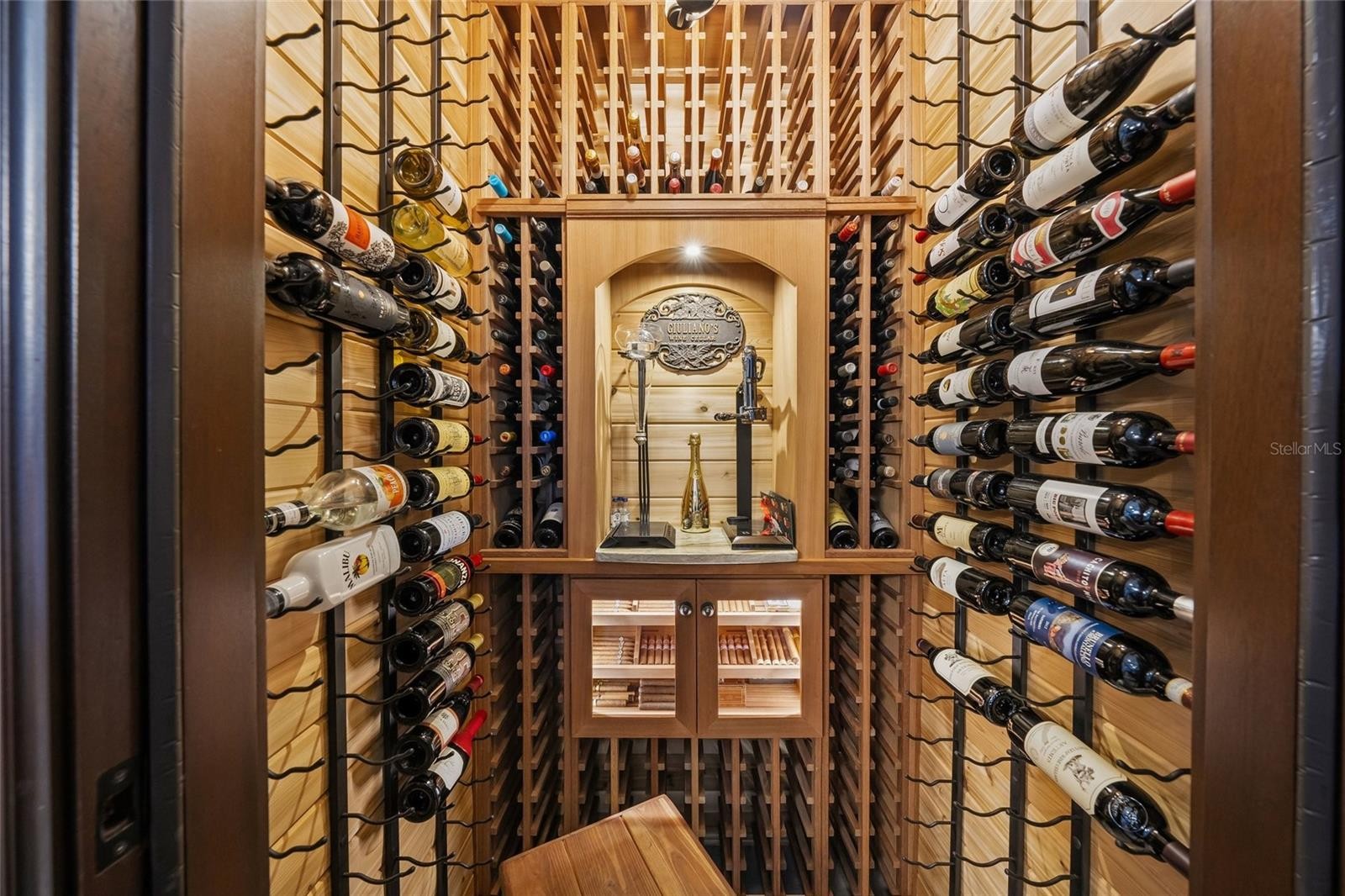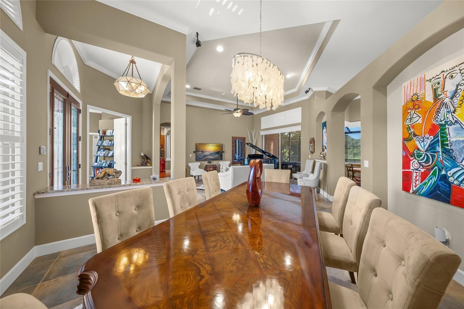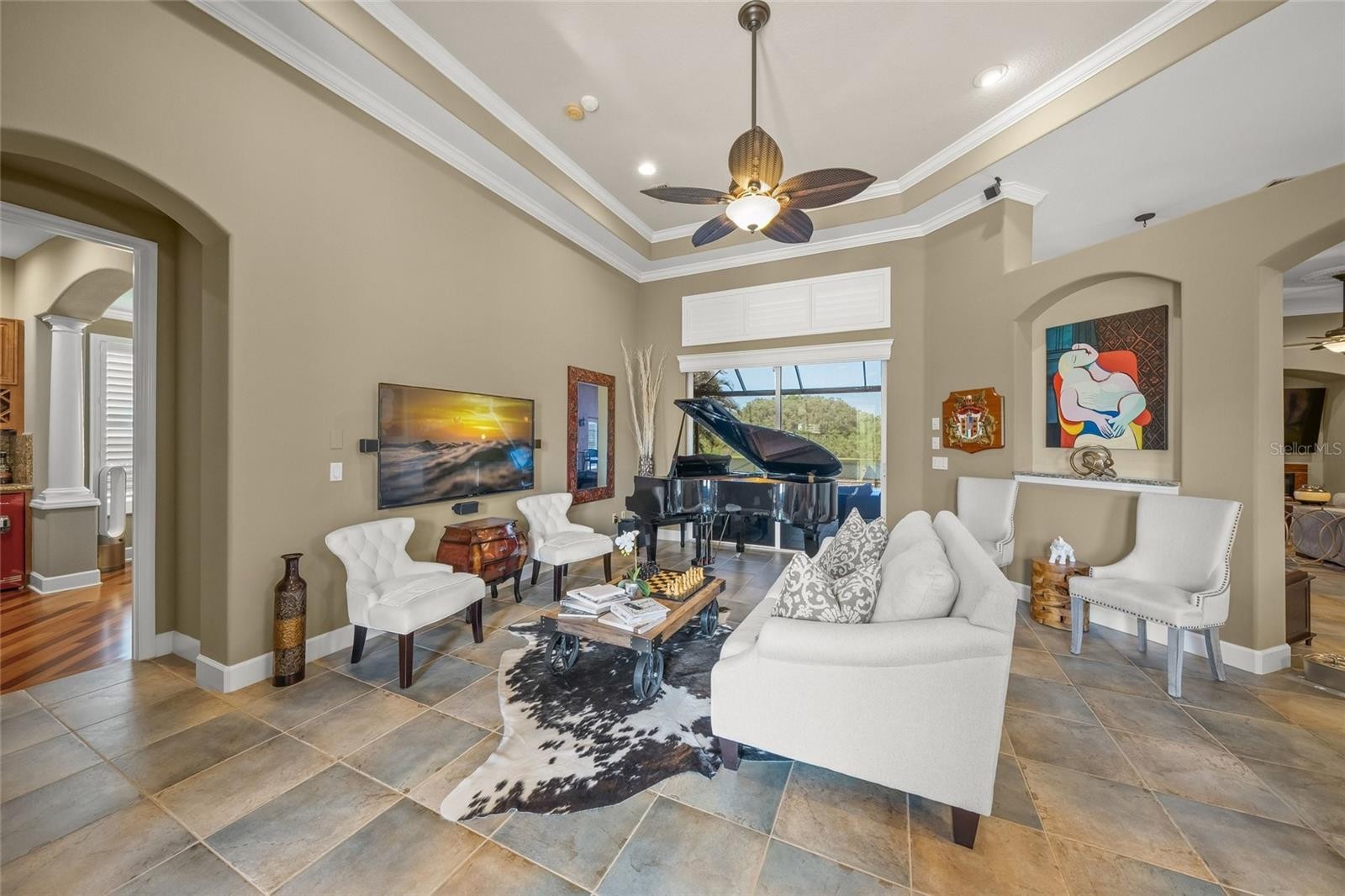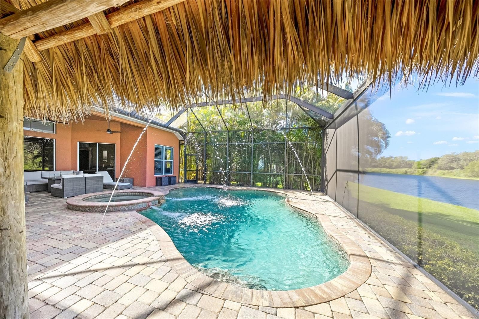 Welcome to an exceptional residence in the sought after Barton Farms community, where refined design meets resort style living. This fully remodeled four bedroom, three bathroom estate with dedicated office showcases a professionally curated interior with elevated finishes and thoughtful upgrades throughout. Step inside to discover soaring ceilings, eight foot doors, oversized baseboards, and extensive crown molding that create a grand yet inviting atmosphere. The expansive floor plan features ceramic tile and authentic real hardwood floors and is anchored by a beautifully upgraded chef’s kitchen with granite countertops, premium appliances, dovetail soft closing cabinetry, and seamless flow into the main living spaces, perfect for both everyday living and entertaining. A whole home surround sound system enhances the experience throughout. Designed for both luxury and versatility, the home features a private movie theater and a custom climate controlled wine cellar with approximately 300 bottle capacity, complemented by a built in cigar humidor and its own dedicated HVAC system. A separate in law suite or bonus space offers exceptional flexibility, complete with a private entrance, bedroom, kitchenette, and living area. The primary suite is a true retreat, offering a wet bar, electric blackout shades, and elegant plantation shutters for ultimate comfort and privacy. Outdoors, enjoy a spectacular waterfront setting with panoramic screened views of a serene lake and preserve. The custom heated saltwater pool and spa measuring 32 by 23 feet features deck jets and is surrounded by sealed pavers and a new panoramic pool cage. The fully equipped tiki hut outdoor kitchen includes granite countertops, grill, cooktop, refrigerator, and sink, creating the ultimate space for entertaining Florida style. Additional highlights include a three-car garage with finished floors, 2023 HVAC systems and a 2024 natural gas water heater, whole-home gas service, a whole-house water filtration and softener system, a security system with surveillance cameras, and landscape lighting with reclaimed water irrigation. Located within a gated community offering tennis courts, clubhouse, and pool, this property also benefits from low HOA fees and no CDD. Ideally situated just minutes from Siesta Key Beach and Downtown Sarasota, this home is offered furnished, including electronics, for a truly turnkey opportunity. *Please note - Fences are NOT allowed. This is a rare offering that combines luxury, functionality, and lifestyle designed to impress the most discerning buyer.