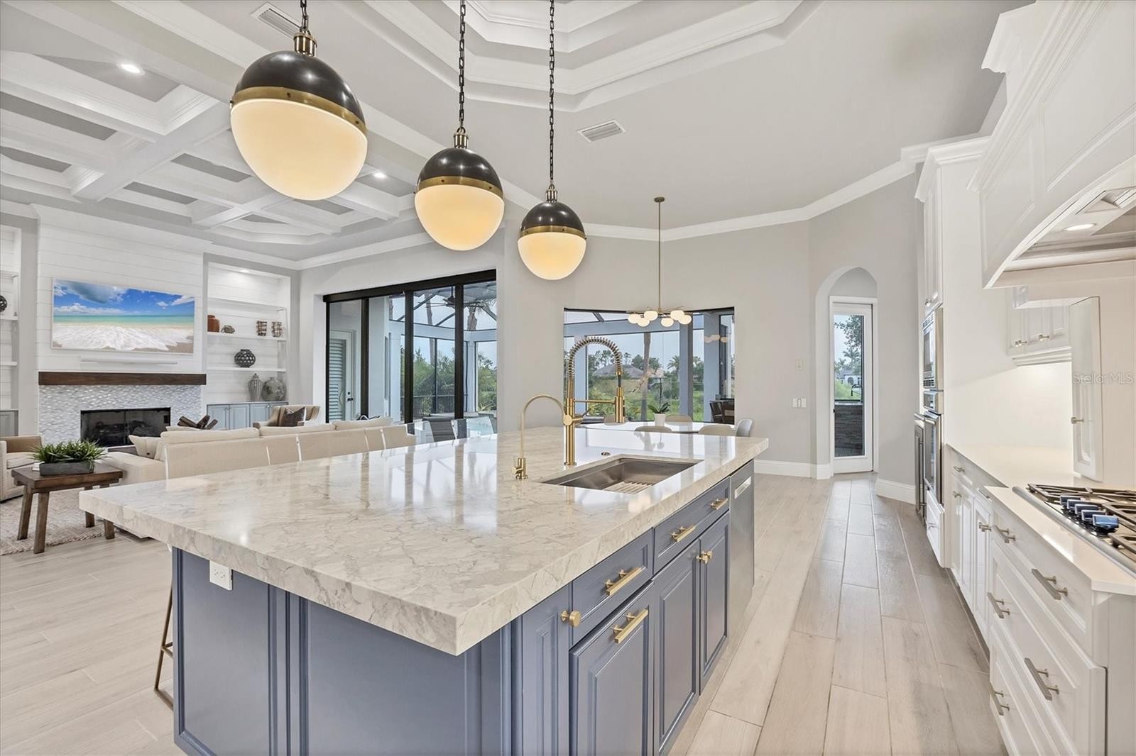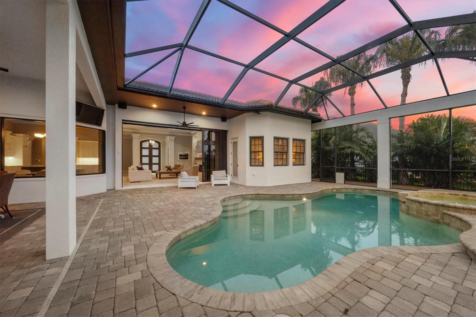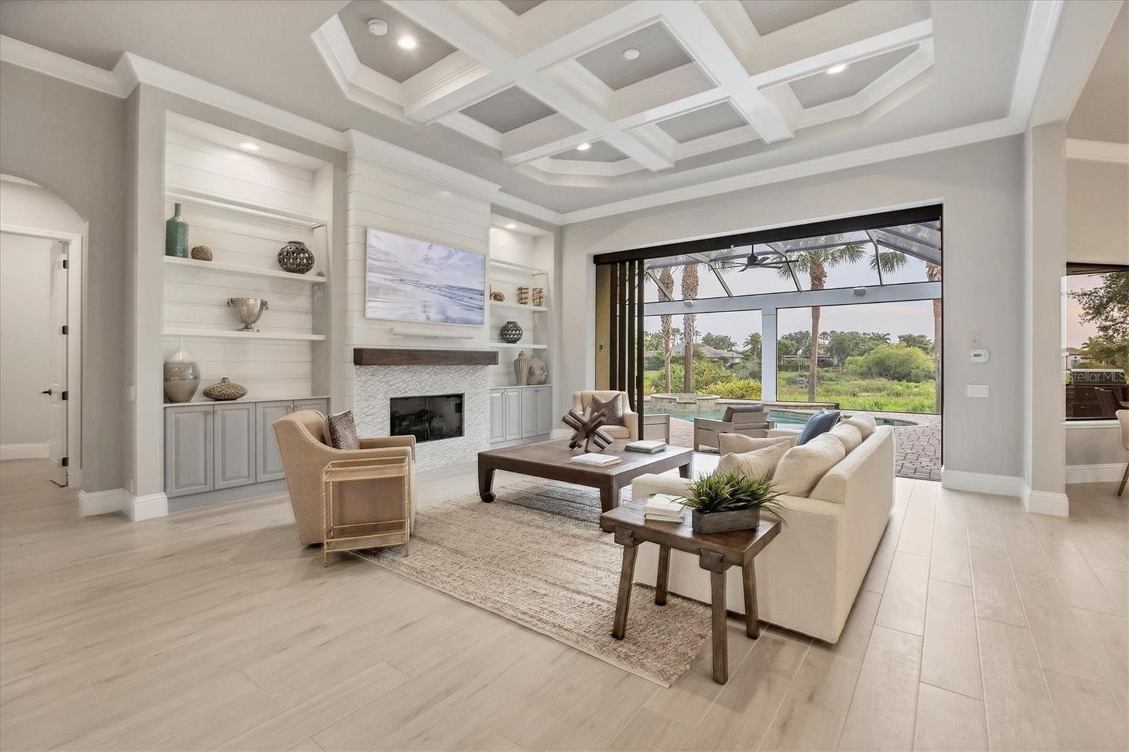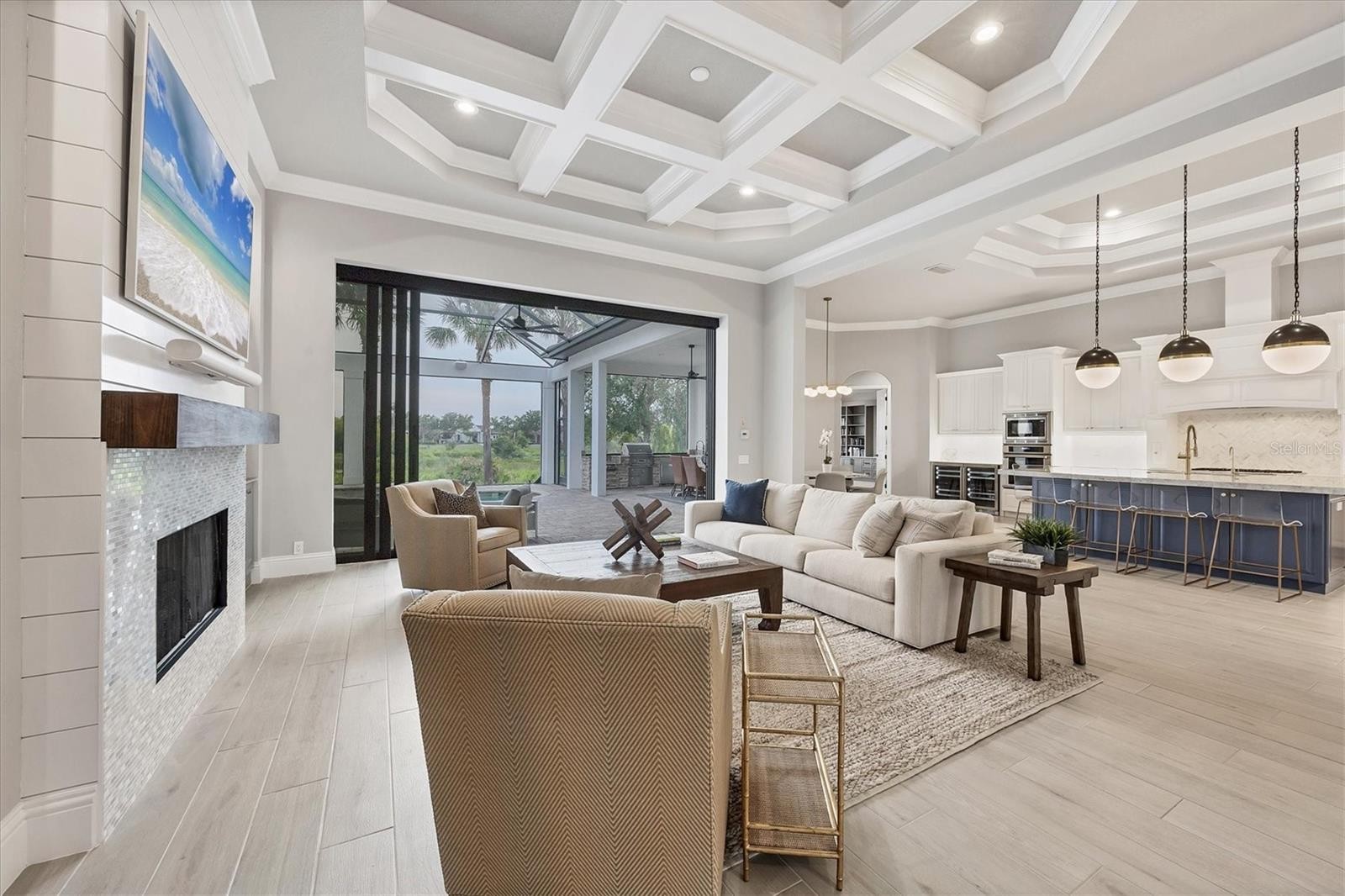 In the prestigious community of The Lake Club in Lakewood Ranch, this custom-built, extensively renovated in 2022, four-bath plus bonus room and office estate offers approximately 3,600 square feet of refined living space with a tranquil bird sanctuary preserve view. Designed by renowned builder John Cannon, this residence combines modern updates with quality John Cannon construction. The home’s exterior features a paver driveway leading to a three-car garage, complemented by lush landscaping and outdoor lighting that enhance its exceptional curb appeal. Upon entering through the custom double iron and glass impact entry doors, the expansive great room welcomes you with tall ceilings, a gas fireplace anchored by custom built in cabinetry and shelving, tray ceilings with beam detail, crown molding, porcelain wood plank tile flooring, and 10-foot pocket sliding doors that open to an expansive screened lanai. The renovated gourmet kitchen is equipped with stainless Thermador appliances, a five-burner gas stove, Sub-Zero refrigerator, under sink reverse osmosis water filter, massive island with thick stunning quartzite countertops, double beverage refrigerators, designer lighting, custom cabinets, walk-in pantry and a kitchenette with aquarium windows offering beautiful views of the pool and spa. A media/bonus room with access to the lanai provides additional space for entertainment. The oversized primary suite features tile plank floors, large walk-in closets, and a spacious main bath with dual vanities, a soaking tub and a walk-in shower. Three additional large guest bedrooms also include wood and tile plank floors, walk-in closets and their dedicated en-suite baths. A private office, off the entry, offers a sound absorption wall to ensure a quiet space for work or reading. While the separate formal dining room offers space for entertaining. The completely new laundry room features built-in cabinetry, a farmhouse-style sink, and a new stacked washer and dryer. Throughout the home, wood plank tile flooring has been installed for a seamless, upscale finish. The expansive screened lanai is designed for entertaining, featuring a heated saltwater pool and spa with new equipment including new pump, salt cell and leveler, as well as a new outdoor kitchen. Additional recent upgrades include new air-conditioning units, whole house water treatment, whole-house generator, new water heater and a Sonos speaker system with outdoor sound. Residents of The Lake Club enjoy access to a range of amenities, including two resort-style pools, Har-Tru tennis courts, pickleball courts, a fitness center, private spa, clubhouse and grand ballroom. The community’s Mediterranean-inspired design includes cobblestone streets, decorative stone bridges, fountains, scenic park areas and lush landscaping, creating a tranquil and luxurious living environment.