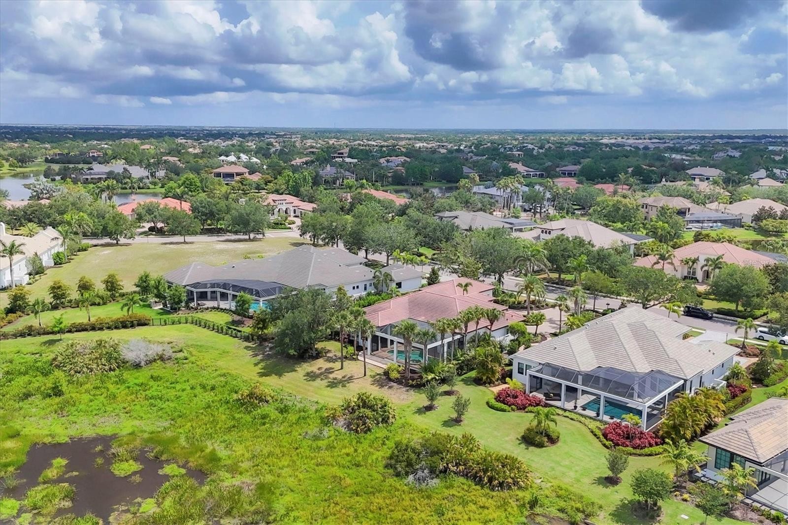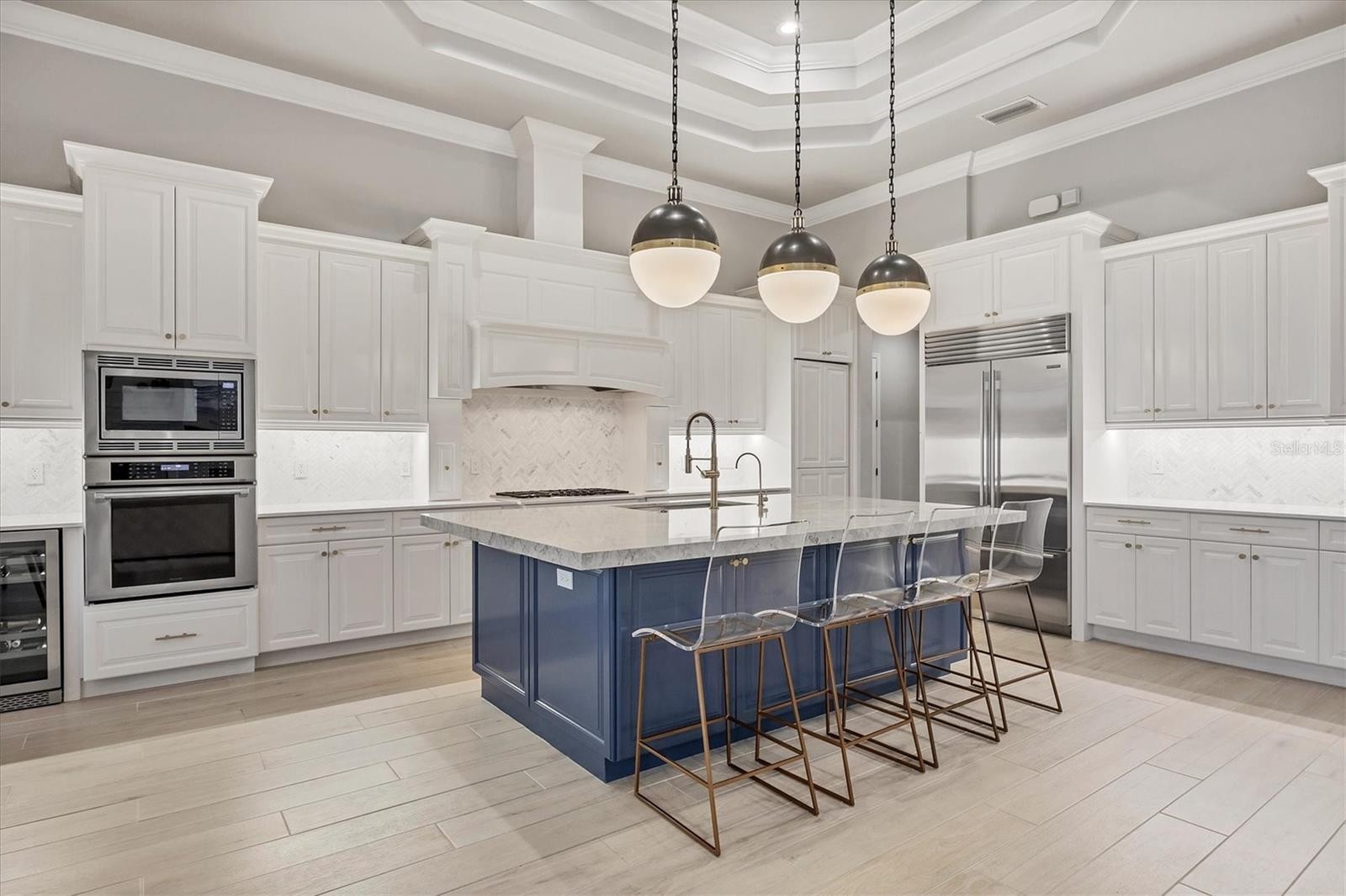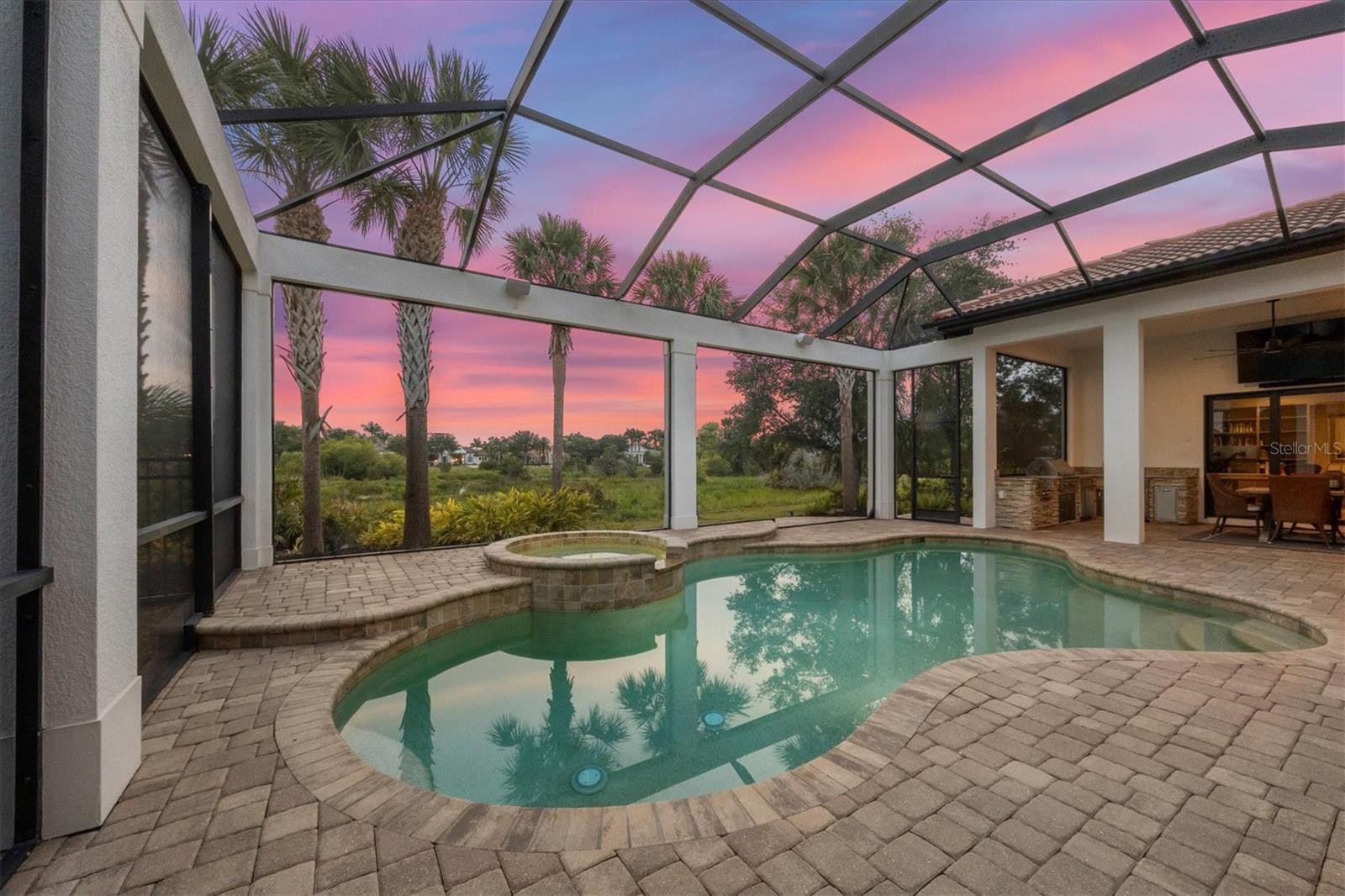 In the prestigious community of The Lake Club in Lakewood Ranch, this custom-built, extensively renovated in 2022, four-bath plus bonus room and office estate offers approximately 3,600 square feet of refined living space with a tranquil bird sanctuary preserve view. Designed by renowned builder John Cannon, this residence combines modern updates with quality John Cannon construction. The home’s exterior features a paver driveway leading to a three-car garage, complemented by lush landscaping and outdoor lighting that enhance its exceptional curb appeal. Upon entering through the custom double iron and glass impact entry doors, the expansive great room welcomes you with tall ceilings, a gas fireplace anchored by custom built in cabinetry and shelving, tray ceilings with beam detail, crown molding, porcelain wood plank tile flooring, and 10-foot pocket sliding doors that open to an expansive screened lanai. The renovated gourmet kitchen is equipped with stainless Thermador appliances, a five-burner gas stove, Sub-Zero refrigerator, under sink reverse osmosis water filter, massive island with thick stunning quartzite countertops, double beverage refrigerators, designer lighting, custom cabinets, walk-in pantry and a kitchenette with aquarium windows offering beautiful views of the pool and spa. A media/bonus room with access to the lanai provides additional space for entertainment. The oversized primary suite features tile plank floors, large walk-in closets, and a spacious main bath with dual vanities, a soaking tub and a walk-in shower. Three additional large guest bedrooms also include wood and tile plank floors, walk-in closets and their dedicated en-suite baths. A private office, off the entry, offers a sound absorption wall to ensure a quiet space for work or reading. While the separate formal dining room offers space for entertaining. The completely new laundry room features built-in cabinetry, a farmhouse-style sink, and a new stacked washer and dryer. Throughout the home, wood plank tile flooring has been installed for a seamless, upscale finish. The expansive screened lanai is designed for entertaining, featuring a heated saltwater pool and spa with new equipment including new pump, salt cell and leveler, as well as a new outdoor kitchen. Additional recent upgrades include new air-conditioning units, whole house water treatment, whole-house generator, new water heater and a Sonos speaker system with outdoor sound. Residents of The Lake Club enjoy access to a range of amenities, including two resort-style pools, Har-Tru tennis courts, pickleball courts, a fitness center, private spa, clubhouse and grand ballroom. The community’s Mediterranean-inspired design includes cobblestone streets, decorative stone bridges, fountains, scenic park areas and lush landscaping, creating a tranquil and luxurious living environment.