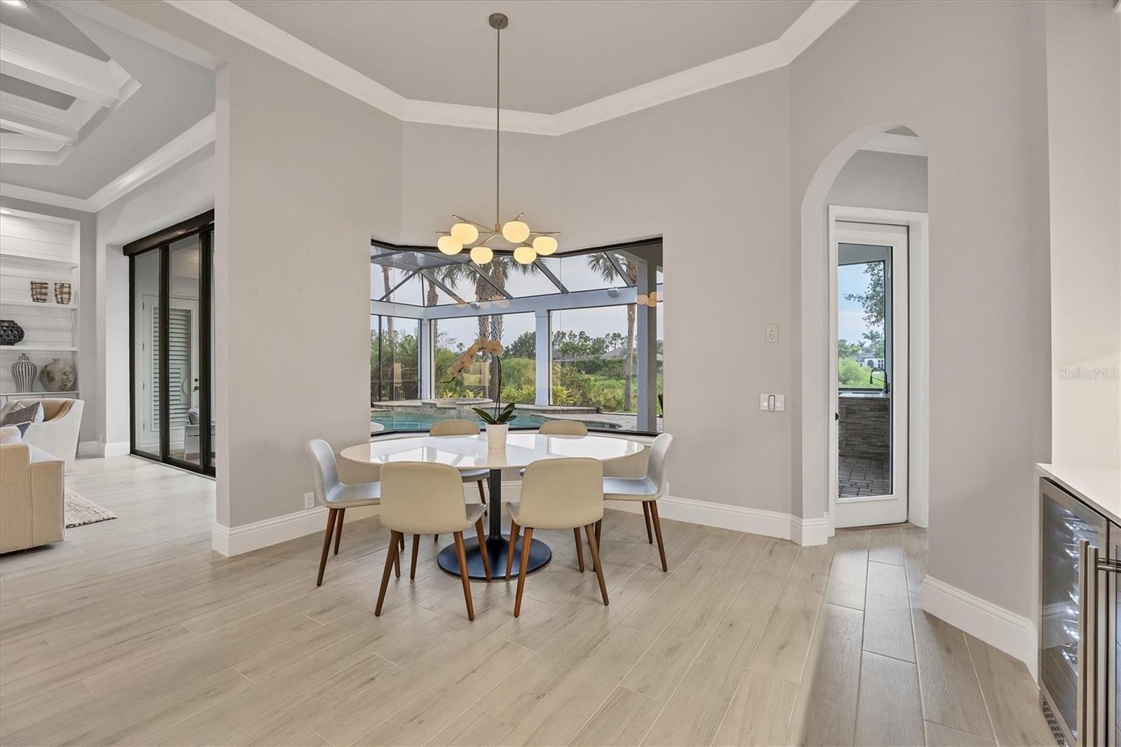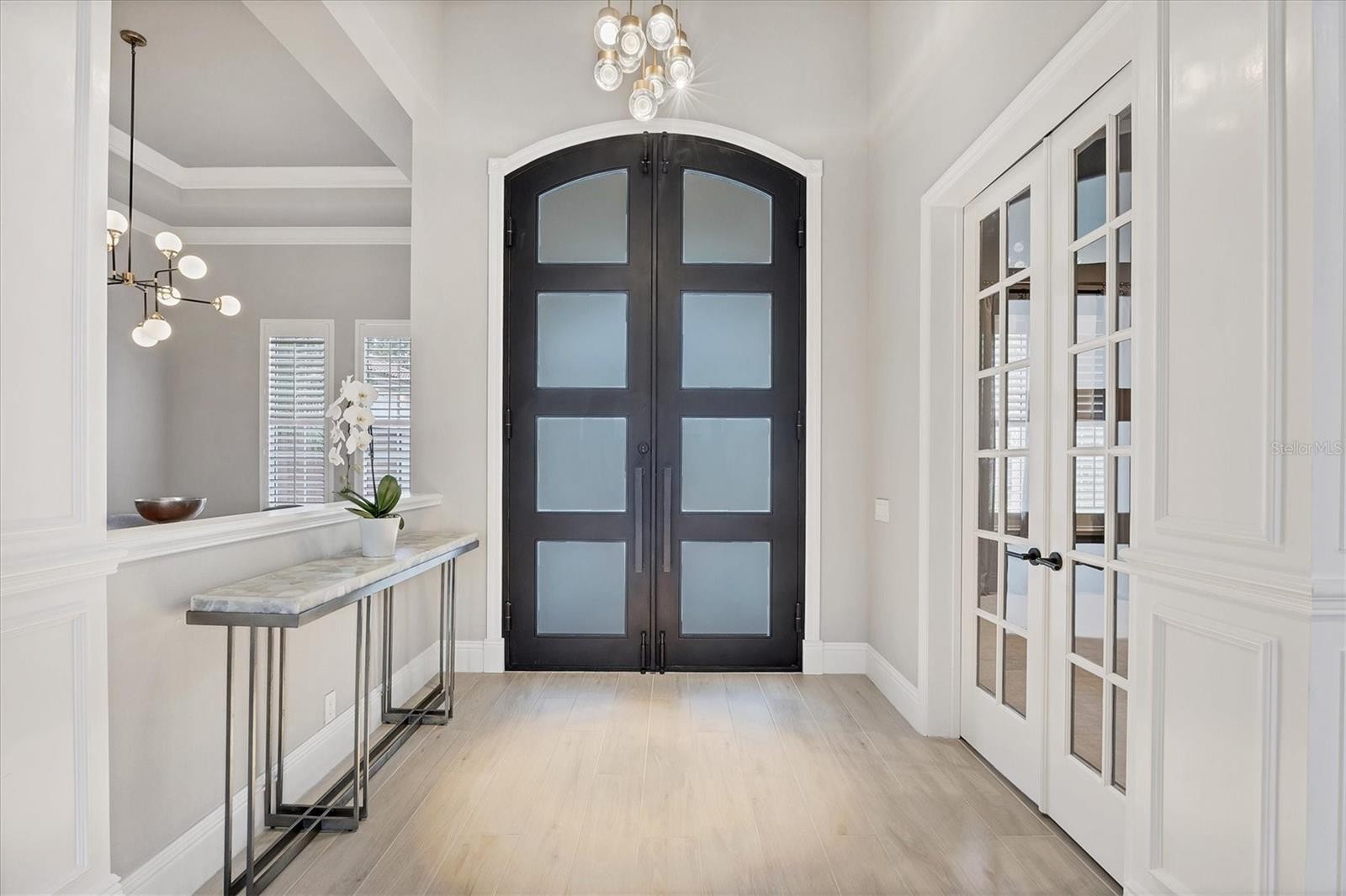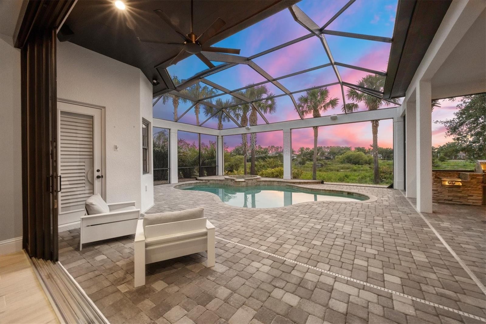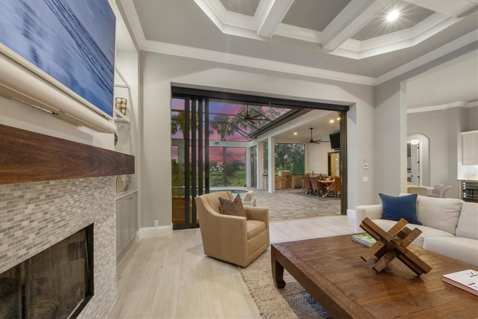 In the prestigious community of The Lake Club in Lakewood Ranch, this custom-built, extensively renovated in 2022, four-bath plus bonus room and office estate offers approximately 3,600 square feet of refined living space with a tranquil bird sanctuary preserve view. Designed by renowned builder John Cannon, this residence combines modern updates with quality John Cannon construction. The home’s exterior features a paver driveway leading to a three-car garage, complemented by lush landscaping and outdoor lighting that enhance its exceptional curb appeal. Upon entering through the custom double iron and glass impact entry doors, the expansive great room welcomes you with tall ceilings, a gas fireplace anchored by custom built in cabinetry and shelving, tray ceilings with beam detail, crown molding, porcelain wood plank tile flooring, and 10-foot pocket sliding doors that open to an expansive screened lanai. The renovated gourmet kitchen is equipped with stainless Thermador appliances, a five-burner gas stove, Sub-Zero refrigerator, under sink reverse osmosis water filter, massive island with thick stunning quartzite countertops, double beverage refrigerators, designer lighting, custom cabinets, walk-in pantry and a kitchenette with aquarium windows offering beautiful views of the pool and spa. A media/bonus room with access to the lanai provides additional space for entertainment. The oversized primary suite features tile plank floors, large walk-in closets, and a spacious main bath with dual vanities, a soaking tub and a walk-in shower. Three additional large guest bedrooms also include wood and tile plank floors, walk-in closets and their dedicated en-suite baths. A private office, off the entry, offers a sound absorption wall to ensure a quiet space for work or reading. While the separate formal dining room offers space for entertaining. The completely new laundry room features built-in cabinetry, a farmhouse-style sink, and a new stacked washer and dryer. Throughout the home, wood plank tile flooring has been installed for a seamless, upscale finish. The expansive screened lanai is designed for entertaining, featuring a heated saltwater pool and spa with new equipment including new pump, salt cell and leveler, as well as a new outdoor kitchen. Additional recent upgrades include new air-conditioning units, whole house water treatment, whole-house generator, new water heater and a Sonos speaker system with outdoor sound. Residents of The Lake Club enjoy access to a range of amenities, including two resort-style pools, Har-Tru tennis courts, pickleball courts, a fitness center, private spa, clubhouse and grand ballroom. The community’s Mediterranean-inspired design includes cobblestone streets, decorative stone bridges, fountains, scenic park areas and lush landscaping, creating a tranquil and luxurious living environment.