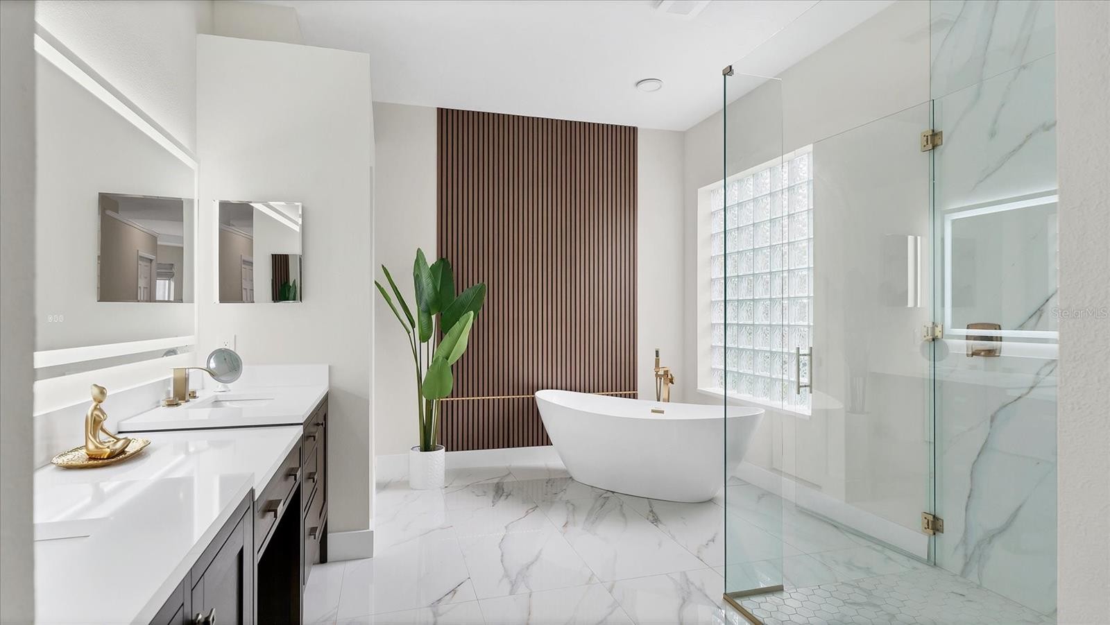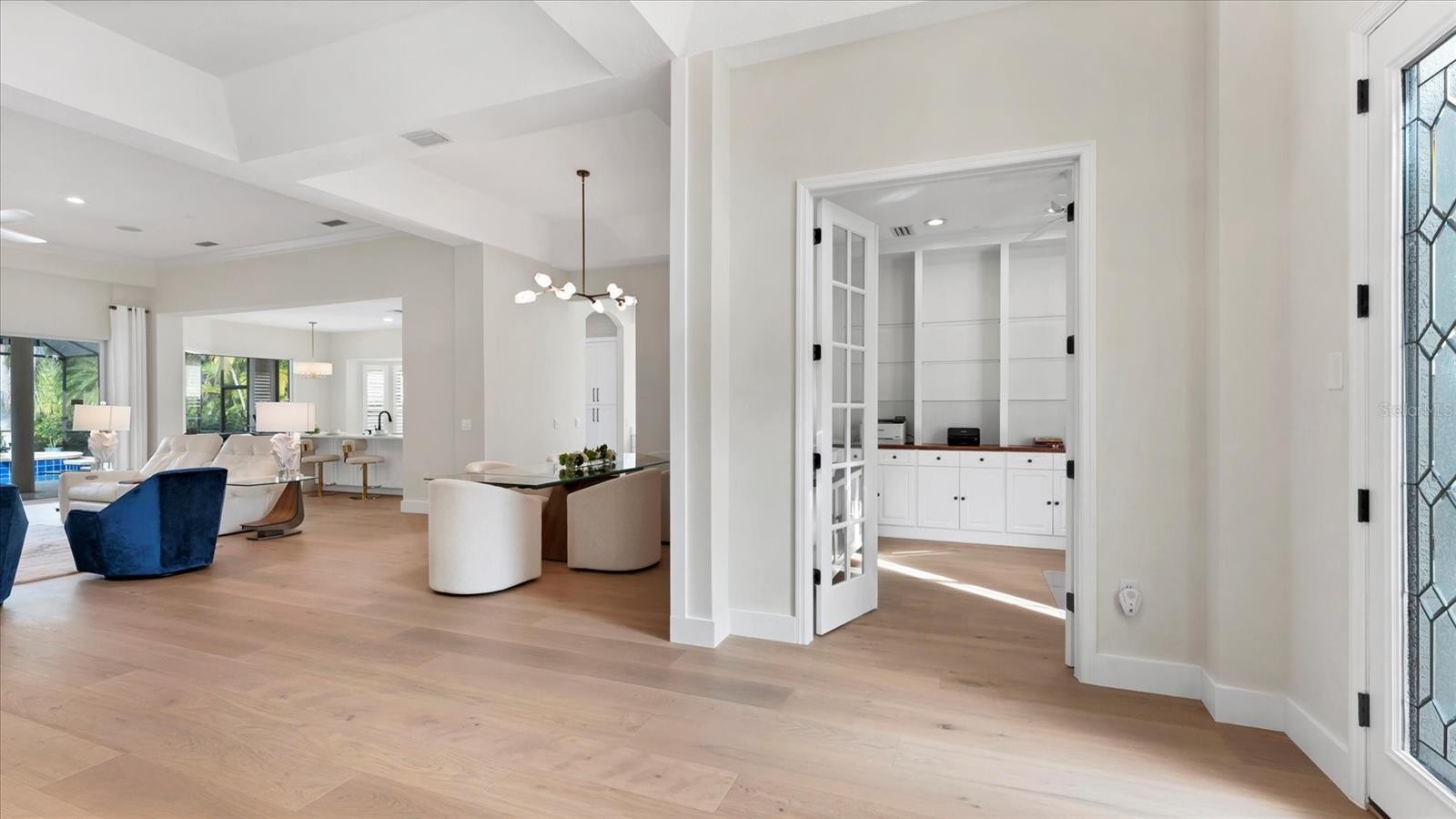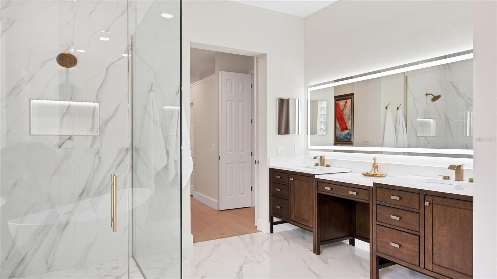 Rare found and absolutely stunning, this completely renovated luxury residence is a true masterpiece where style, comfort, and sophistication come together seamlessly. From the moment you arrive, every detail reflects exceptional craftsmanship and high-end design. A double-glass, hurricane-resistant front door welcomes you into an elegant open-concept living space featuring soaring ceilings, crown molding, recessed lighting, a sleek linear fireplace, and a seamless flow into the dining area, creating a bright and inviting atmosphere ideal for both everyday living and entertaining. The spacious formal dining room is a showpiece, highlighted by a sculptural chandelier and a stylish paneled accent wall, comfortably accommodating a table for eight—perfect for hosting family and friends. The newly designed kitchen is both beautiful and functional, featuring custom cabinetry, white quartz countertops, and stainless-steel appliances. A generous central island with deep cabinetry anchors the space, complemented by a dedicated coffee station and a butler’s pantry. An elegantly furnished dinette overlooks the pool through an expansive aquarium-glass window that creates a seamless visual connection to the pool, filling the space with natural light and a serene indoor-outdoor ambiance. The primary suite is an exceptional private retreat, exceeding every expectation. It offers two large walk-in closets with custom cabinetry, a light-filled bedroom with tranquil lake views, and an oversized spa-inspired bathroom featuring a double vanity, a walk-in glass shower, and a soaking tub framed by a softly illuminated accent wall—perfect for unwinding in the evening. Two additional guest bedrooms, each generously sized, are located on the opposite side of the home and share a beautifully appointed full bathroom with marble floors, a walk-in shower, and a stylish glass door. A private office with multiple built-in cabinetry provides both functionality and refined design. The outdoor living area is destined to become your favorite space. Travertine flooring extends throughout the lanai, enhancing the refined outdoor living experience. This exceptional space also features a fully equipped outdoor kitchen, a newly resurfaced pool and spa, a renovated pool cage, and a convenient pool bathroom. New landscaping and a new irrigation system further enhance the home’s curb appeal and outdoor enjoyment. The home was completely renovated in 2025, including a new roof and a new air-conditioning system. An extensive list of updates is available. An oversized garage is designed to accommodate two cars plus a golf cart and is complete with new epoxy flooring. Every detail has been thoughtfully updated—there is truly nothing left to do but move in and enjoy. EXPERIENCE The University Park With its mature landscape and sprawling natural beauty, University Park is the premier master-planned community in the Sarasota area. Behind the secured, staffed entrance is an award-winning, resident-owned community featuring 27 holes of four-star rated golf, eleven lighted Har-Tu tennis courts, four pickleball courts, a fitness center, croquet, miles of tree-lined streets for walking or biking, and first-class dining. Located only four miles from downtown Sarasota and its spirited arts community, museums, shopping, dining, and first-class healthcare, University Park is an oasis from the City but close enough to all amenities.