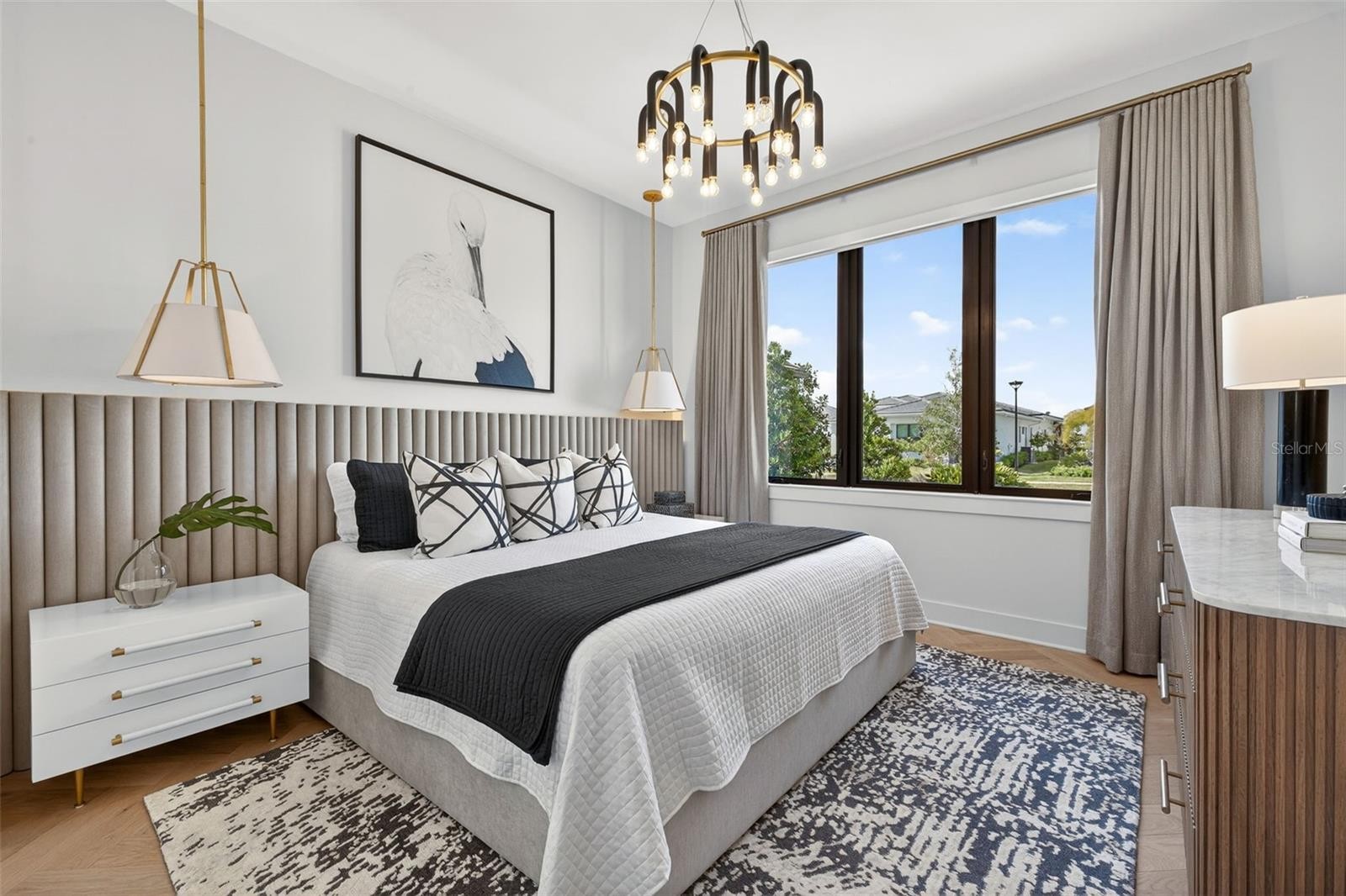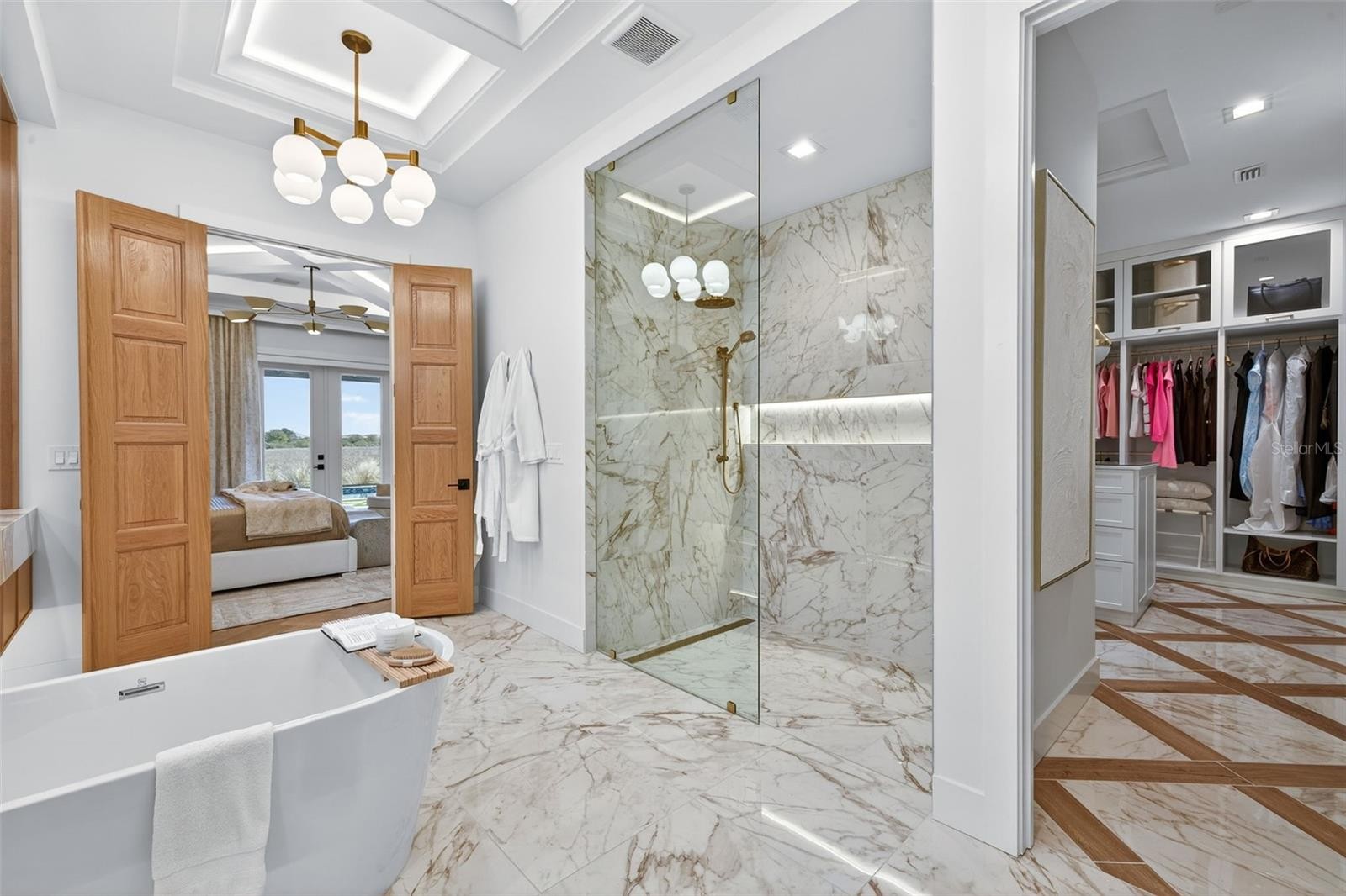 Award winning, professionally decorated dream home in Wildblue at Waterside. This Sapphire model home offers endless, breathtaking unobstructed views of nature's beauty in a serene and relaxed setting. Fully furnished and move-in ready, this luxurious residence exudes sophistication from the moment you arrive at the beautiful crackled glass & iron pivot front door. Step inside to a grand marble foyer featuring custom moldings, exquisite ceiling details, and elegant lighting that sets the tone for the exceptional craftsmanship found throughout.The gourmet kitchen is a chef's paradise, boasting upgraded professional appliances, a dramatic waterfall kitchen island, and a spacious walk-in pantry with custom built-ins for ultimate organization and style.Entertain effortlessly with an inviting lap pool, custom pool deck, and a fully equipped outdoor kitchen—all protected by StormSmart storm screens that safeguard your outdoor furnishings from hurricanes and debris. The pool bath impresses with decorative floor-to-ceiling tile work, adding a spa-like elegance.Custom finishes and upgrades abound, including stunning draperies throughout, with room-darkening curtains and shades in the bedrooms for perfect privacy and comfort. The bonus room offers versatility with a pull-out sofa bed and built-in cabinets, while the dedicated office features custom molding and thoughtful built-ins. A show-stopping wrap-around glass wall with sun shades floods the home with natural light and showcases the views.The high-end primary dream closet is a true highlight, complete with custom built-ins and integrated lighting on the shelves for a boutique feel. Other upgrades include; landscape lighting, newer epoxy garage floor, and freshly painted interior of the home and the garage. With custom finishes throughout this lock & leave residence, every detail has been thoughtfully curated to deliver unparalleled luxury and tranquility. Experience true elegance in one of Lakewood Ranch's most sought-after communities—your dream home awaits!