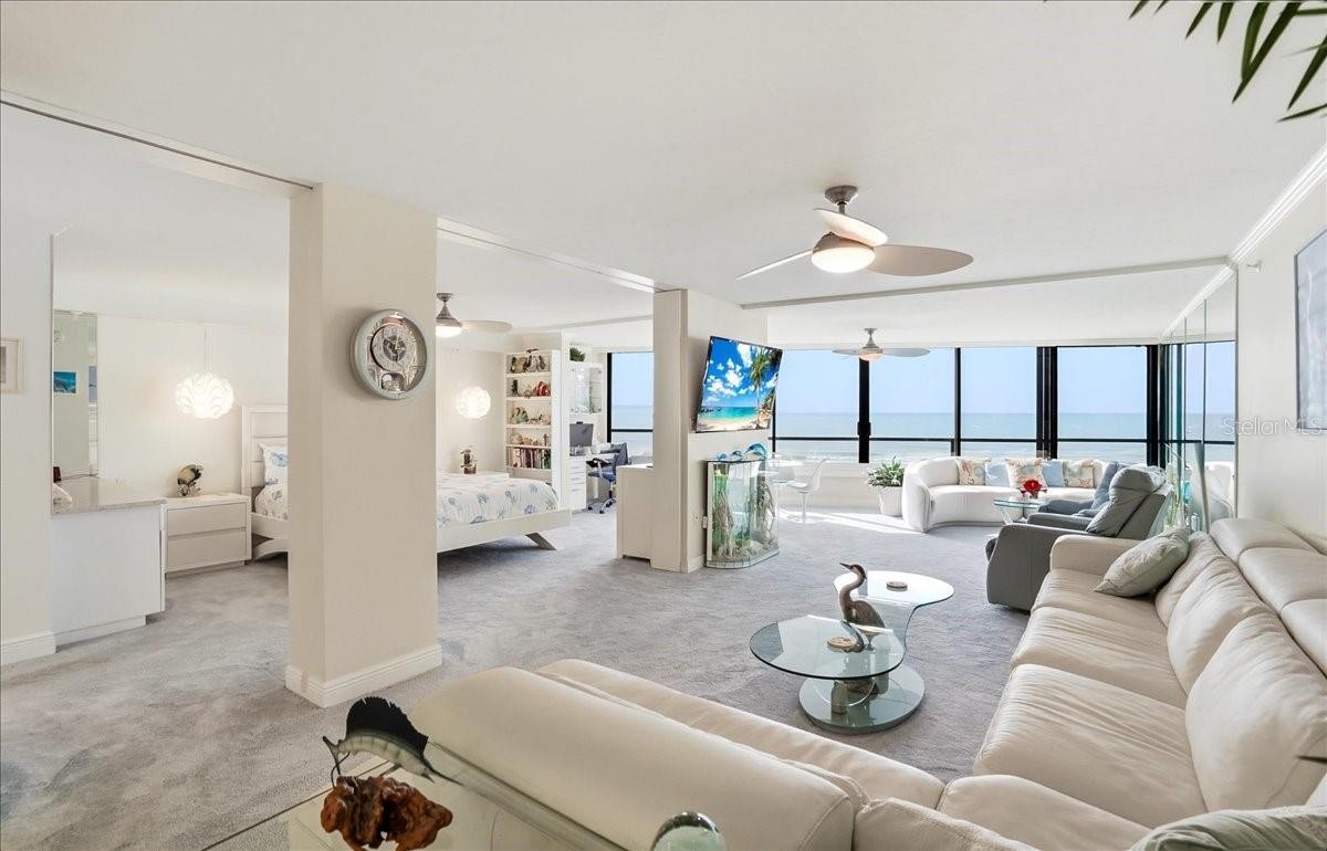 Discover your dream coastal retreat in this stunning third-floor condo with breathtaking full Gulf views. This beautifully designed condo features a convertible master bedroom, providing flexibility to suit your lifestyle. The master ensuite is a true sanctuary, boasting elegant tile floors, dual sinks with Corian countertops, and a stylish walk-in shower with glass doors. The spacious walk-in closet, along with an additional regular closet, offers ample storage for all your essentials. As you enter, you're welcomed by a tiled entry that leads into a cozy living and dining area adorned with plush carpeting. Enjoy the seamless flow of space, ideal for both relaxation and entertaining, while soaking in the gorgeous direct Gulf views from your living room. The guest bedroom is generously sized, featuring tile flooring, built-in storage, and a large closet for all your guests' needs. The guest bath has been tastefully updated, featuring a spacious walk-in shower with floor-to-ceiling tile, a bench seat, and glass doors, combining function with luxury. The kitchen is equipped with newer stainless-steel appliances, quartz countertops, and ample storage, including a pantry and a convenient washer and dryer in the unit. Imagine cooking while taking in stunning sunset views over the Gulf. This condo is turn-key furnished, allowing for a seamless transition to your new life by the beach. Enjoy added features such as crown molding and attractive floorboards throughout the unit. The secured building offers peace of mind, and residents have access to a newly renovated clubhouse with a Gulfside pool and BBQ area, perfect for socializing and soaking up the sun. Just minutes from historic downtown Venice, you can bike or walk and enjoy quaint shops, boutiques, award-winning restaurants, the Venice Art Center, Venice Theatre, and medical facilities. Don’t miss this incredible opportunity to own a piece of paradise with unparalleled Gulf views!