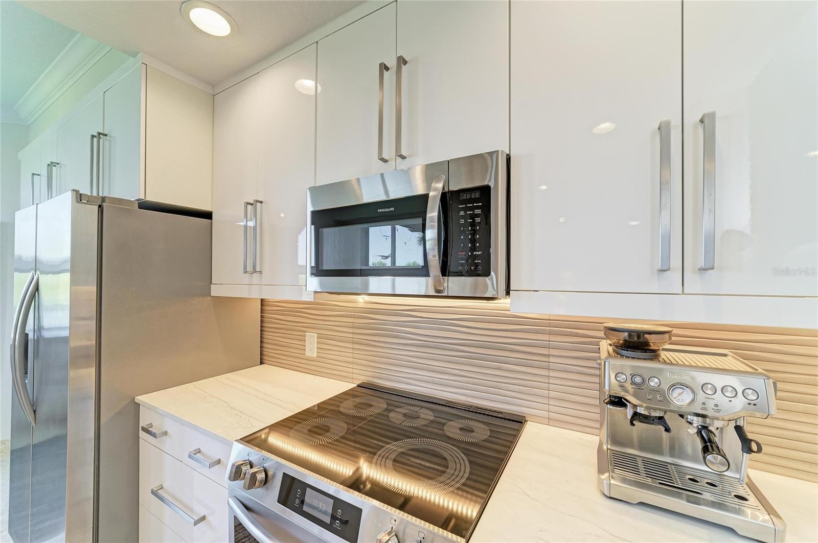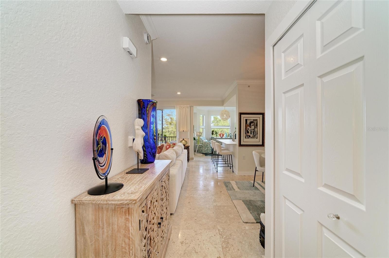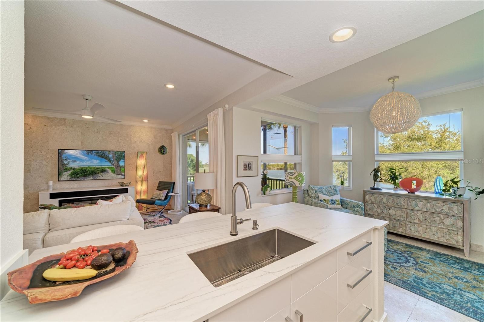Experience high-end luxury in this truly ONE-OF-A-KIND condominium at River Strand Golf & Country Club! With over $150,000 IN UPGRADES, this GOLF DEEDED residence is a standout showpiece filled with custom details throughout! A welcoming entryway features a striking built-in custom mirror, offering an elegant first impression. Inside, the main living space showcases gorgeous travertine flooring throughout, an artistic feature wall and an electric fireplace that adds warmth and style. The dining area is enhanced by an enclosed custom shelving unit, that extends floor to ceiling and wall to wall, blending beauty with everyday functionality. Designed for modern living, the light and bright OPEN CONCEPT LAYOUT flows into the kitchen, which boasts a custom backsplash, counter height matte dekton kitchen island which was expanded and redesigned and sleek European-style white lacquer cabinetry. Newer Frigidaire appliances (2024), and an added custom pantry provide exceptional storage and design. Sliding glass doors open to a private screened lanai, showcasing LONG PICTURESQUE WATER VIEWS and stunning tee-to-green golf course vistas. Stylish wall accents, contemporary lighting, custom fans and refined window treatments and blinds contribute to the home’s sophisticated ambiance. The main living area was painted (2025), laminate flooring and custom closets installed in both bedrooms (2026) and LG front loading washer and dryer were installed in 2024. The primary suite offers a serene retreat, complete with a redesigned en-suite bath featuring an elegant shower, modern mirror and smart floating vanity. The guest bedroom is equally impressive, paired with an updated bathroom to match the en suite that includes a custom mirror, vanity, and beautifully finished shower. Also including a storage room and assigned covered carport, this home truly is truly complete in every way and perfectly combines convenience and luxury. River Strand is a gated, resort-style community renowned for its 27 holes of pristine golf. The recently completed $9 million CLUBHOUSE RENOVATION has elevated the lifestyle experience, featuring a beautifully updated grille room and RESTAURANT, inviting outdoor dining area, and a new and expanded tiki bar with dining space. Residents enjoy an impressive array of amenities, including two main community pools and spas, six satellite pools, two fitness centers, and both tennis and pickleball courts. A full calendar of social events and fitness activities adds to the vibrant community atmosphere. Ideally located just minutes from I-75 and the new Marketplace with an expanding selection of dining and shopping options, and convenient access to the stunning Gulf Coast beaches too! Come and see this gorgeous home and this exceptional community, once you experience River Strand at it's best, you may never want to leave!