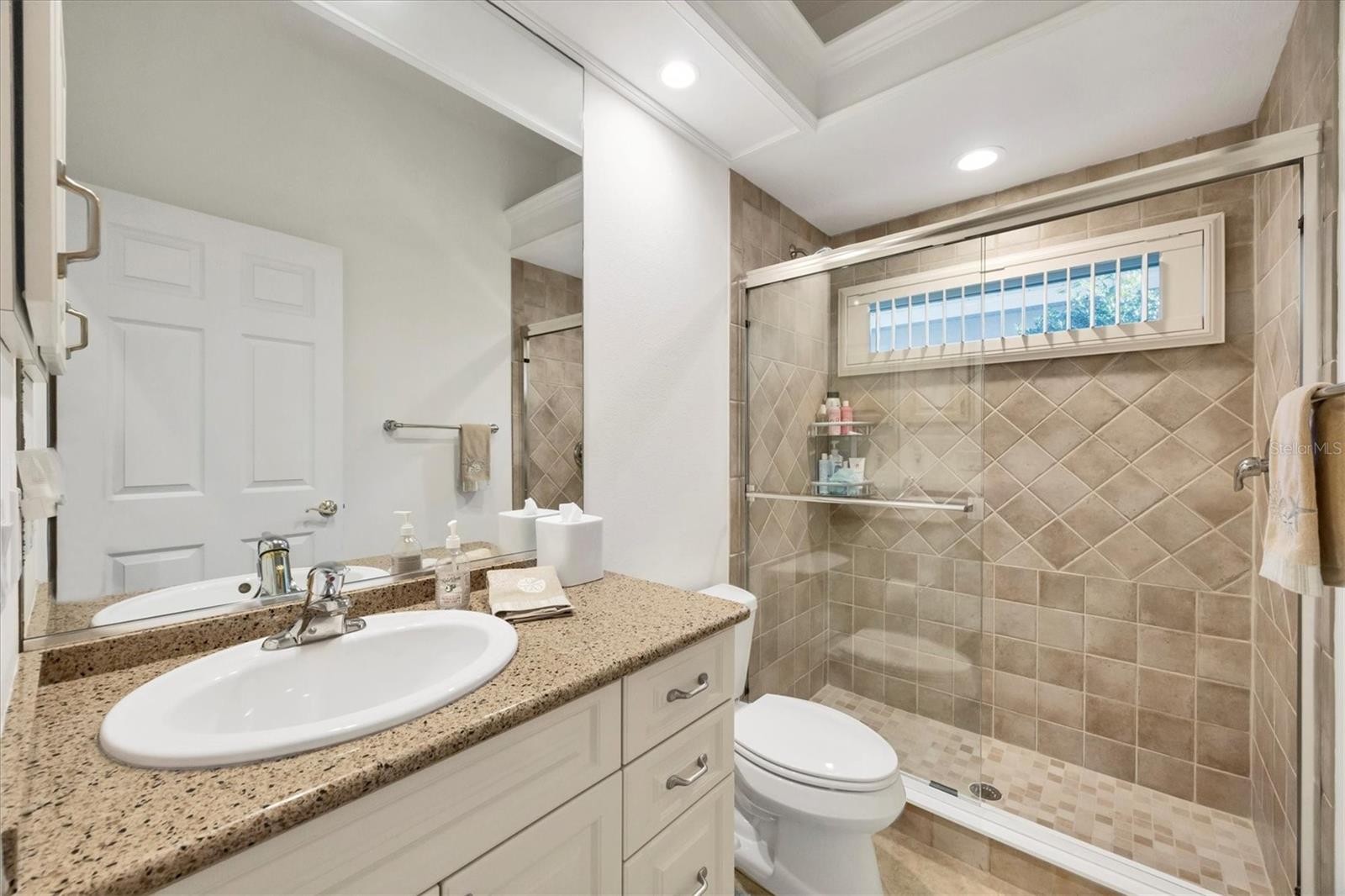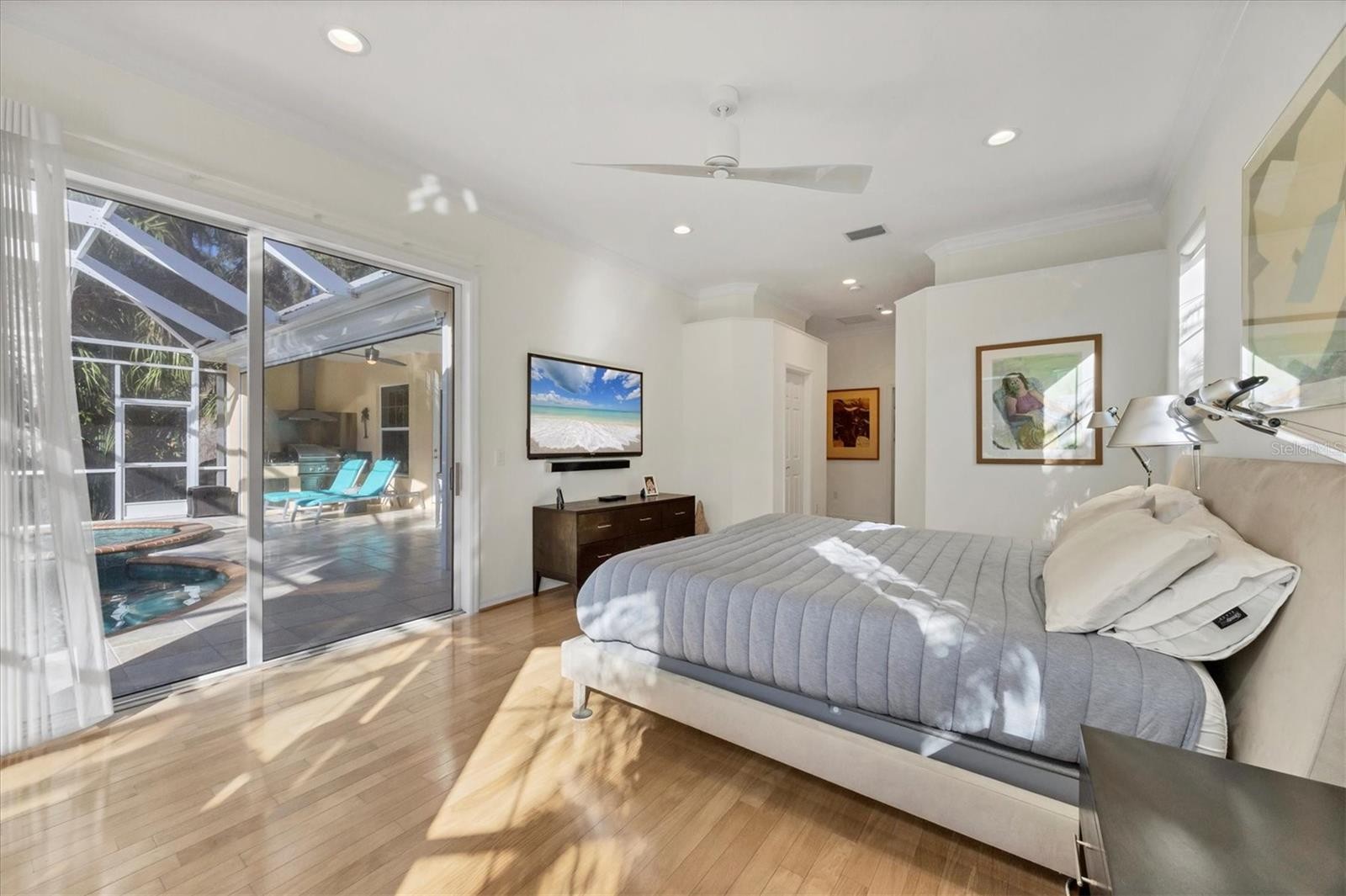Welcome to this beautifully maintained and updated 3-bedroom, 2.5-bath residence in the desirable Kenwood Park neighborhood, featuring its own community pool. Framed by lush tropical landscaping, a gracious foyer welcomes you into a bright, open-concept home with soaring ceilings, crown molding, neutral paint tones, modern recessed lighting, and ceiling fans throughout. Diagonal tile and hardwood flooring flow seamlessly through most of the home, enhancing the airy feel and private, tranquil views. The updated eat-in kitchen is both stylish and functional, offering antique white cabinetry—some with glass inserts—sleek quartz countertops, under-cabinet lighting, and stainless steel appliances. A raised breakfast bar, center island with wine refrigerator, built-in desk area, and direct access to the lanai make this kitchen ideal for everyday living and entertaining. The living room features accent lighting, a modern ceiling fan, and a striking gas fireplace set on a custom accent wall. Triple sliding doors create effortless indoor-outdoor living, opening to a private lanai retreat with an aqua-colored pool, relaxing hot tub with waterfall feature, and convenient half pool bath. The outdoor kitchen, complete with grill, burner, sink, and hood, is perfect for entertaining while enjoying serene tropical views. Tile pavers and an electric roll-down hurricane shutter complete this inviting space. The spacious primary suite includes hardwood flooring, a seating area, abundant windows, double sliders to the lanai, and two large walk-in closets. The updated ensuite bath is a true retreat, featuring a zero-entry shower, freestanding soaking tub, double vanity with makeup area, granite countertops, modern fixtures, and a private water closet. Two charming guest bedrooms offer hardwood flooring and ceiling fans, while the shared guest bath features a walk-in shower. The laundry room includes a sink, cabinetry, and a holding shelf for added convenience. The 2-car garage features a separate side golf cart door. Notable upgrades include a NEW whole-house generator (2025), Bermuda shutters in select rooms, and modern window shades throughout. Move-in ready, this home delivers the very best of Florida living in award winning University Park Country Club. Some furnishings are available for purchase. University Park Country Club is consistently ranked one of the top courses in Florida featuring 27 holes of championship golf; tennis and pickleball; fitness center, croquet – as well as an array of social and group activities. Just a 15-minute drive outside this peaceful enclave is downtown Sarasota, with shopping, arts & theatres, museums, dining and entertainment, top-ranked healthcare, beaches and SRQ International Airport. Two miles east of UPCC is the convenience of I-75, University Town Center with 300 nationally known and homegrown shops, restaurants, fitness studios, services and attractions, the Nate Benderson Park, home of world-class rowing events and the Mote Marine Aquarium. Enjoy the club amenities with the required minimum of a Social membership at UPCC, which is owned by the residents through a Recreation District. Dining room chandelier does not convey.