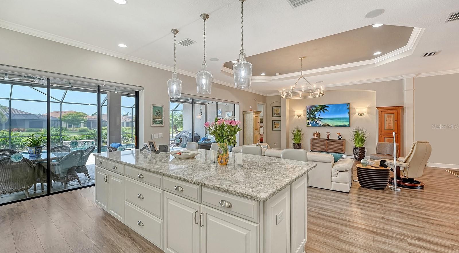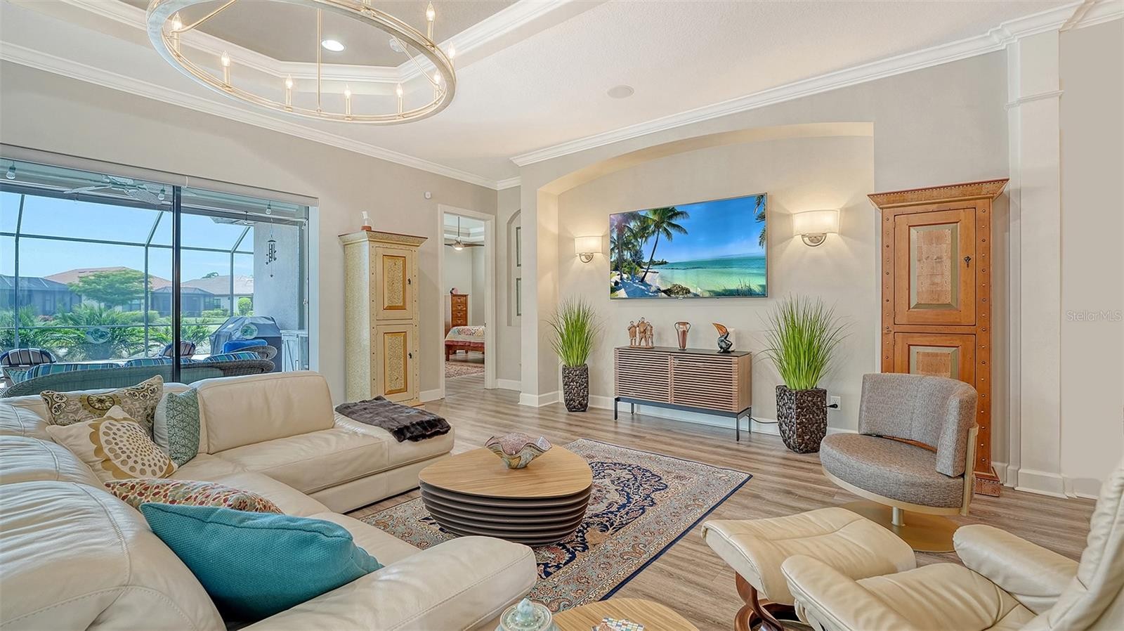 An Elegant Gem is the best way to describe this stunning 4-bedroom, 3-bath executive pool home in the boutique gated community of Cobblestone. As the largest and only 4-bedroom Pallazio floor plan currently available, this meticulously maintained residence offers over 3,200 sq. ft. of stylish, one-level living space with a grand double-door front entry. Situated on a wide waterfront lot with desirable southern exposure, you will enjoy breathtaking sunsets from your private oasis. This home is perfectly located on a quiet cul-de-sac with low taxes, offering the ultimate blend of privacy and convenience. Luxurious Interior Highlights: Spacious Living: 4 large bedrooms, 3 full baths, plus a dedicated den. Gourmet Kitchen: A beautiful white kitchen featuring an extra-large quartz island and premium stainless steel appliances, including a Bosch refrigerator and Bosch dishwasher. Designer Finishes: Captivating light-filled design with Level 5 wood-look laminate flooring, custom millwork, tray ceilings, and elegant crown moldings. Custom Details: High-end window coverings including white plantation shutters and roll-down shades, plus custom closets throughout for maximum organization. Included Extras: All flat-screen TVs, a brand-new washer and dryer, and an additional refrigerator/freezer in the garage are included. Outdoor & Tech Upgrades: Private Retreat: Custom heated saltwater pool with a brand-new pump and heater. Expansive Lanai: Travertine-tiled outdoor space featuring a built-in fire pit, oversized enclosure, and hurricane storm screens for peace of mind. Safety & Efficiency: Equipped with a WHOLE HOUSE GENERATOR, all HURRICANE-IMPACT RESISTANT WINDOWS AND DOORS, and a tankless water heater. Ample Parking: A 3-car tandem garage and widened driveway add functional luxury. Model-perfect and move-in ready—just unpack and enjoy! Cobblestone is an Esplanade community offering true resort-style living with a clubhouse, fitness center, pool with lap lanes, pickleball, playground for the kids and a full-time lifestyle manager.Just minutes from the Legacy Trail and Siesta Key Beach. Schedule your showing today to experience one of Sarasota’s most sought-after communities!
