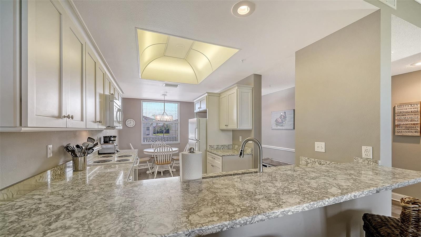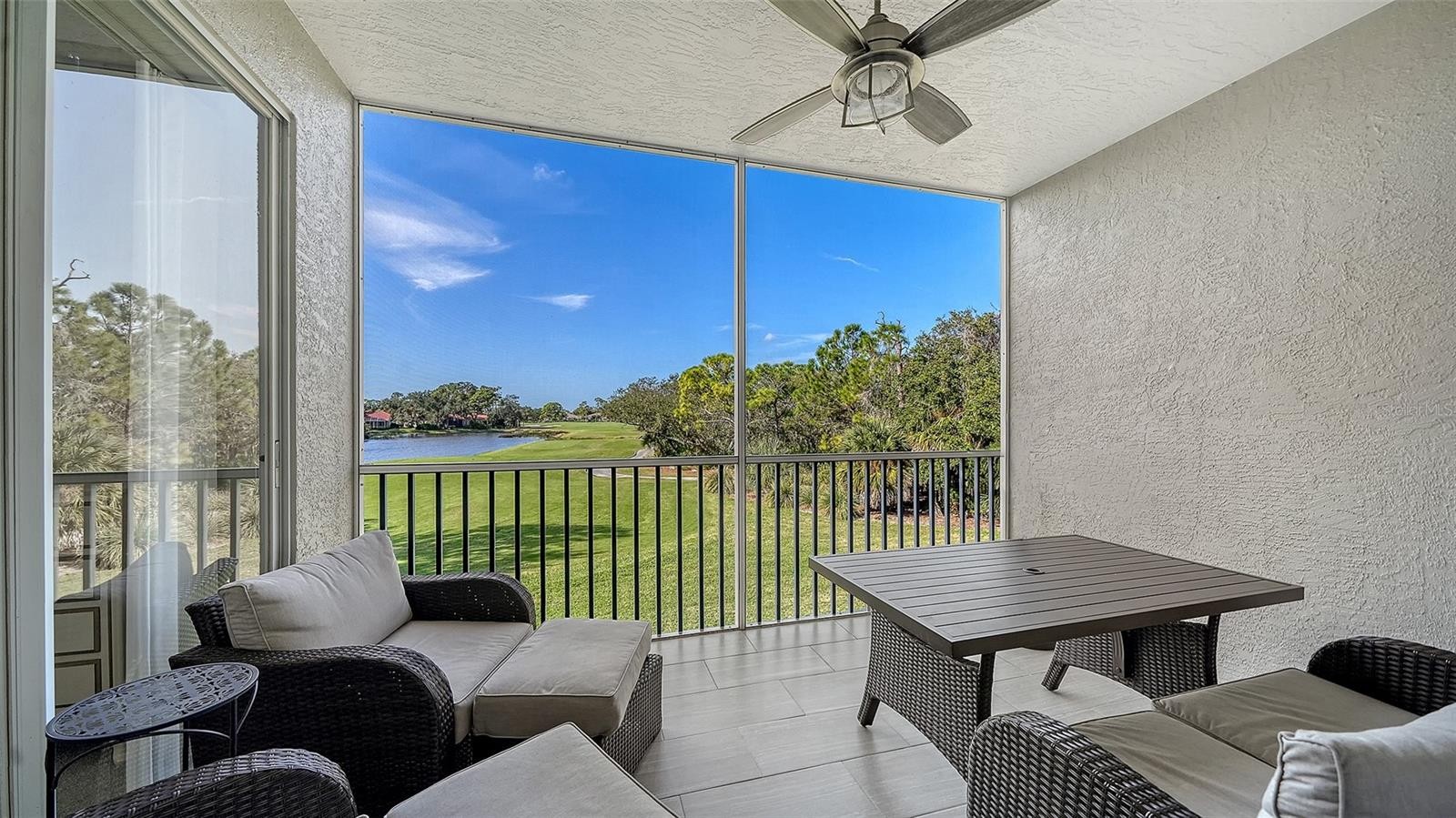 Turnkey Furnished Terraces condo with amazing views of the 9th hole lake and fairway! Great Florida Sunsets every night. Luxury vinyl flooring throughout the living spaces, updated Kitchen with quartz counters. Crown Molding in the living room. Primary has its own slider out to the lanai, walk-in closet and an modern shower to boot! Guest quarters in the front of the home, bedrooms have carpet. The Terraces have recently updated roof, elevators and paint. Great community pool, pickleball/tennis court and outdoor grills and gathering areas to enjoy this lovely condo group. Storage closet under the carports for each owner as well. A premier member-owned country club, Stoneybrook of Sarasota, is only a short distance from Siesta Key and offers easy access to shopping and borders the Legacy Trail. Ownership in Stoneybrook Golf and Country Club includes an updated clubhouse and restaurant, Har-Tru tennis facility, well-equipped fitness center and additional club pool and spa. Nestled between Downtown Sarasota and Downtown Venice. In 2024, the Golf Course went through a complete redesign and seller has paid the 2024 assessment in full.