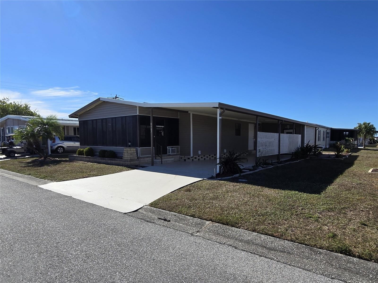 Located in the quiet 55+ cooperative community of Piney Point in Palmetto, Florida, this spacious home is ready for you to add your personal touches. Features include new vinyl siding installed in 2025, a metal roof added in 2022, and a carport that easily accommodates both a car and a golf cart. Inside, the spacious layout offers a large living room, a dining area with built-in storage, and a kitchen with an island that flow together seamlessly, in addition to a fully enclosed lanai with acrylic windows that provides another 200 square feet of additional living space. The primary bedroom includes an ensuite bathroom with a walk-in shower and walk-in closet, while the guest bedroom is conveniently located across from a full bathroom with a combination tub and shower. Additional features include a shed housing, the washer and dryer, a golf cart pad at the rear of the home, and an A/C system replaced in 2018. Nestled among friendly neighbors, this 2-bedroom, 2-bath home is part of an active community with a full social calendar and recreational amenities including a heated pool, billiards, and shuffleboard. The low monthly HOA fee of $300 includes internet, cable TV, water, sewer, lawn care, trash and recycling. Ideally located for easy access to I-275 & I-75 to St. Pete, Clearwater, Tampa, Sarasota, Lakewood Ranch, beaches, shopping and dining offering an excellent opportunity to enjoy Florida living.