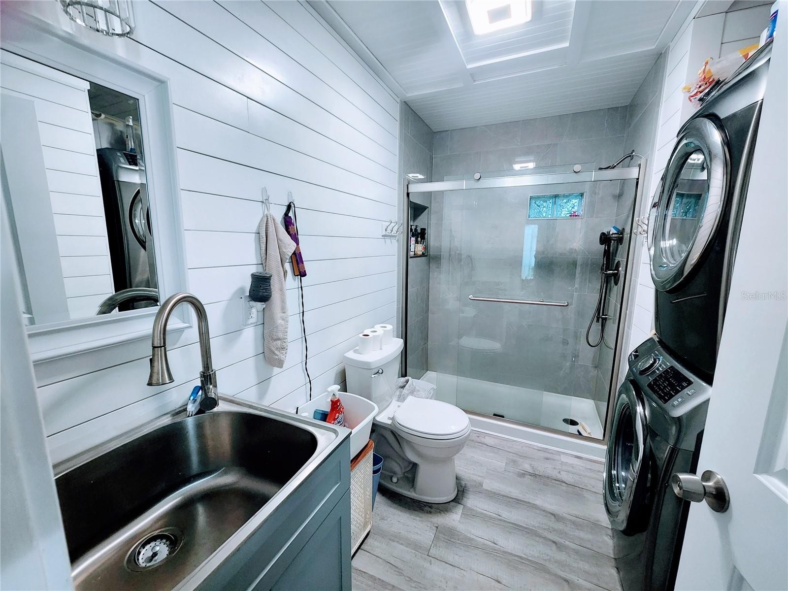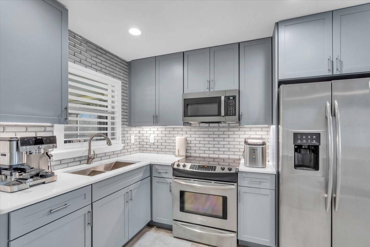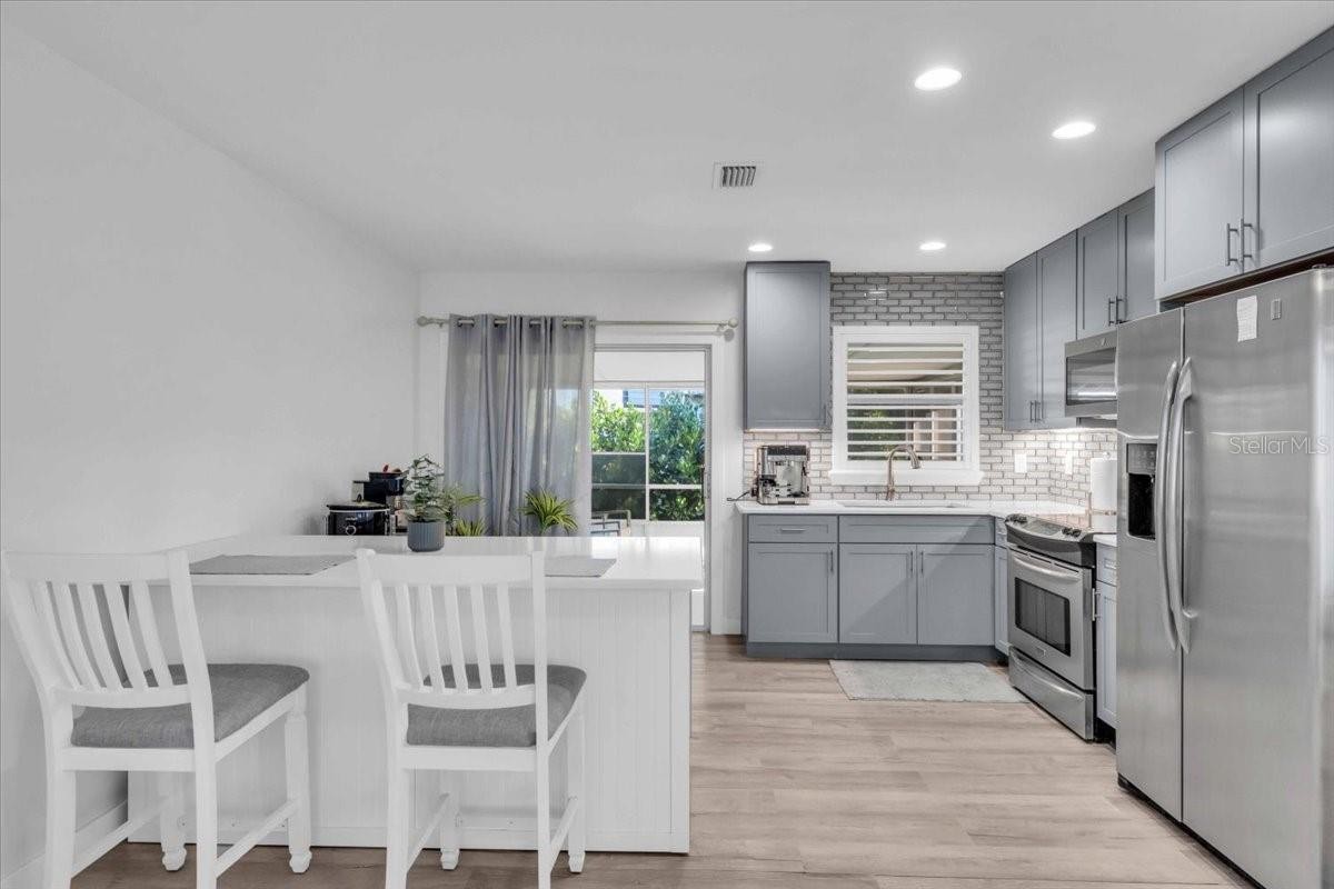 This single-family residence has been extensively renovated and is situated within a small, age-restricted community for individuals aged 55 and older. The homeowners association (HOA) fee of $80 a month includes select exterior maintenance services such as lawn care, roof cleaning and painting, and upkeep of the private road. The residence features an open floor plan with new flooring, shiplap walls, updated lighting fixtures, and ceiling fans throughout. The eat-in kitchen is equipped with stainless steel appliances, new cabinetry, solid surface countertops, and a tile backsplash that extends to the ceiling. The home contains two updated bathrooms and an oversized, stackable stainless steel washer and dryer located within the unit. Several windows have been replaced with impact-resistant models, and the front door has also been upgraded with an insulated door. Bedroom closets are fitted with barn-style doors, and all windows are furnished with drapes. The furnishings in the home including the bedding are also new. The furnishings are optional. Recent renovations include a new kitchen, solid surface countertops, windows and new flooring throughout the residence. The wall separating the kitchen and living room has been removed to create an open layout. Additional improvements comprise of new windows, updated plumbing and electrical, and in 2022 the air conditioning (HVAC) system, new interior doors, wood trim, and an insulated front door with nice glass front and password access. Conveniently located near shopping and restaurants. It is approximately 5 min to Warm Mineral Springs, 20 min to Englewood Beach, and under a half hour to Downtown Venice, Venice Beach, Sharky's, the Venice Fishing Pier and Dog Beach.