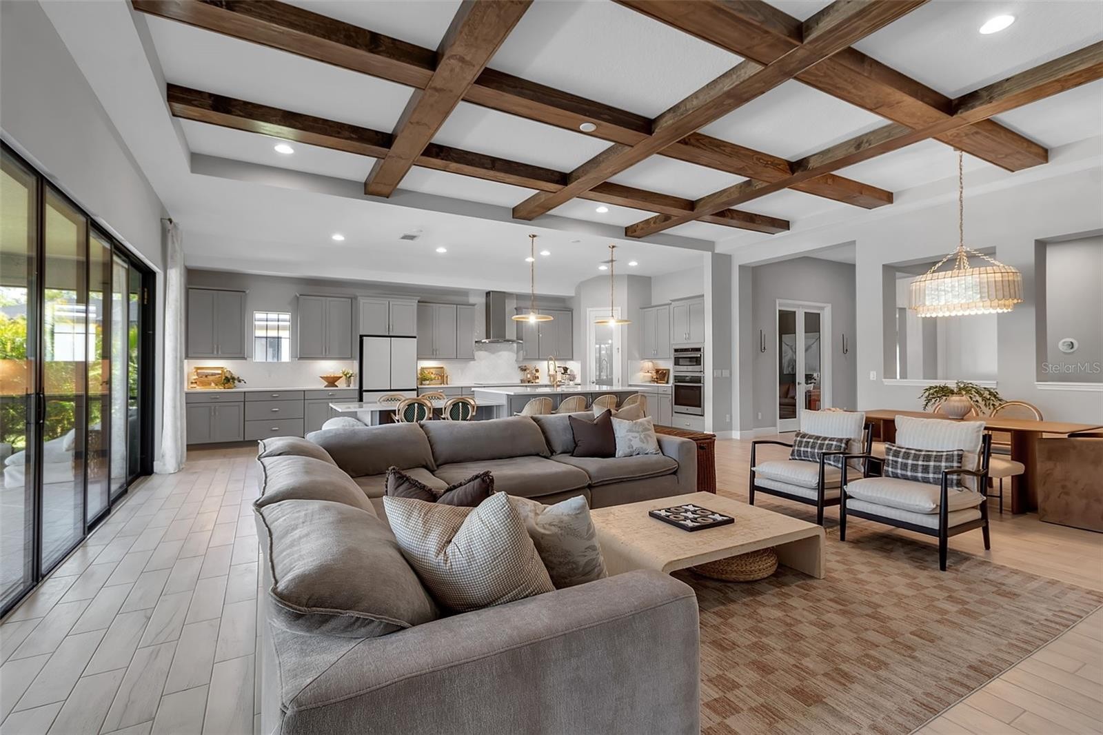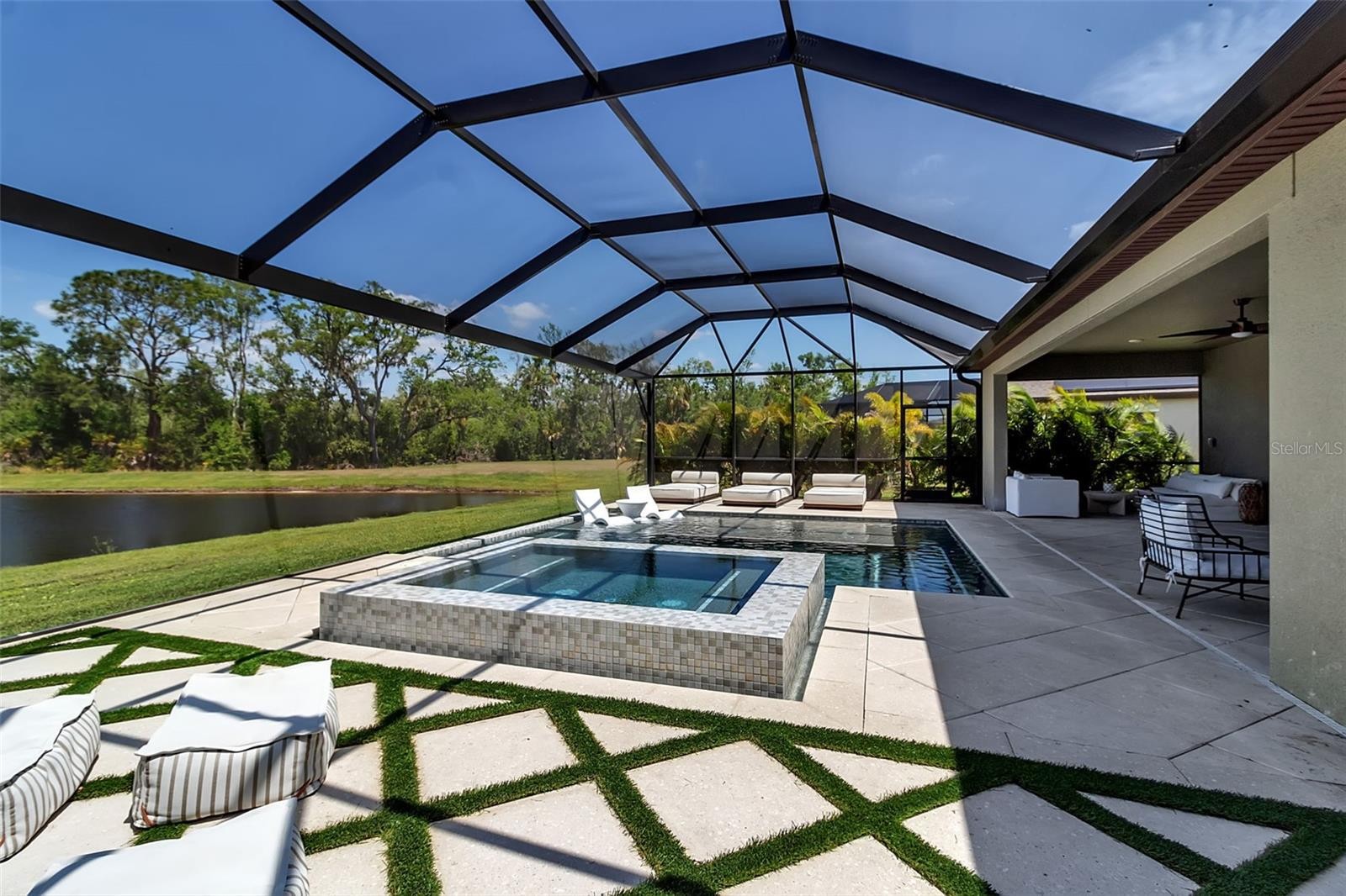 Prime waterfront lot surrounded by conservation in the highly sought-after North River Ranch community. This Homes by WestBay floorplan offers 4 bedrooms, 4 bathrooms, a 3-car garage, and 3,172 square feet of spacious, open-concept living. Enter through elegant double glass doors into an extra-wide foyer—just down the hall are a set of glass french doors that open to a sun-filled flex room, ideal for an office, den, or formal dining room. At the center of the home, the great room features a stunning 12-foot tray ceiling with custom wood beams and flows seamlessly into the deluxe kitchen and dining area. Expansive 24-foot glass sliders open to the extended covered lanai, creating the perfect indoor-outdoor living experience. Step outside to a custom-built pool with an oversized sunshelf, infinity-edge spa, and deep-end bench seating, all framed by Shellock pavers in a diamond pattern, turf accents, and a screened cage with a 50-foot clearview screen overlooking serene pond and conservation views. The first floor includes 3 bedrooms, thoughtfully placed in separate corners of the home for added privacy, along with 3 bathrooms. The private primary suite is located in the back corner and features abundant natural light, two walk-in closets, direct lanai access, and a luxurious en-suite bath with dual vanities, a makeup counter, garden tub, separate shower with glass door, bench, rainfall showerhead, secondary showerhead, private water closet, and large linen closet. Upstairs, you’ll find an oversized bonus room, an additional bedroom, and a full bathroom. The first-floor laundry room leads to the 3-car garage, which has been upgraded with epoxy floors. Residents of North River Ranch enjoy access to exceptional amenities, including nature trails, a resort-style pool, a bike-share program, a dog park, a fitness center, a screened game room, pickleball courts, a bike park, and the new Camp Creek area with a café, social gathering space, workspaces, and a beach-entry pool with water slides. Come tour this beautiful move-in-ready home and experience the views, space, and lifestyle for yourself.
