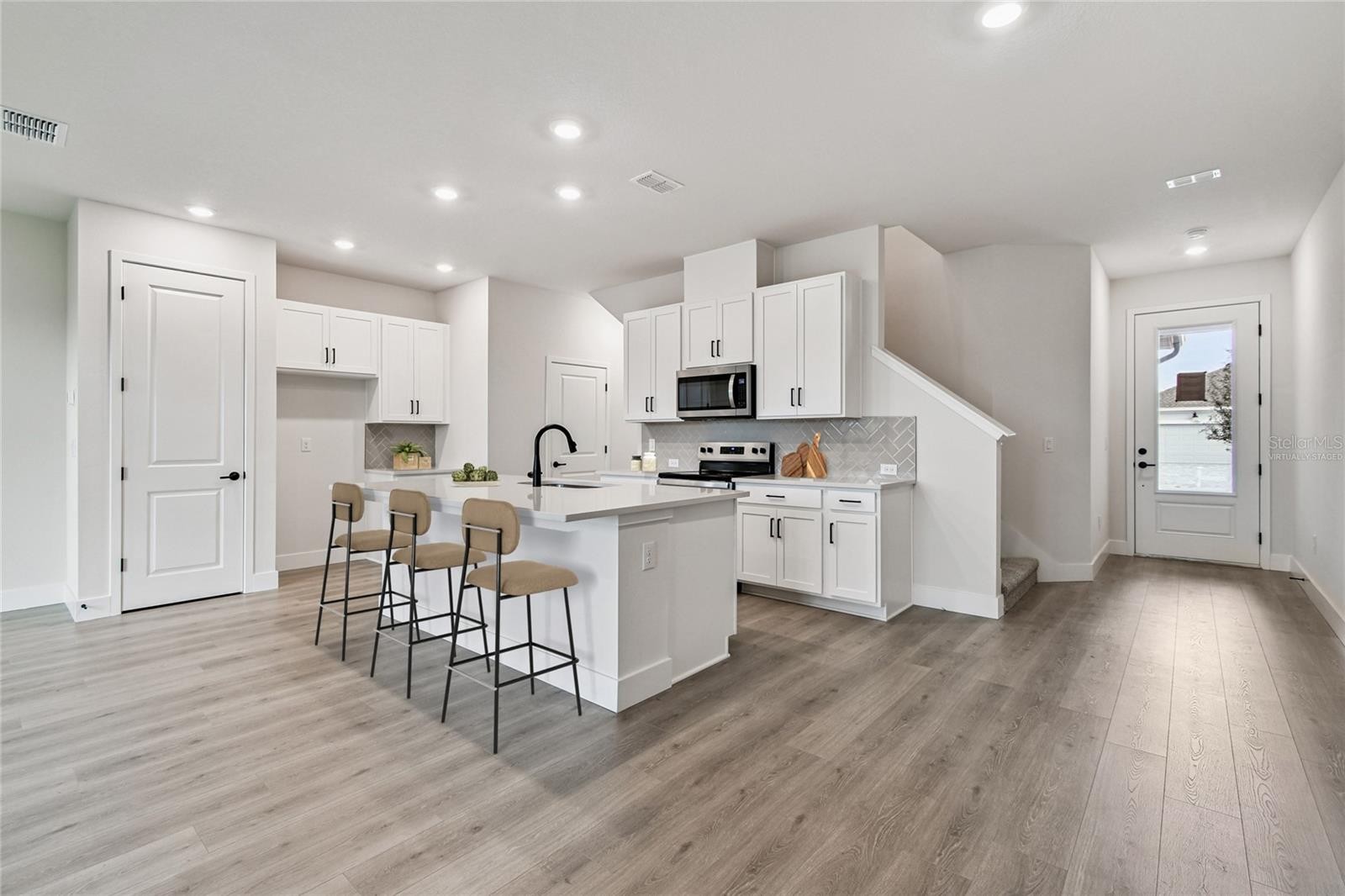 Under Construction. Introducing the Seastone, an elegant 1,828 square foot end-unit townhome that offers both style and functionality with 3 bedrooms, 2.5 baths, and a spacious 2-car garage. From the moment you arrive, the curb appeal is undeniable with a paver driveway and walkway leading to dual entries—one through the side front door and another through the garage. Step inside to a bright, open-concept main floor that welcomes you with clear sightlines throughout the living, dining, and kitchen areas—perfect for entertaining or relaxing with family. The kitchen is a chef’s dream, featuring white shaker style cabinetry on two walls for generous storage,topped with New Carrara Marmi lightly veined quartz countertops a walk-in pantry, and a strategically placed island with a flush breakfast bar that seats up to four. The gray hued tile backsplash ties it all together. A convenient powder room is located just off the kitchen for guests and everyday ease. Upstairs, a central loft provides a flexible living space while creating a natural separation between the secondary bedrooms and the owner’s suite. The two secondary bedrooms are positioned at the front of the home and share a full bathroom complete with a dual sink vanity and tub/shower combo—ideal for shared living. The owner’s suite is a private retreat, offering direct access to the laundry room and a generously sized walk-in closet with shelving on three sides. The en suite bathroom features a raised-height dual sink vanity, a glass-enclosed shower with water controls placed opposite the showerhead for convenient use, and a private water closet for added comfort. Oversized 17x17 gray tile flooring covers the main floor, providing a nice, neutral color palate. Built with sustainability in mind, the Seastone includes a hybrid hot water heater and boasts a HERS rating, showcasing its energy efficiency and commitment to reducing utility costs. Whether you're entertaining guests or enjoying a quiet night in, the Seastone offers the perfect balance of space, comfort, and thoughtful design—a place you'll be proud to call home. Photos, renderings and plans are for illustrative purposes only and should never be relied upon and may vary from the actual home. Pricing, dimensions and features can change at any time without notice or obligation. The photos are from a furnished model home and not the home offered for sale.