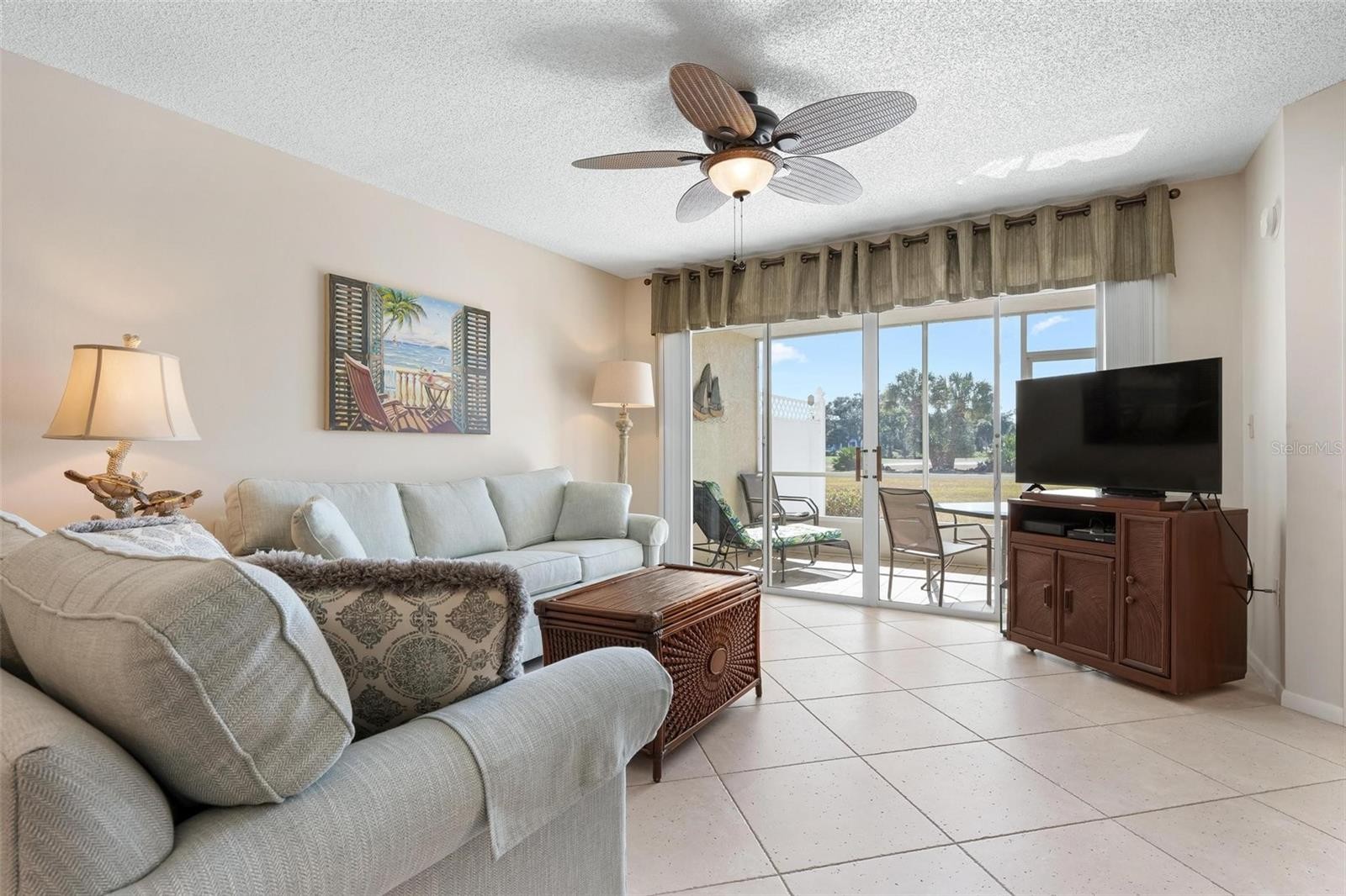 Immaculate and turnkey furnished, this desirable ground-floor Ninth Fairway residence welcomes you with sweeping golf and water views and a sunny southern exposure that fills the home with natural light all year long. A bright, open living area showcases diagonal-set porcelain tile and a wall of sliding glass doors that lead to a screened and covered balcony overlooking expansive fairway vistas and swaying palms—an ideal setting to enjoy Florida’s tropical breezes and tranquil surroundings. The well-updated interior features clean white cabinetry, granite countertops, and comes fully outfitted with furnishings, décor, and home goods, making this a true move-in-ready opportunity where all you need are your clothes and a toothbrush. Major updates include a new AC in 2021 and a roof replacement in 2018, offering peace of mind along with exceptional presentation. Just steps away, the heated community pool and clubhouse overlook the golf course and serve as a lively hub for residents, hosting card and table games, water aerobics, and regular social gatherings that make it easy to connect with neighbors and enjoy an active lifestyle. Optional membership at Plantation Golf & Country Club offers an array of resort-style amenities including two championship golf courses, pickleball, Har-Tru tennis, bocce, a fitness center, a resort pool, and multiple dining and social venues. Ideally located within 15 minutes of area beaches, the charm of historic downtown Venice, the energy of Wellen Park, and CoolToday Park, this residence places you close to shopping, dining, and year-round recreation. More than just a condo, this home delivers a true sense of well-being and effortless Florida living—perfectly positioned to enjoy its exceptional setting, tropical climate, and the relaxed elegance of life at The Plantation.