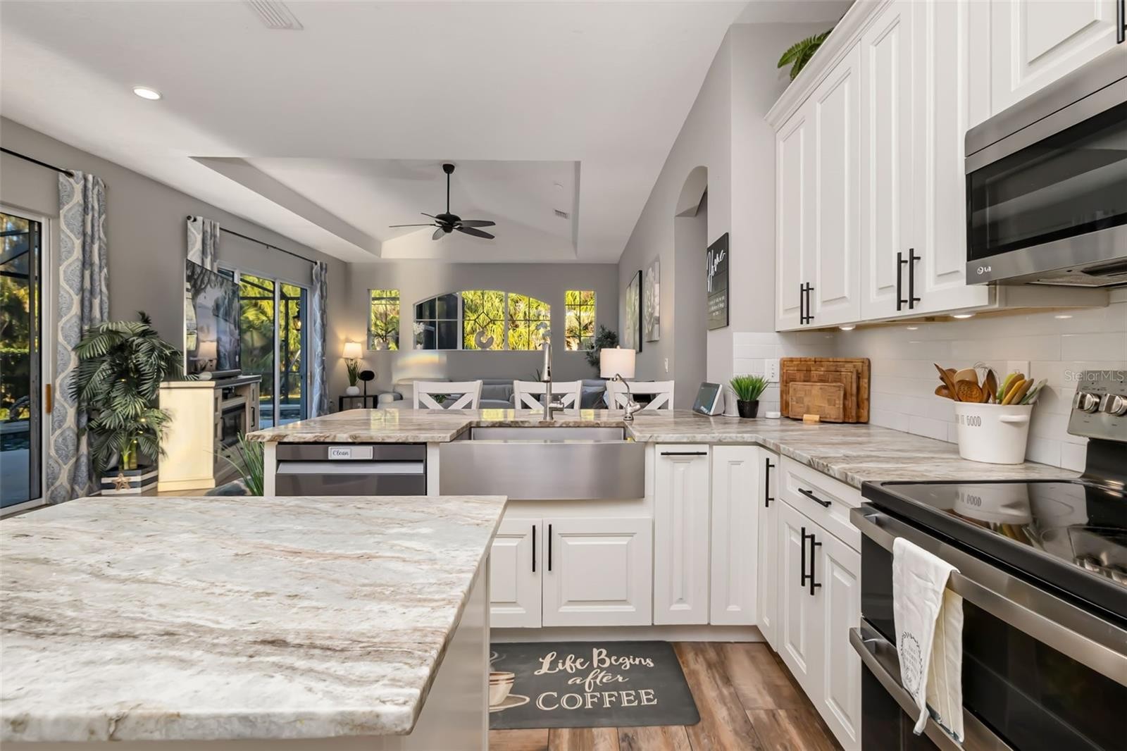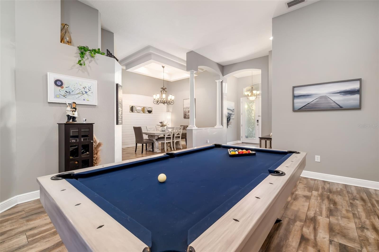 Set on more than one-third of an acre in sought-after Ancient Oaks, this spacious 4-bedroom plus den and bonus room (with closet), 3-bath pool home offers over 3,200 square feet of thoughtfully designed living space, and a 3-car garage. Timeless architectural details—including decorative moldings, columns, custom niches, and arched - transom windows—create a move-in-ready home filled with natural light. The kitchen opens seamlessly to the family room and features a center island, breakfast bar, pantry, and newly installed double oven and dishwasher, ideal for everyday living and entertaining. The primary suite serves as a relaxing retreat with dual walk-in closets, dual vanities, a garden tub, and separate shower. Multiple sliding doors throughout the home create a seamless connection between indoor and outdoor living spaces—perfect for entertaining or relaxing poolside. The screened lanai showcases a tranquil waterfall feature overlooking a natural preserve, and the fully fenced yard enhances privacy and outdoor enjoyment. Additional features/updates include a built-in sound system in the living room, dining room, and back patio - whole-house reverse osmosis system and water softener - solar panels - newly resurfaced pool deck and pool equipment - new carpet and beautiful plank tile throughout the home. Conveniently located near I-75, top-rated schools, golf courses, shopping, dining, medical facilities, and the expanding Parrish community with exciting new parks and retail.