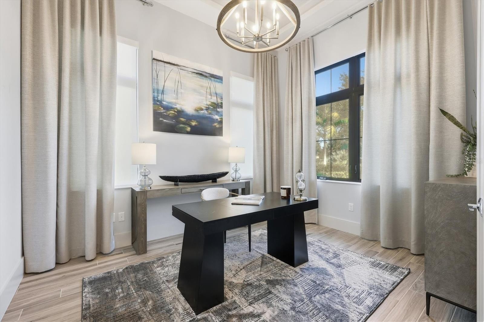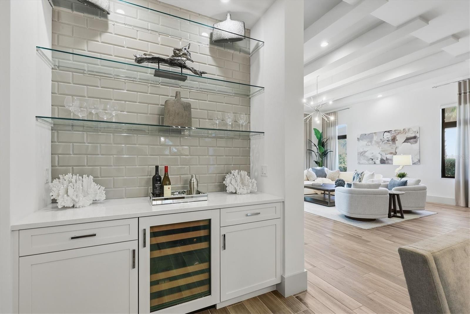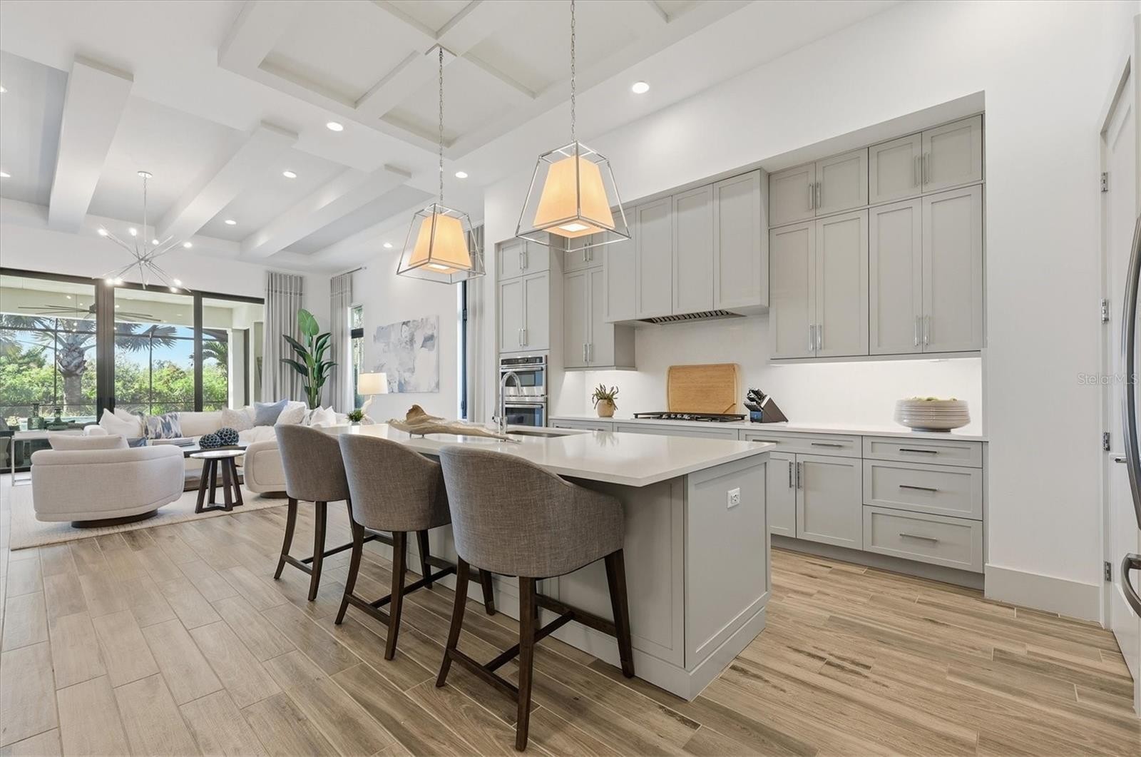 Welcome to an exceptional turnkey furnished retreat in the exclusive Founders Club, where refined luxury meets serene Florida living. This impeccably maintained former London Bay model residence offers timeless design enhanced by contemporary upgrades. Set against a tranquil preserve backdrop the home enjoys privacy and picturesque natural views. Striking curb appeal and manicured landscaping introduce a thoughtfully designed contemporary interior with a desirable open floor plan. Elegant finishes include porcelain wood-look plank tile flooring, tall baseboards, detailed ceilings, and curated designer lighting throughout. The expansive great room is highlighted by a modern beam ceiling, custom textured feature wall, designer window treatments, and center opening impact sliding glass doors that seamlessly connect indoor and outdoor living. Entertain effortlessly on the paver lanai featuring a spacious covered area, fully equipped outdoor kitchen with grill and beverage refrigerator, and a sparkling saltwater pool and spa complete with sun shelf and mosaic tile accents. The lushly landscaped backyard, enhanced by ambient lighting, creates a stunning setting for relaxing. At the heart of the home, the contemporary kitchen offers generous gathering space around a large central island and showcases pristine model level finishes. Highlights include high end stainless steel appliance suite with gas cooktop, modern cabinetry with pot and pan drawers, quartz countertops, full height backsplash, walk in pantry, coffered ceiling detail, and designer pendant lighting. The open dining area features a statement chandelier and a stylish dry bar with glass shelving, wine refrigerator, and subway tile backsplash. The grand primary suite is a private sanctuary overlooking the lanai and preserve, offering custom dual walk-in closets. The spa-inspired primary bath features dual vanities, a freestanding soaking tub, and an expansive walk-in shower with frameless glass and custom pebble tile flooring. A versatile den with closet provides flexibility as a home office or additional bedroom, complemented by a nearby powder bath. Two guest suites are thoughtfully positioned to provide privacy, each offering a spacious closet and en-suite bathroom. Additional features include an air-conditioned three-car garage with epoxy flooring, custom cabinetry, and electric vehicle charger. The Founders Club offers an unparalleled lifestyle surrounded by 700 acres of natural Florida beauty. With just 262 homesites, this low-density enclave is designed for privacy and serenity. Residents enjoy access to a recreation center offering yoga and pilates classes, as well as Har-Tru tennis courts, pickleball, basketball, sand volleyball, and a kid's playground. Membership at the Founders Golf Club is optional offering both golf and social memberships. The renowned Robert Trent Jones Jr. golf course offers members easy tee times and is one of the only walkable courses in the region. Members enjoy a a grand Southern-style clubhouse, fine dining, a year-round social calendar, and a 24/7 fitness facility. It’s more than a home, it’s a lifestyle curated for those who appreciate understated luxury and quiet prestige. All just minutes from exquisite dining, shopping, and the vibrant art scene of downtown Sarasota, as well as Sarasota's incredible beaches.