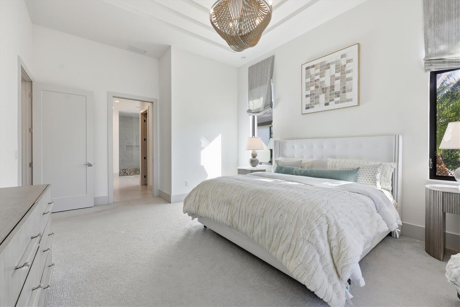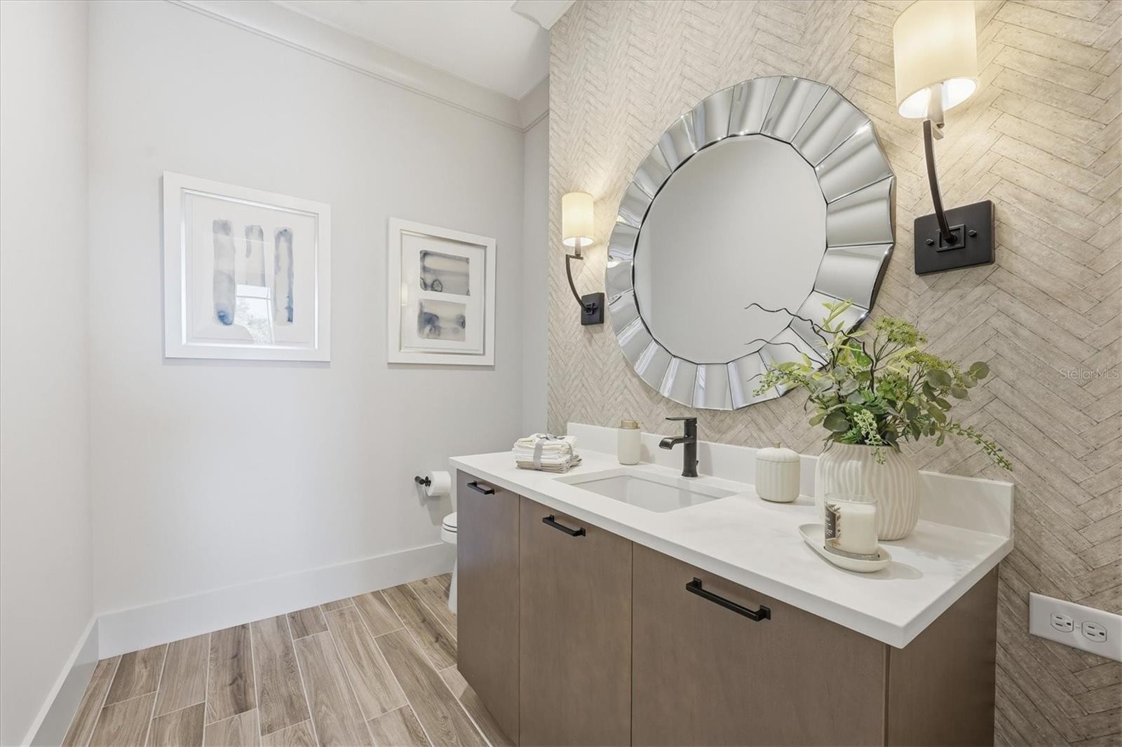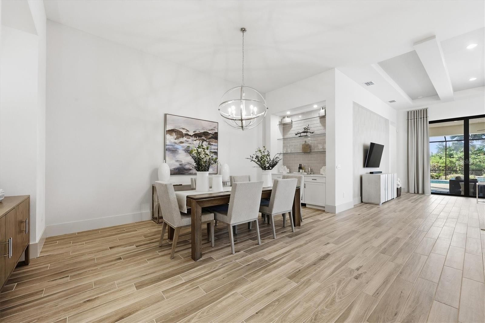 Welcome to an exceptional turnkey furnished retreat in the exclusive Founders Club, where refined luxury meets serene Florida living. This impeccably maintained former London Bay model residence offers timeless design enhanced by contemporary upgrades. Set against a tranquil preserve backdrop the home enjoys privacy and picturesque natural views. Striking curb appeal and manicured landscaping introduce a thoughtfully designed contemporary interior with a desirable open floor plan. Elegant finishes include porcelain wood-look plank tile flooring, tall baseboards, detailed ceilings, and curated designer lighting throughout. The expansive great room is highlighted by a modern beam ceiling, custom textured feature wall, designer window treatments, and center opening impact sliding glass doors that seamlessly connect indoor and outdoor living. Entertain effortlessly on the paver lanai featuring a spacious covered area, fully equipped outdoor kitchen with grill and beverage refrigerator, and a sparkling saltwater pool and spa complete with sun shelf and mosaic tile accents. The lushly landscaped backyard, enhanced by ambient lighting, creates a stunning setting for relaxing. At the heart of the home, the contemporary kitchen offers generous gathering space around a large central island and showcases pristine model level finishes. Highlights include high end stainless steel appliance suite with gas cooktop, modern cabinetry with pot and pan drawers, quartz countertops, full height backsplash, walk in pantry, coffered ceiling detail, and designer pendant lighting. The open dining area features a statement chandelier and a stylish dry bar with glass shelving, wine refrigerator, and subway tile backsplash. The grand primary suite is a private sanctuary overlooking the lanai and preserve, offering custom dual walk-in closets. The spa-inspired primary bath features dual vanities, a freestanding soaking tub, and an expansive walk-in shower with frameless glass and custom pebble tile flooring. A versatile den with closet provides flexibility as a home office or additional bedroom, complemented by a nearby powder bath. Two guest suites are thoughtfully positioned to provide privacy, each offering a spacious closet and en-suite bathroom. Additional features include an air-conditioned three-car garage with epoxy flooring, custom cabinetry, and electric vehicle charger. The Founders Club offers an unparalleled lifestyle surrounded by 700 acres of natural Florida beauty. With just 262 homesites, this low-density enclave is designed for privacy and serenity. Residents enjoy access to a recreation center offering yoga and pilates classes, as well as Har-Tru tennis courts, pickleball, basketball, sand volleyball, and a kid's playground. Membership at the Founders Golf Club is optional offering both golf and social memberships. The renowned Robert Trent Jones Jr. golf course offers members easy tee times and is one of the only walkable courses in the region. Members enjoy a a grand Southern-style clubhouse, fine dining, a year-round social calendar, and a 24/7 fitness facility. It’s more than a home, it’s a lifestyle curated for those who appreciate understated luxury and quiet prestige. All just minutes from exquisite dining, shopping, and the vibrant art scene of downtown Sarasota, as well as Sarasota's incredible beaches.