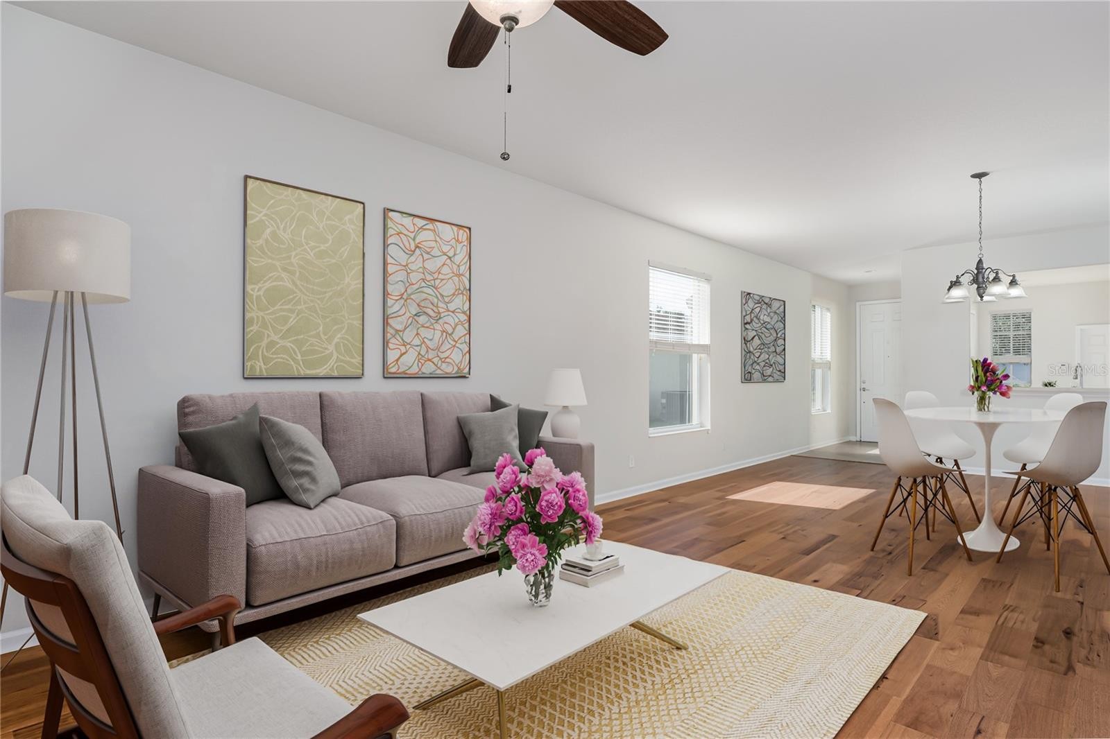 Welcome home to this charming 3-bedroom, 2-bath, almost 1,500 sq. ft. gem in the highly desirable community of Harrison Ranch—a true blend of comfort, convenience, and lifestyle. This beautifully maintained, move-in ready home has been lovingly cared for by its original owner and offers incredible value with low HOA fees and modest CDD costs. Step inside and instantly feel the warmth of solid wood flooring throughout—no carpet anywhere—paired with a light, inviting layout designed for easy living. Major updates give added peace of mind, including a newer roof, newer A/C, and hurricane shutters. One of the most impressive features of this home is the expansive post-build patio addition, creating a huge bonus space that’s perfect for hosting family gatherings, game nights, celebrations, or simply spreading out and relaxing. It’s the ultimate spot for entertaining! Outdoor lovers will appreciate being just steps from a scenic walking-trail entrance where residents enjoy peaceful strolls shaded by ancient oaks, watching birds and wildlife, and taking in serene pond views. Life in Harrison Ranch is all about community. Residents enjoy access to a 6,500 sq. ft. amenity center, a heated/cooled Jr. Olympic swimming pool, 24-hour fitness center, basketball court, lighted tennis and pickleball courts, multi-purpose sports field, two playgrounds, BBQ pavilion, and 5.5+ miles of gorgeous nature trails. Conveniently located near US-301 and I-75, you're just a short drive to Sarasota, Bradenton, Tampa, and St. Petersburg. The area continues to grow with two new hospitals and several new private and public schools planned. Plus, the world-famous beaches of Anna Maria Island, Siesta Key, and St. Pete are all within easy reach—perfect for weekend fun or hosting out-of-town guests. Access to TPA, PIE, and SRQ airports makes travel simple and convenient. This home offers the ideal blend of cozy living, wonderful community amenities, and a prime Parrish location. Don’t miss your chance to own a property that lives large, feels welcoming, and is ready for you to make it your own.