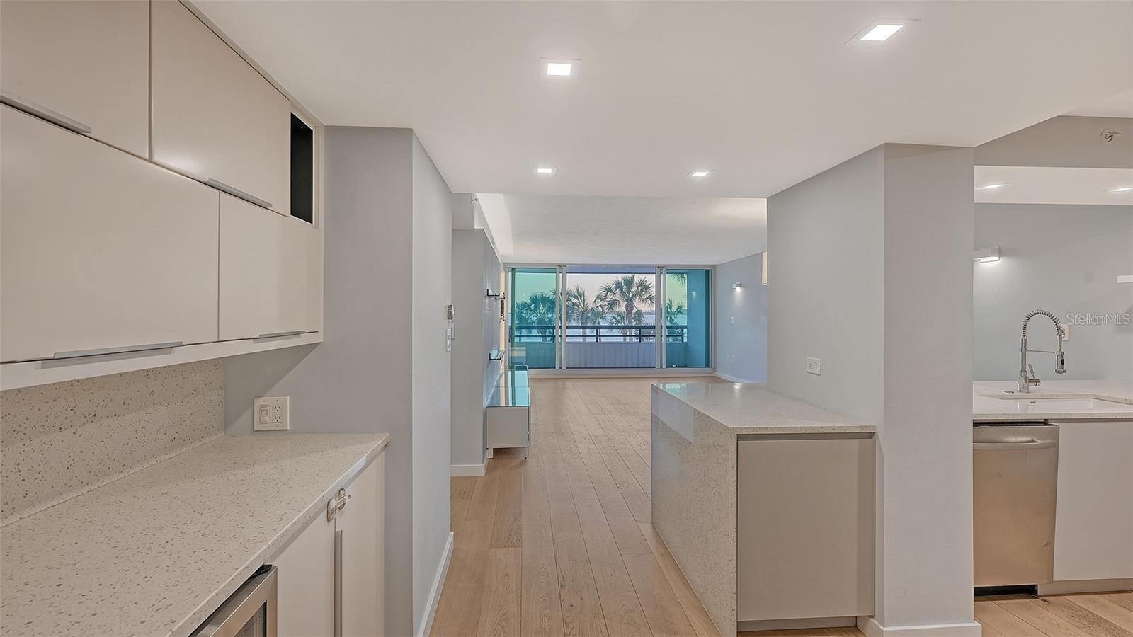 One or more photo(s) has been virtually staged. Direct Bayfront living in the heart of Sarasota at Condo on the Bay. This fully renovated 2 bed/2 bath residence features beautiful panoramic views of the Sarasota Bayfront with breathtaking sunsets over LBK and Ringling Bridge. Step into the inviting Great Room – greeted by a wall of impact glass floor-to-ceiling sliding doors that seamlessly blend the outdoors in, opening to a spacious balcony overlooking one of two residents pools, just steps from one of the long piers and boat slips. Interior features include White Oak engineered hardwood flooring flowing throughout the Main Living space, complemented by custom built-in cabinetry and a dry bar with a wine refrigerator for easy entertaining. A chef’s delight, the modern kitchen features Elite Woodwork of Sarasota Cabinetry, stainless steel appliances including an induction cooktop and built-in wall oven and microwave, quartz countertops, Walnut wood backsplash, built-in pantry, and breakfast bar for casual dining. A conveniently located laundry closet with full-size stackable front-loading washer and dryer completes the kitchen. A true oasis, the master suite has serene water views, remote controlled Hunter Douglas shades, and plenty of storage space with a large walk-in customized closet plus a full entry wall of built-in cabinetry. The updated en-suite bathroom features dual floating vanities, modern floor-to-ceiling tile, a walk-in shower with frameless glass enclosure and multiple shower heads. The generously sized secondary bedroom boasts double built-in closets and a secondary bathroom with a floating vanity, walk-in shower with a frameless glass enclosure, and a built-in linen closet. New Ruud A/C in March 2023. Set directly on Sarasota Bay, the highly sought after community offers a lifestyle of sophistication and serenity. A range of amenities include staffed 24-hour security gated guardhouse, “sky lobbies” located on a number of floors throughout, two resort-style pools overlooking the bay, two fitness centers, tennis courts, pickleball courts, concierge services and boat/kayak docks with a fishing pier. This pet-friendly Tower II residence includes one assigned under-building parking space with secure access and storage. Just steps away from Sarasota Bay Park and the vibrant culture and arts scene of Downtown Sarasota, world-class dining, shopping and entertainment. A short drive to St. Armand’s Circle and Lido Beach. Don’t wait – it is time to experience a luxurious urban life from the 3rd floor of Tower II, in the Bayfront heart of Downtown Sarasota!